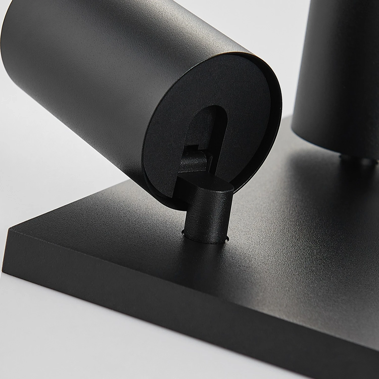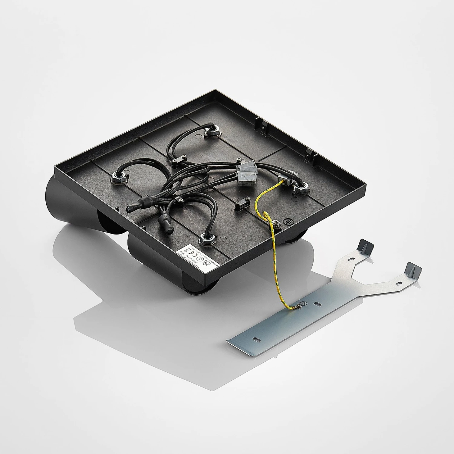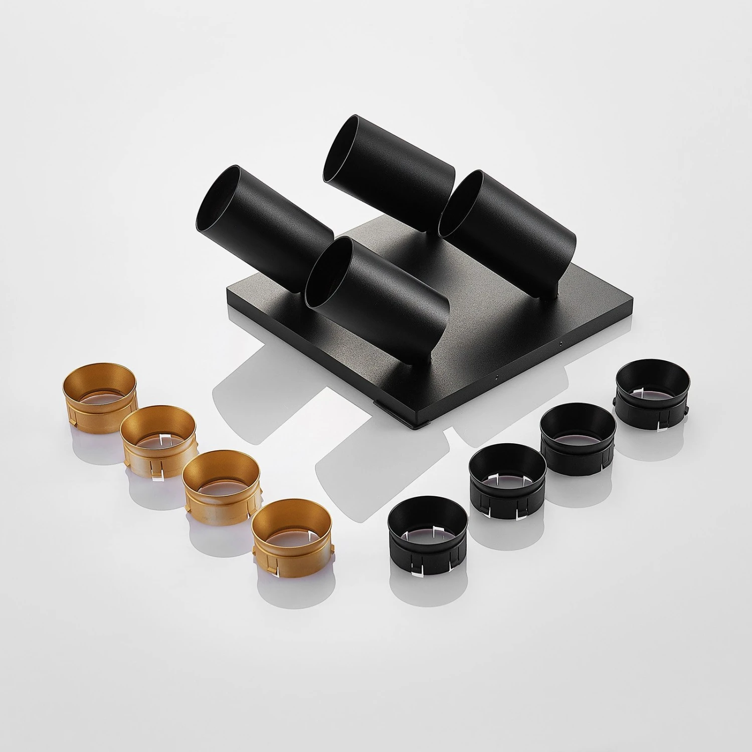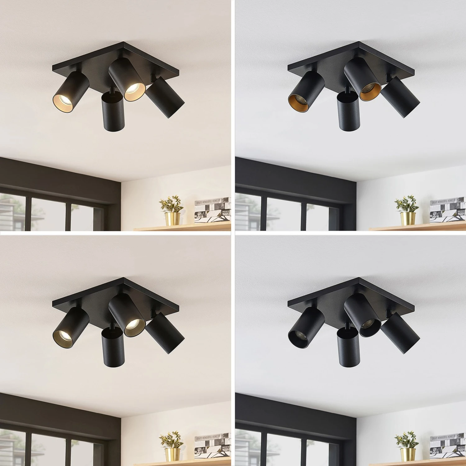 An jeder Ecke der quadratischen Halterung befindet sich ein zylindrischer Schirm, der sich bis zu 350 Grad schwenken beziehungsweise im 90-Grad-Winkel gen Boden drehen lässt, um alle Ecken des Raumes optimal auszuleuchten. Die durchgängig schwarze Farbgebung mit dem schimmernden Sand-Effekt der Leuchte bedient sich dabei dem klassischen Stil, jedoch mit dem gewissen Etwas.