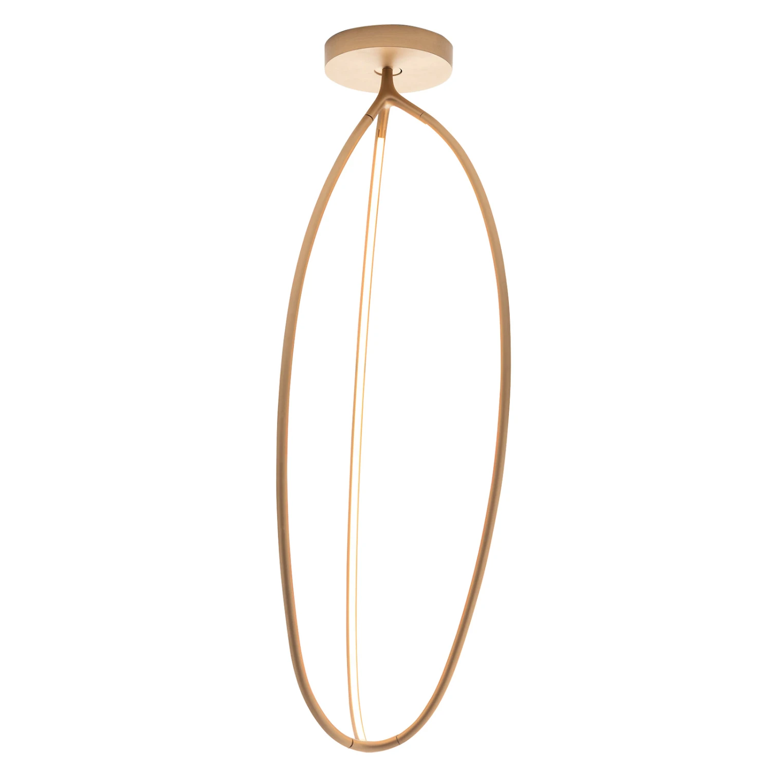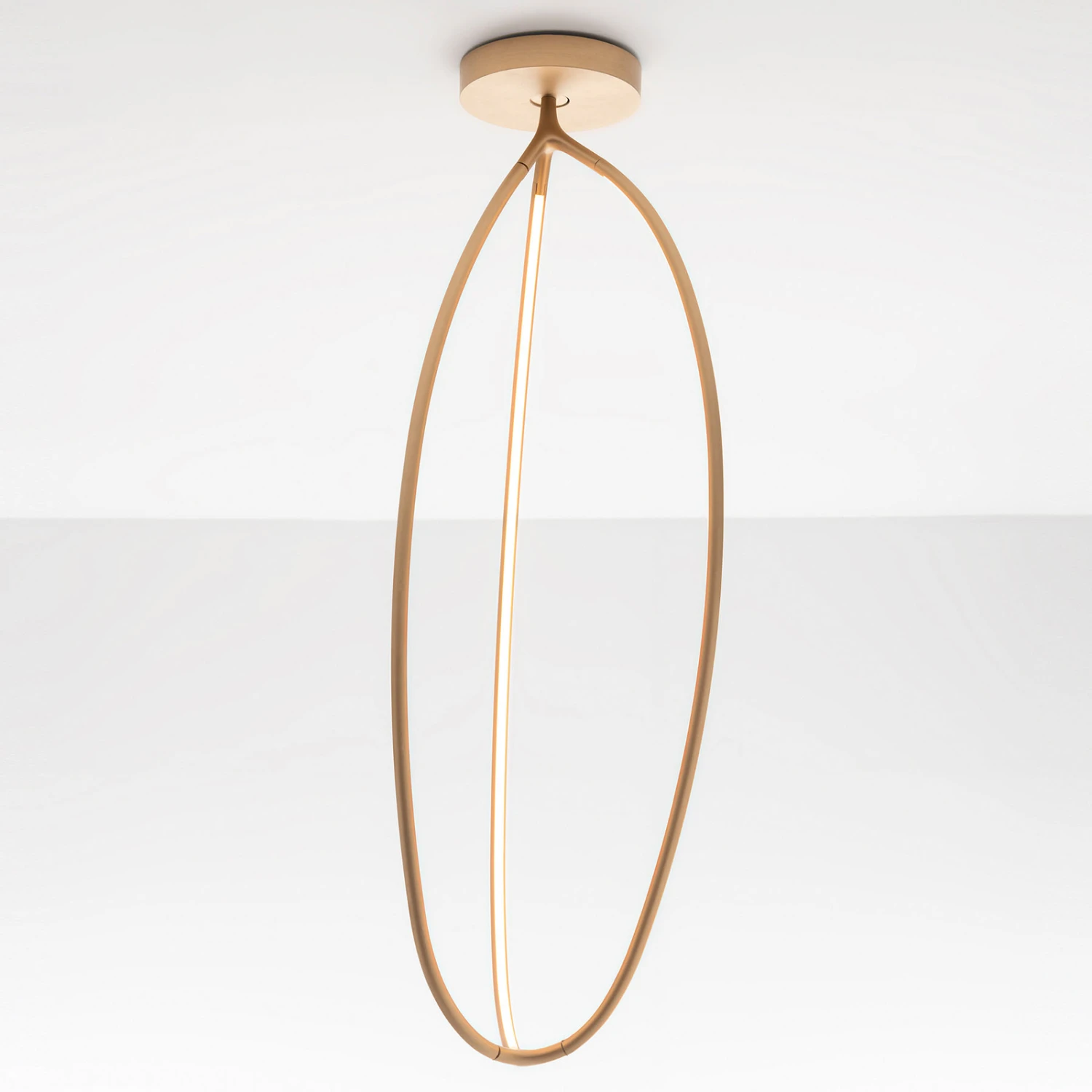 Ein absoluter Hingucker ist die LED-Deckenleuchte Arrival auch dann, wenn sie gerade einmal nicht eingeschaltet ist. Der Schirm besteht aus schmalen Aluminium-Profilen in Messing-Finish. In den Innenseiten ist jeweils ein Streifen mit warmweiß leuchtenden LEDs integriert. Arrival ist mit einem Bluetooth-Modul ausgestattet, sodass der das Regeln des Lichtoutputs sowie das Schalten mit der Artemide-App (kostenlos für Android und iOS verfügbar) erfolgen kann.
