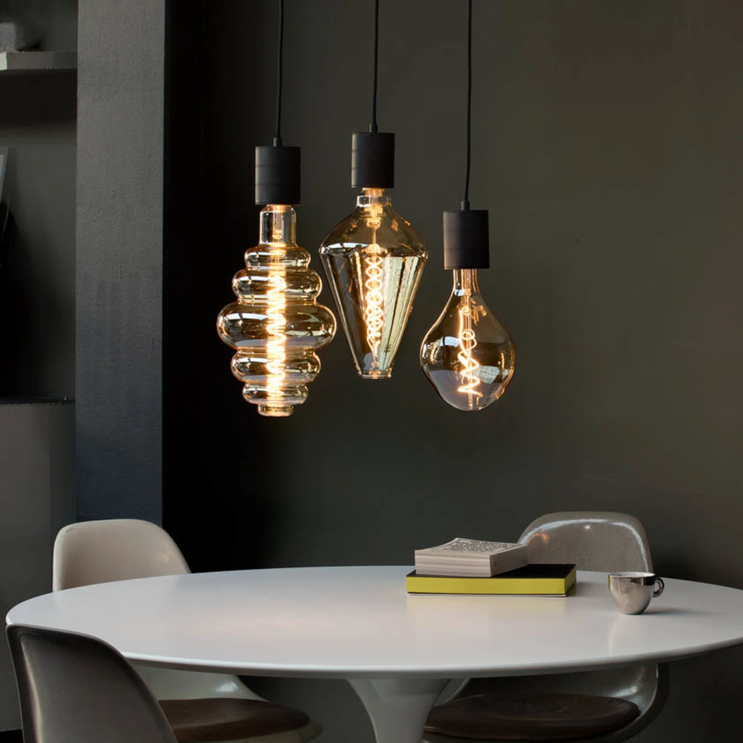 Extravagant in der Form und imposant in der Größe – diese LED-Lampe mit E27-Sockel ist ein Leuchtmittel, das sich hervorragend für den Einsatz in einer schirmlosen Hängeleuchte eignet, ob als einzelnes Exemplar oder zu mehreren Varianten eingesetzt.