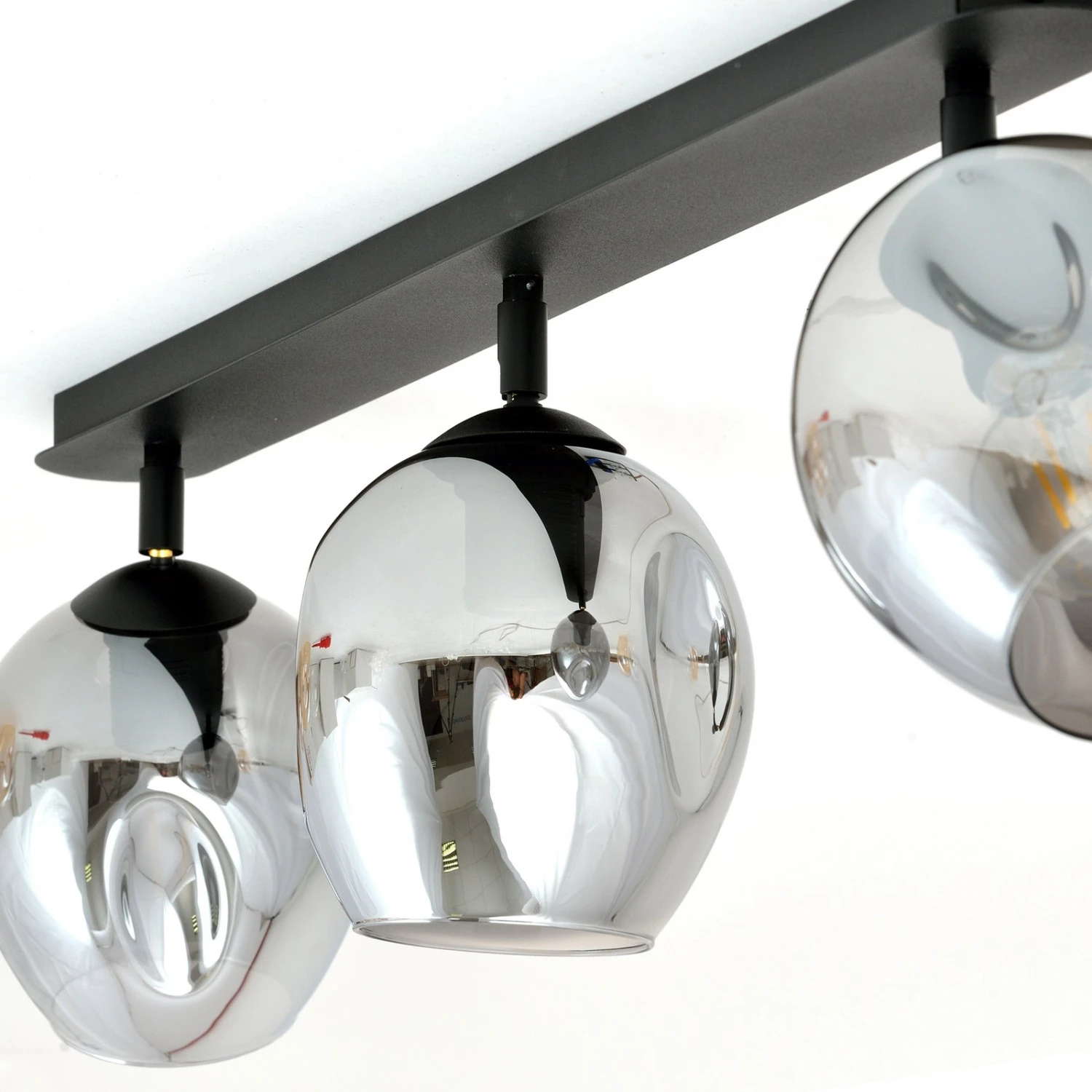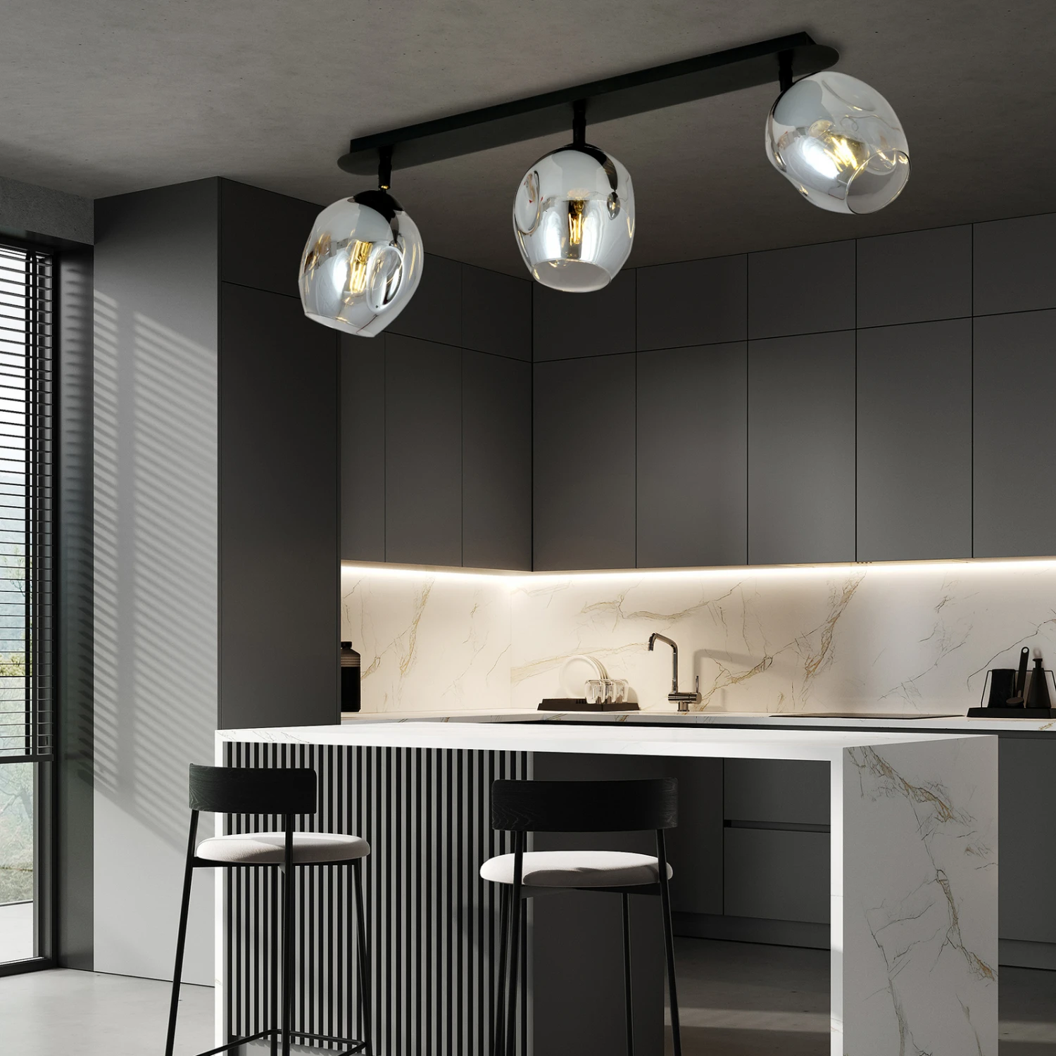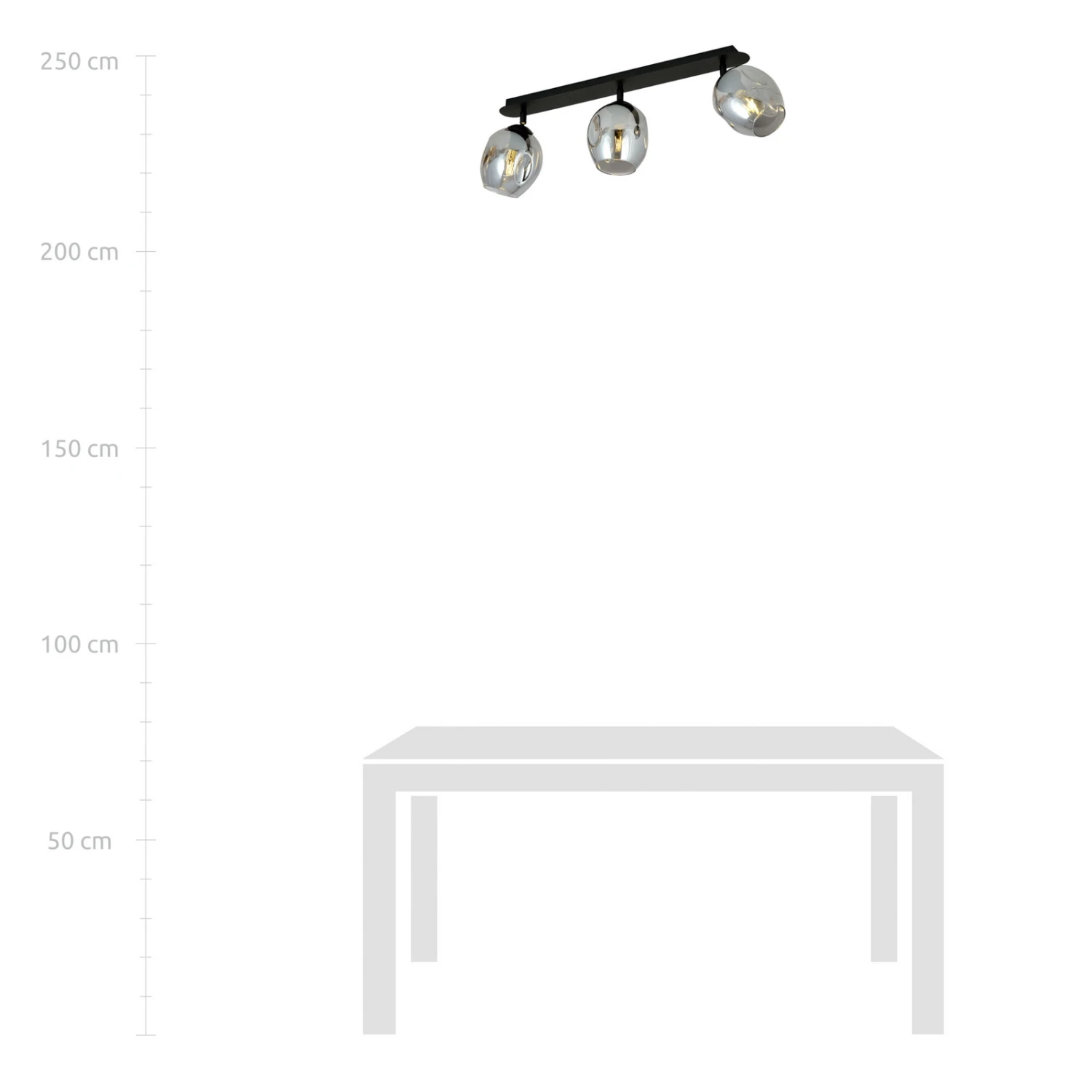 Drei Schirme aus Glas in Grafit gehen bei Flow 3 gleichmäßig von der schwarzen Deckenhalterung aus Metall ab. Sie können geschwenkt werden, wodurch es möglich wird, die Lichtausrichtung völlig individuell zu gestalten. Das Licht strahlt direkt nach unten durch die Öffnung im Schirm, wird aber dank der Durchsichtigkeit der Gläser auch rundherum abgestrahlt.
