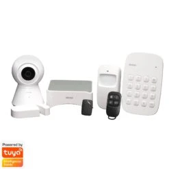 – Lieferumfang: 1 x Alarmzentrale, 1 x Indoor IP-Kamera, 1 x drahtloser PIR-Sensor, 1 x drahtloser Türsensor, 1 x Fernbedienung, 1 x passive RFID-Etiketten, 3 x Einbruchschutz-Aufkleber, 1 x Einbruchschutz-Warnschild