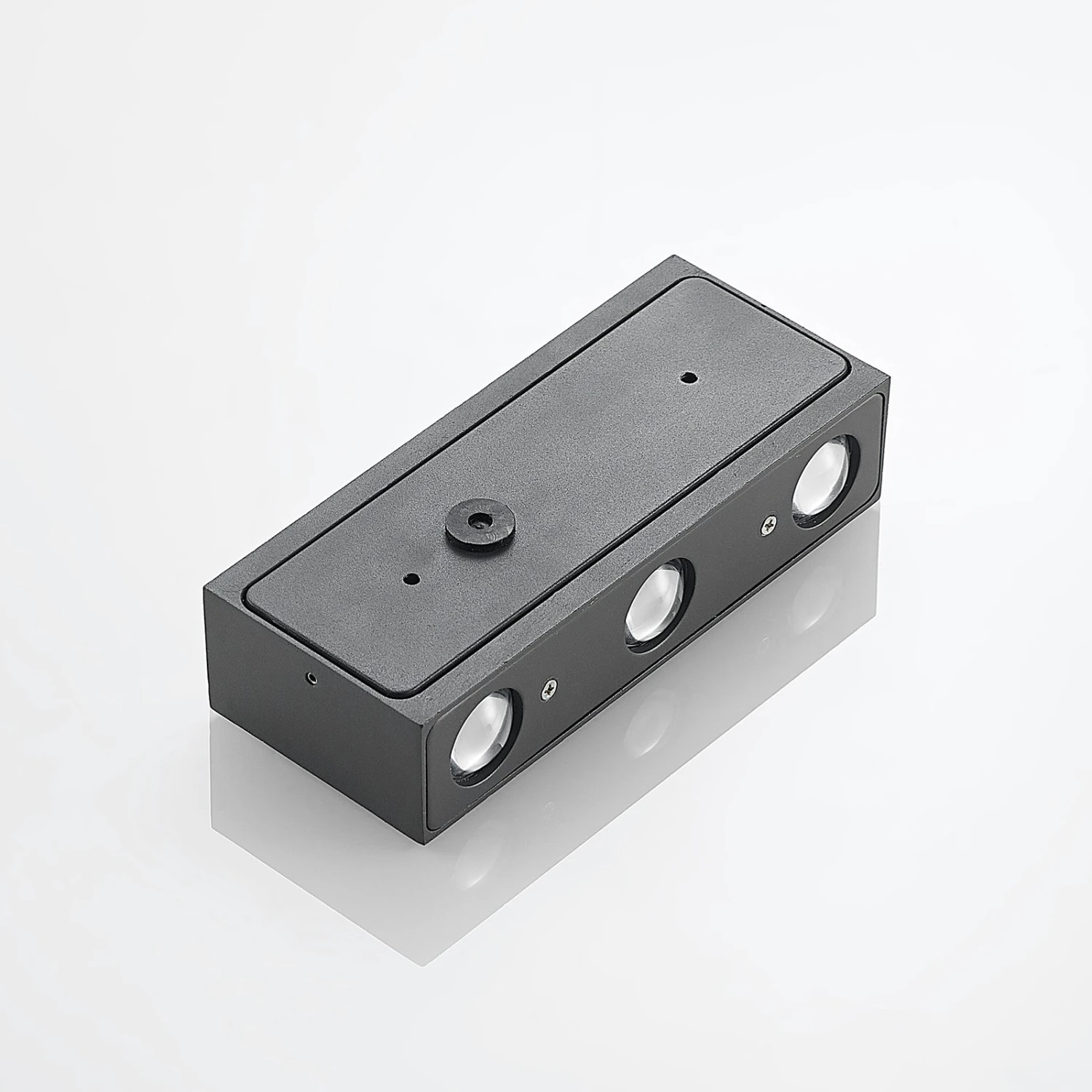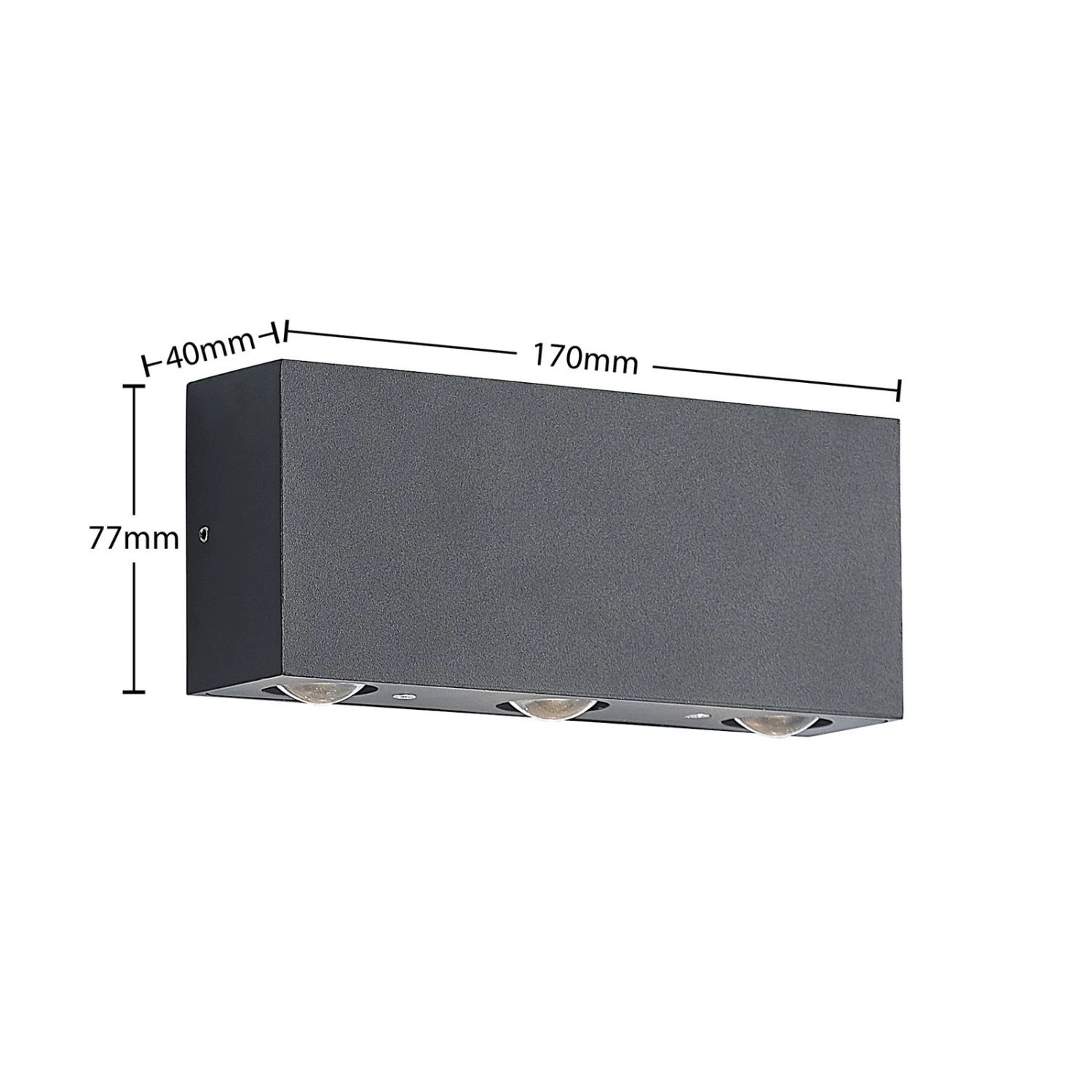Die LED-Außenwandleuchte Sarabi fällt auf mit ihrem markanten Look, der sich zum einen durch die klar strukturierte geometrische Form und zum anderen durch das markante Finish in Anthrazit definiert.