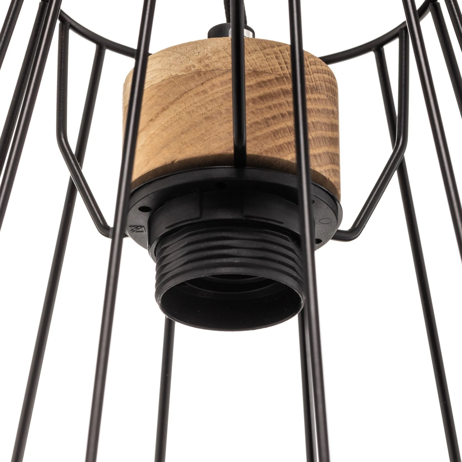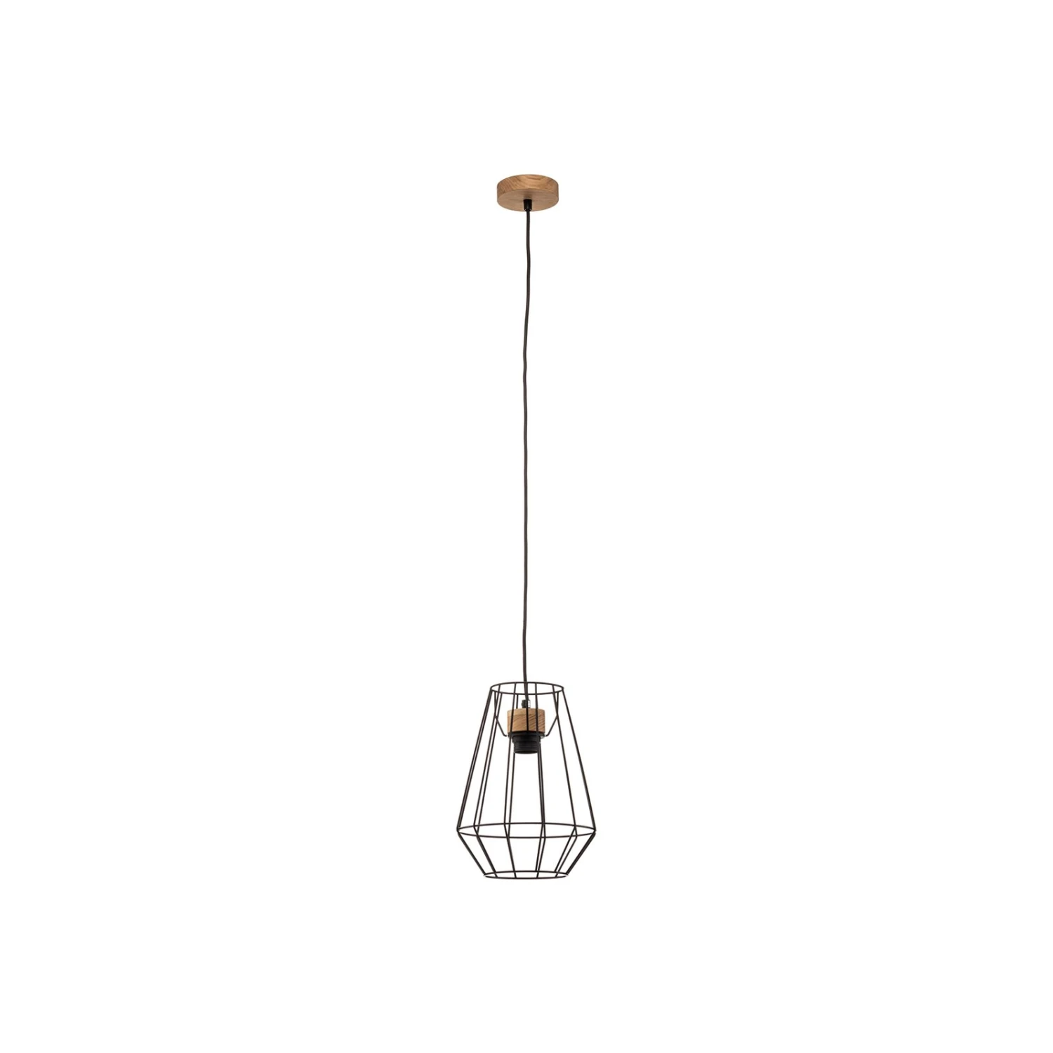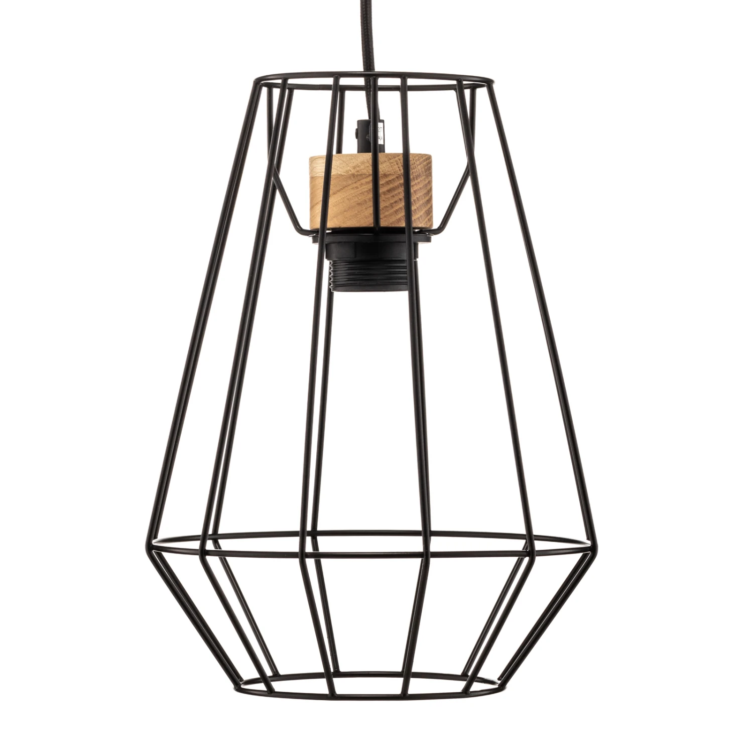 Einflammige Pendelleuchte Finan mit schwarzem Käfigschirm und hellen Holzdetails