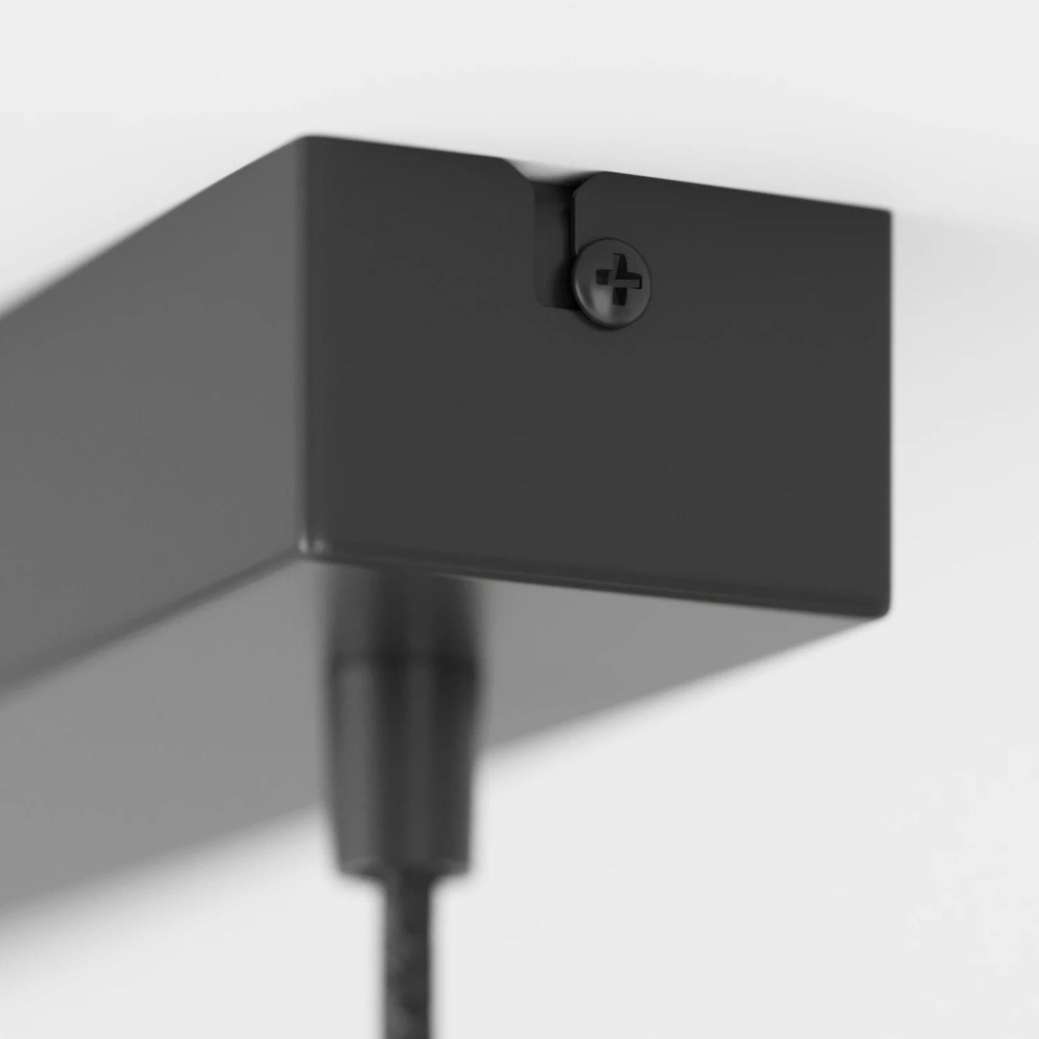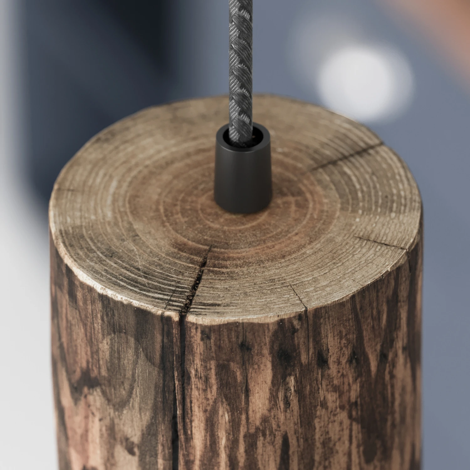 Die Hängeleuchte Terra wird mit einem rechteckigen Baldachin aus schwarzem Metall an der Decke montiert. Von diesem hängen drei Leuchtmittelfassungen an jeweils einem Textilkabel hinab. Die Fassungen bestehen aus gebeiztem Kiefernholz in Nussbaum-Optik und bringen eine schöne natürliche Note in den Wohnraum. Terra kommt besonderes gut über dem Wohn- oder Esszimmertisch zur Geltung.