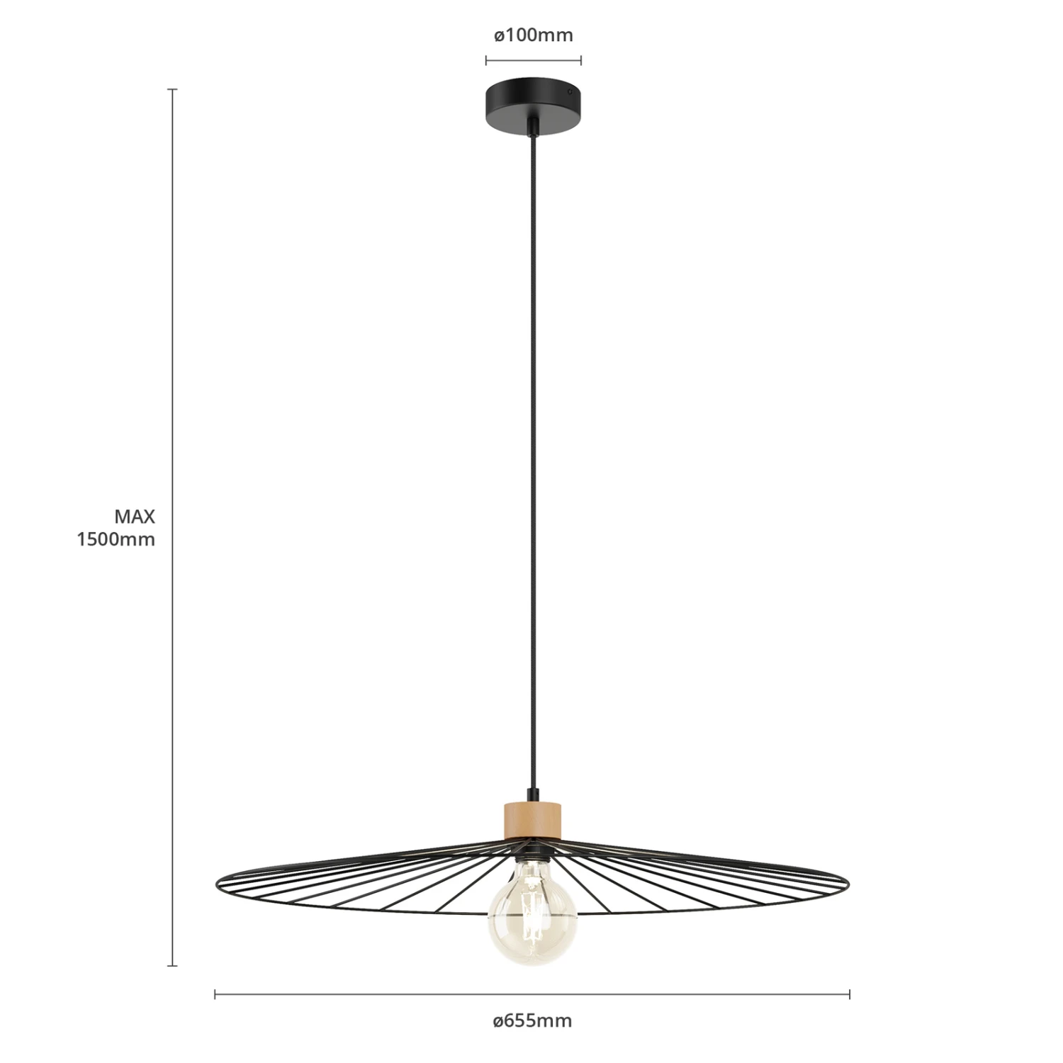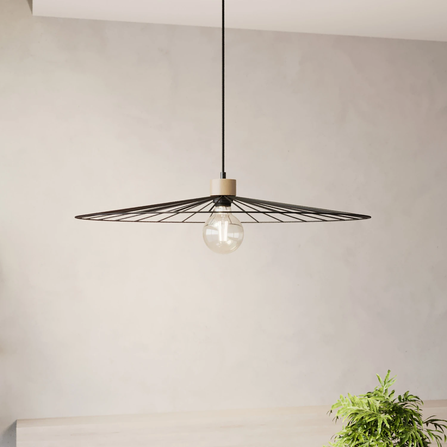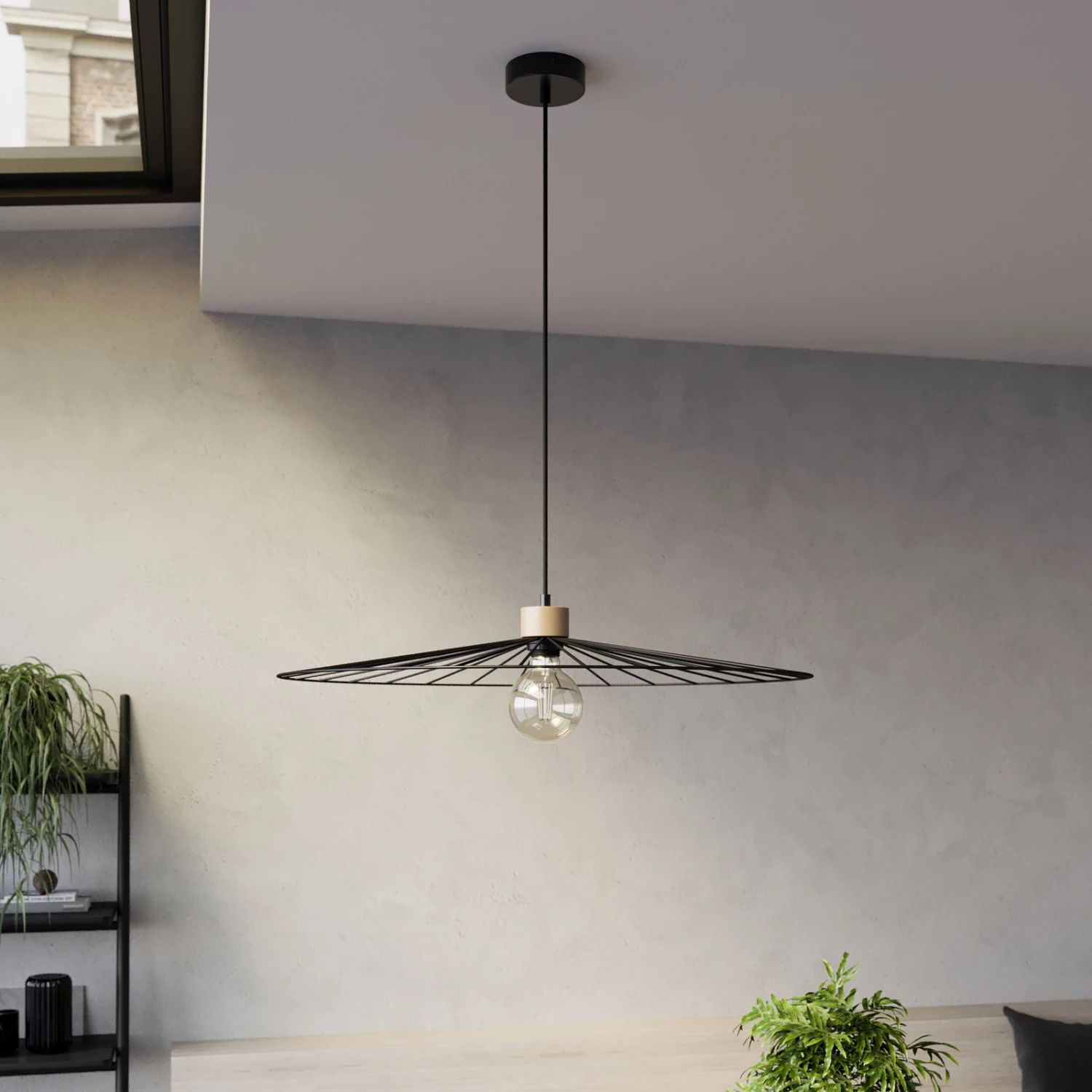 Das Merkmal der Hängeleuchte Yahel ist ihr schwarzer, runder Schirm aus feinen Metallstreben, der die Leuchte sehr filigran wirken lässt. Durch ihr auffallendes Design ist die Leuchte ein echter Hingucker und wertet den jeweiligen Wohnbereich auf. In der Mitte des Metall-Elements wird das frei wählbare Leuchtmittel eingesetzt. Dieses ist nach unten gerichtet und gibt das Licht zu allen Seiten ab. Da die Lichtquelle in der Mitte der Leuchte gut einsehbar ist, eignen sich dekorative Leuchtmittel besonders gut zur Beleuchtung. Außerdem wird so die außergewöhnliche Optik der Leuchte abermals hervorgehoben.