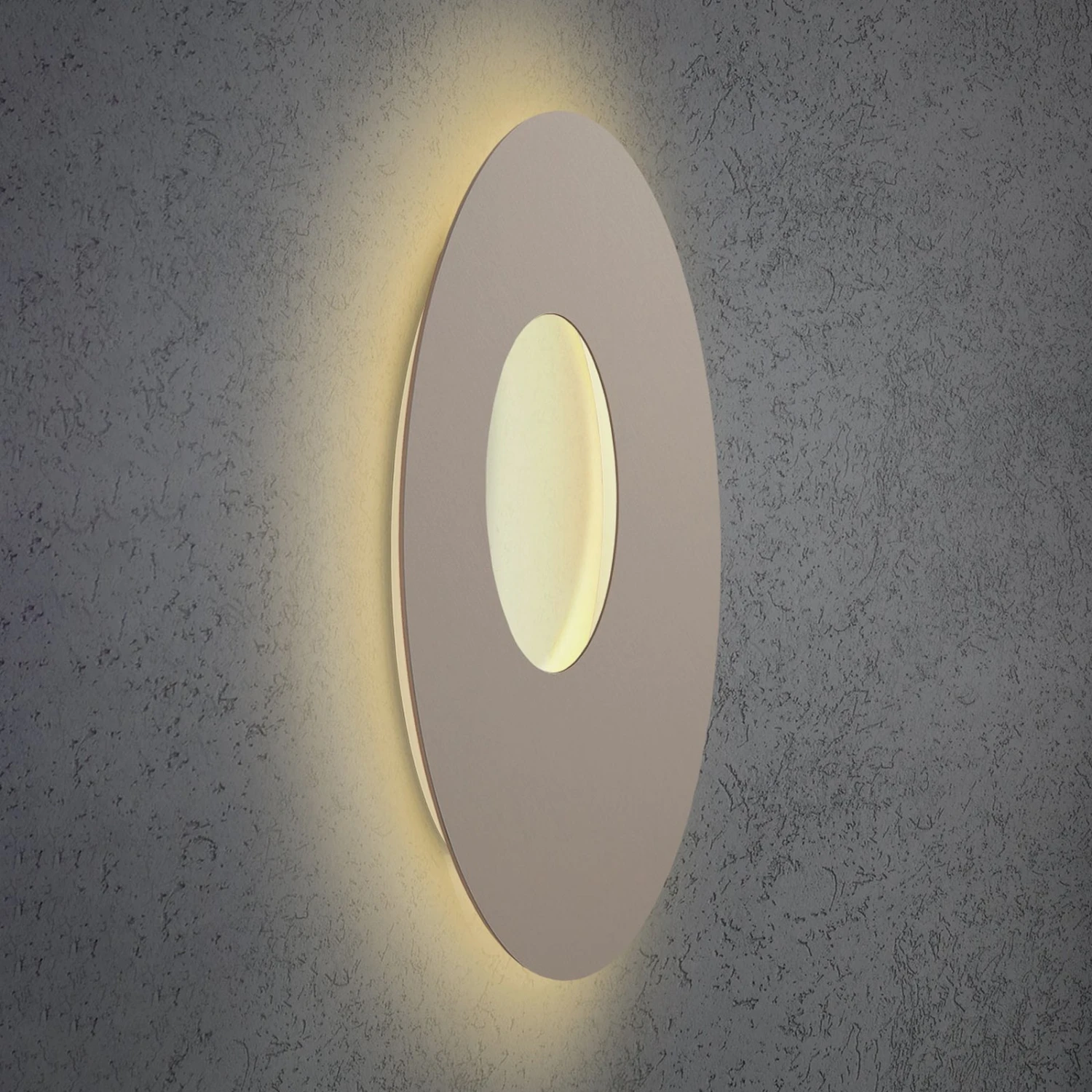 Die LED-Wandleuchte Blade ist mit einem kreisförmig gebogenen LED-Modul ausgestattet, das hinter einer runden Dekorplatte aus Aluminium verbaut wurde. Durch die dezentral platzierte, runde Öffnung der Dekorplatte wird dem Design eine Verspieltheit zugedacht, welche die akkurat runde Formgebung auflockert und zugleich einen direkten Blick auf das LED-Modul gestattet. Die verbauten Leuchtdioden spenden ein angenehmes und warmweißes Licht, mit dem sie in jedem Raum für eine behagliche Atmosphäre sorgen. Der indirekte Lichtschein wird an die Wand geworfen und erweckt den Anschein als würde die Leuchte vor der Wand schweben.