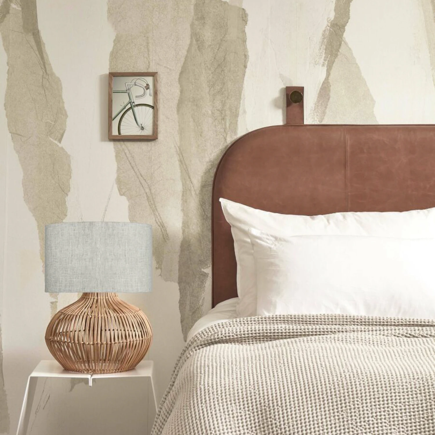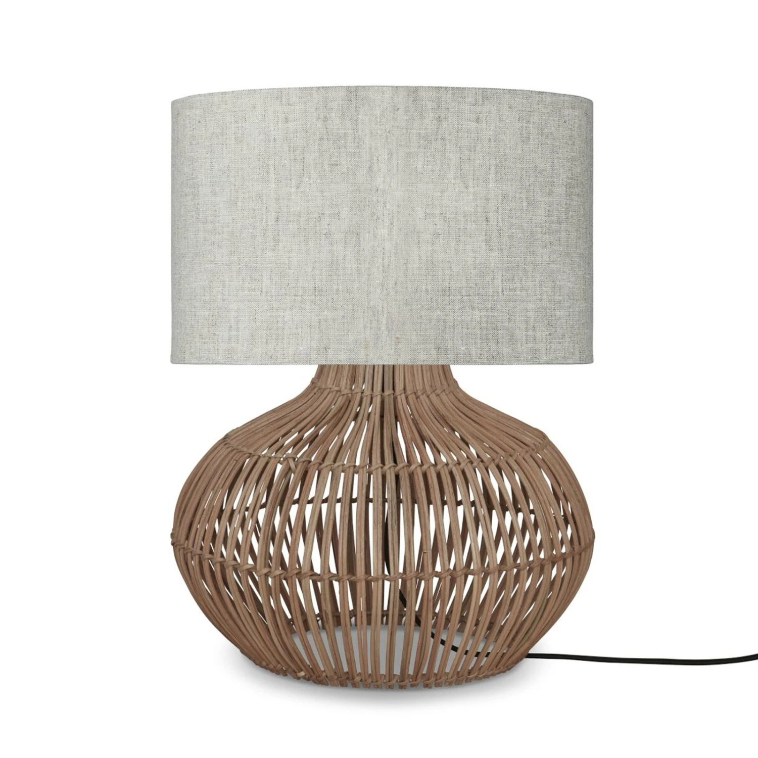 Dekorative Tischleuchte Kalahari mit Rattanfuß und Leinenschirm
