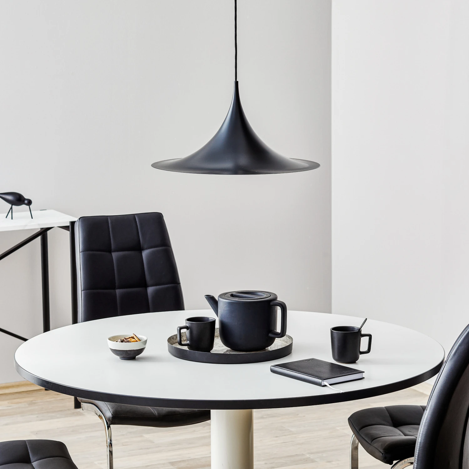 Das Design der Hängeleuchte Semi wurde von den dänischen Designern Claus Bonderup und Torsten Thorup kreiert. Sie schufen damit einen Lichtspender, der sich durch seine klassische Form sowie eine sehr atmosphärische Lichtwirkung auszeichnet, durch die sich Semi optimal für die allgemeine Raumausleuchtung und insbesondere zur Verwendung über einem Tisch empfiehlt. Das stimmige Design in konkaver, nach oben zulaufender Form lässt sich mit vielen Einrichtungsvarianten in Einklang bringen.