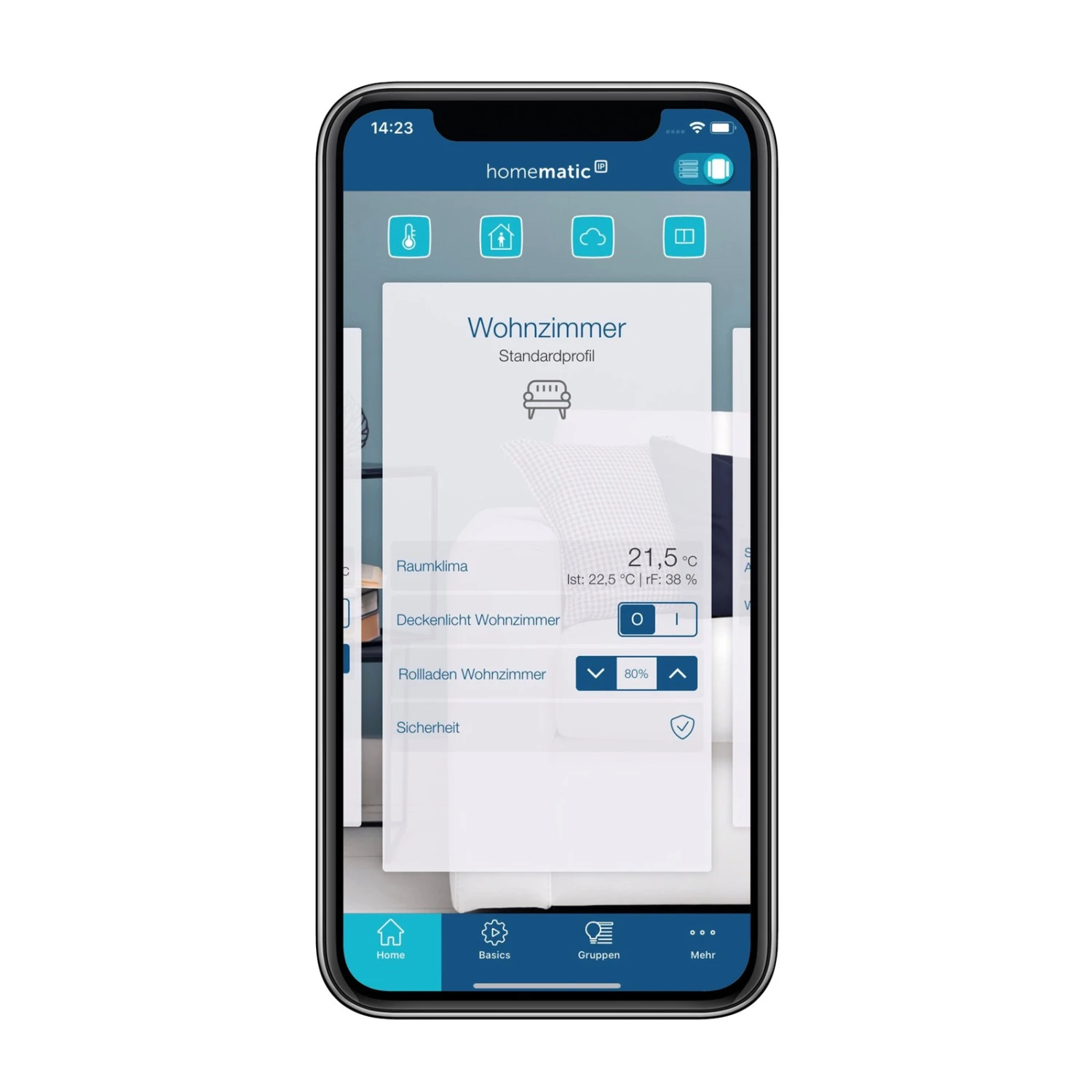 a) Einbindung über Homematic IP Access Point mit Konfiguration und Bedienung über kostenlose Homematic IP App für iOS und Android und kostenfreiem Cloud-Service (ermöglicht Sprachsteuerung über Amazon Alexa oder Google Assistant)