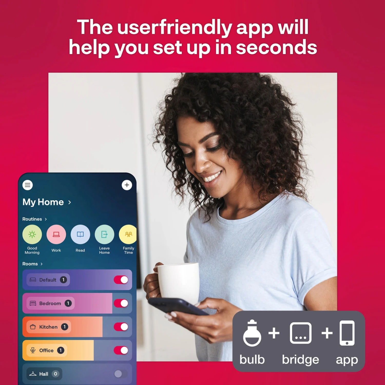 Im Doppelpack gibt es hier die LED-Lampe Smart Spot Comfort für GU10-Fassungen. Die Lichtfarbe kann von Warmweiß bis Universalweiß flexibel per Smartphone oder Sprachassistent eingestellt werden. Auch das Ein- und Ausschalten sowie das Dimmen der Helligkeit ist auf diesem Weg möglich. Zur Nutzung dieser Funktionen ist zusätzlich eine Bridge (siehe Zubehör) nötig.
