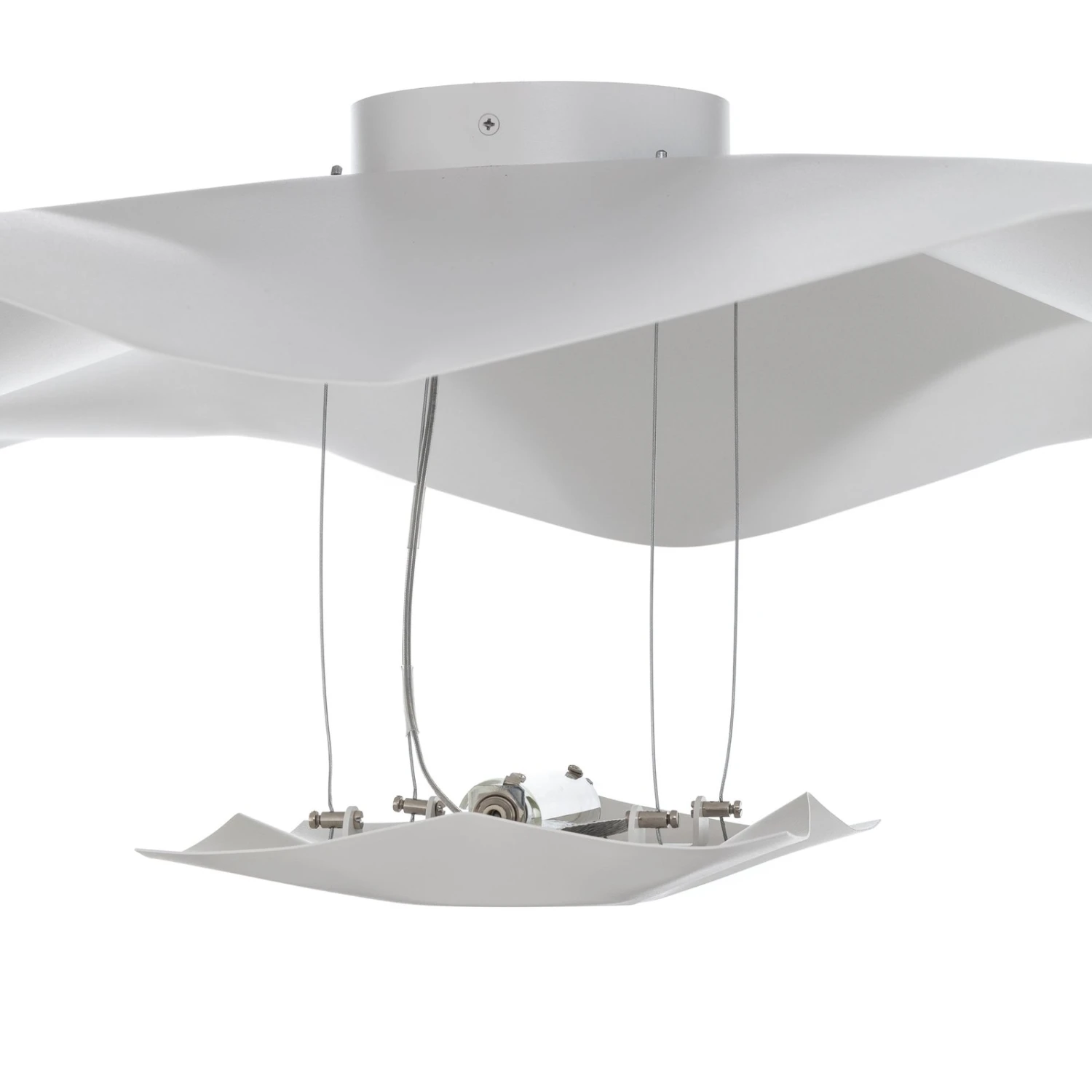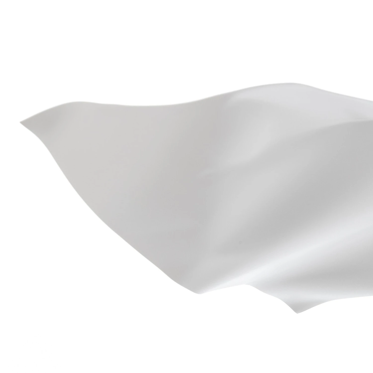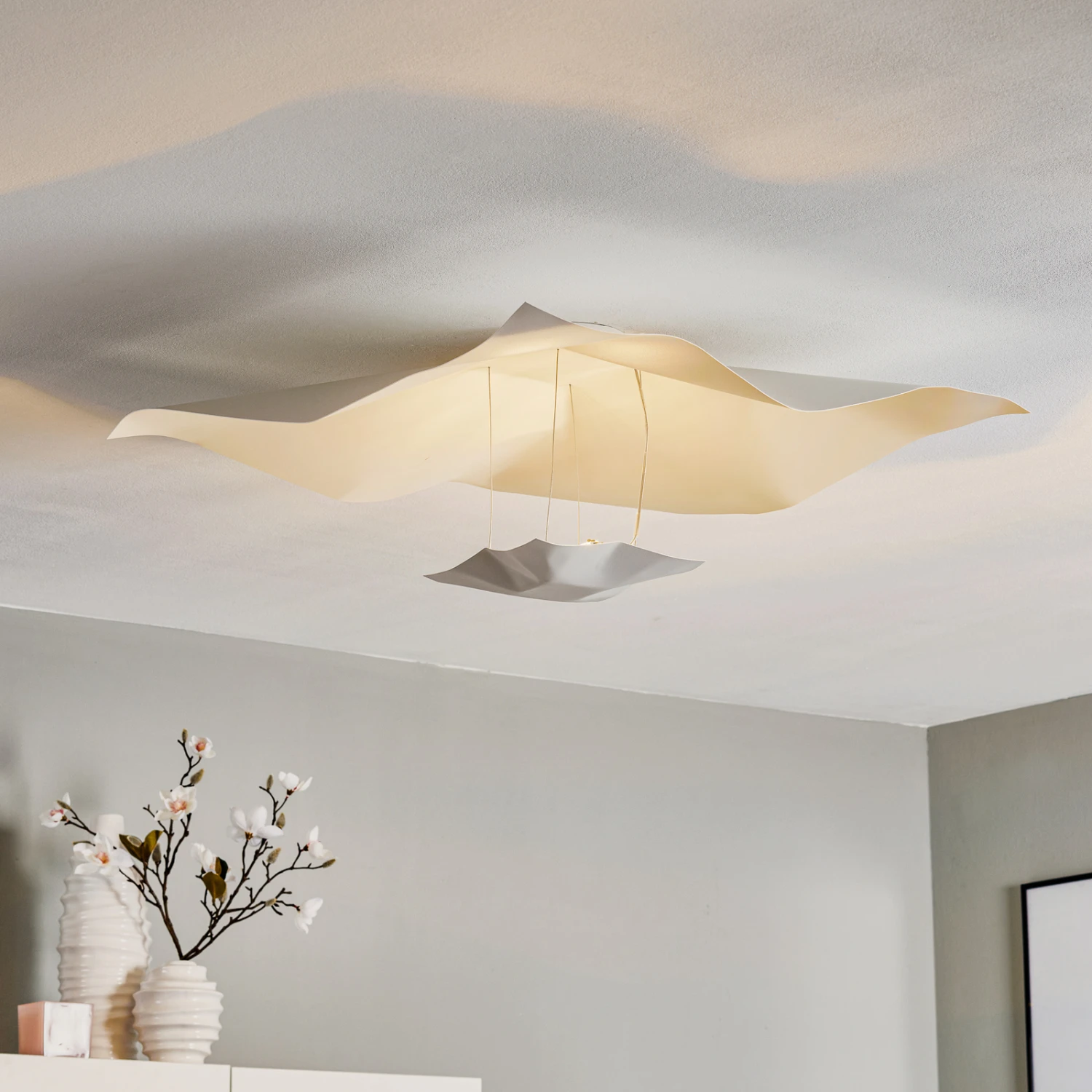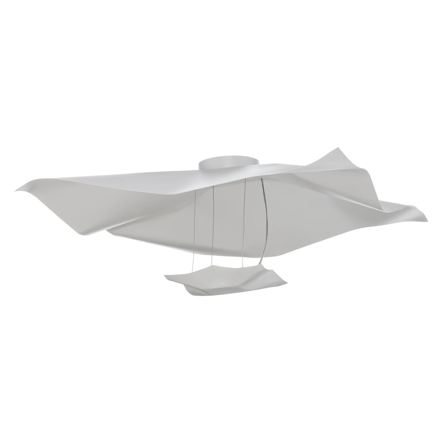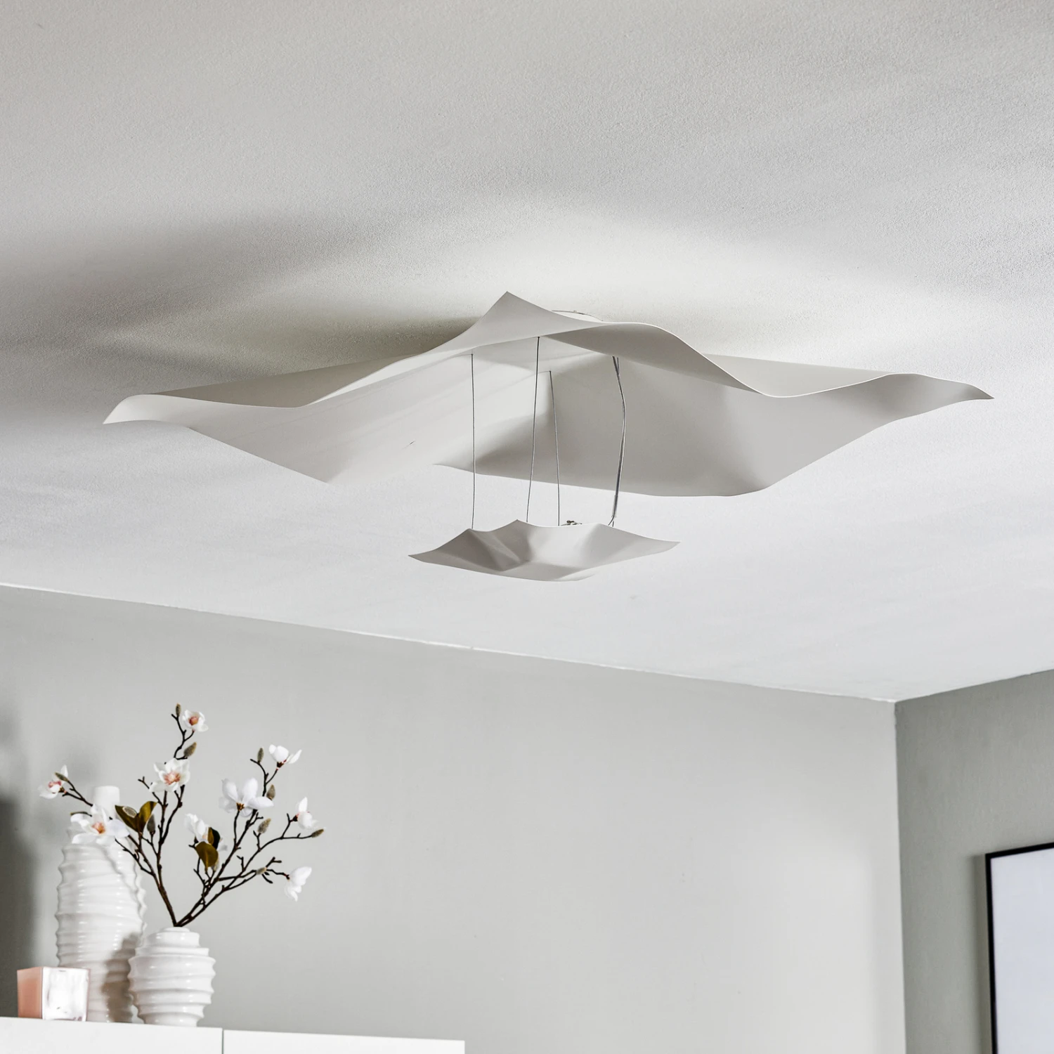 Das Design von Knikerboker begeistert durch seine zahlreichen Falten und Fältchen, die über die Länge von 75 cm verteilt sind. Die exquisite Leuchte aus italienischer Manufaktur verspricht eine ästhetische Wirkung in allen denkbaren Wohnbereichen. Die Deckenleuchte besteht aus einem großen Körper und einer kleinen weißen Metallplatte, die darunter platziert ist. Diese schirmt die Illumination deutlich ab. Das angenehme Licht schimmert auf der weißen Fläche an der Decke, sodass eine indirekte Beleuchtung entsteht. Die große weiße Metallfläche lässt an ein großes Blatt Papier denken, welches stellenweise geknüllt wurde. Die behagliche Lichtstimmung wirkt samtig weich und angenehm hell.