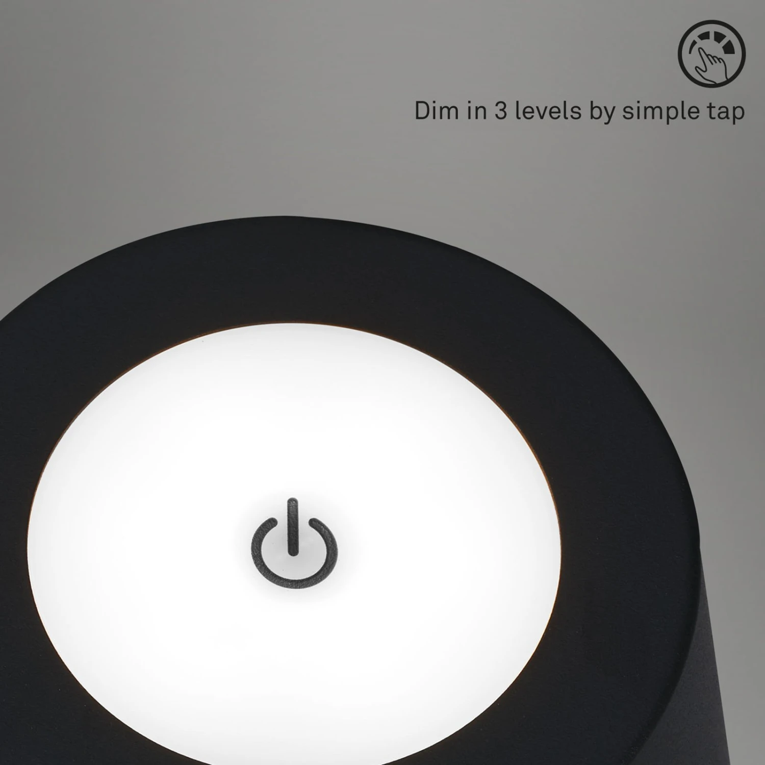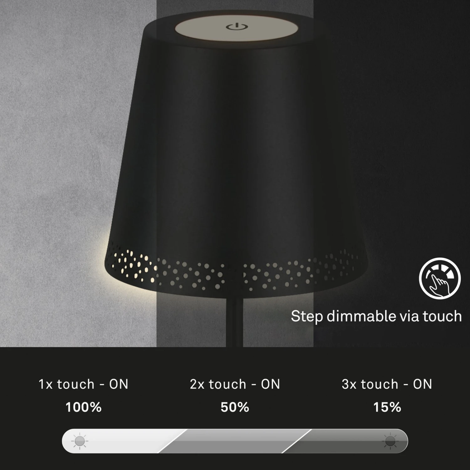 Die modern gestaltete LED-Stehleuchte Kiki ist mit einem integrierten Akku und einem mitgelieferten USB-Ladekabel (exkl. Netzteil) ausgestattet, so dass sie im Außenbereich frei platziert und bei Bedarf am Hausstrom wieder aufgeladen werden kann. Durch das teilbare Gestänge lässt sich Kiki in drei unterschiedlichen Höhen montieren, so dass eine Maximalhöhe von 130 cm und eine Minimalhöhe von 38 cm erreicht werden kann. Durch einfaches Antippen der Schirmoberseite dimmt sich das Licht in drei unterschiedliche Helligkeiten ( 100% / 50% / 15%).