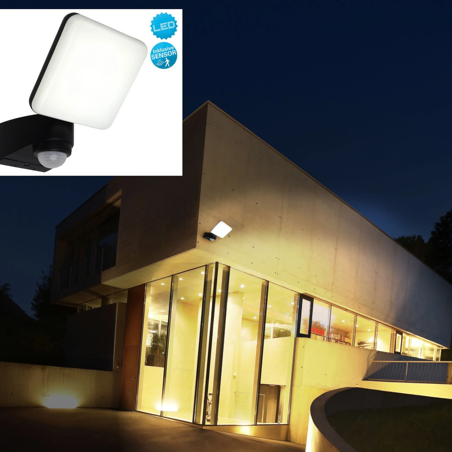 Die moderne LED-Außenwandleuchte Jaro besitzt ein Lichtpanel, welches sich nach oben und unten schwenken lässt. Die Ausrichtung des Lichts, ob es eher gerade oder mehr nach unten strahlend ausgerichtet sein soll, ist somit individuell anpassbar. Die integrierten LEDs strahlen hier mit einem hellem Universalweiß und werden dank des Sensors immer nur dann geschaltet, wenn eine Bewegung erfasst wird. Bei einer Reichweite von 2-12 Metern und einem Erfassungswinkel von 360° bietet sich die LED-Außenwandleuchte Jaro für Hauseingänge oder andere stark frequentierte Bereiche, wie zum Beispiel im Bereich der Garage, an.