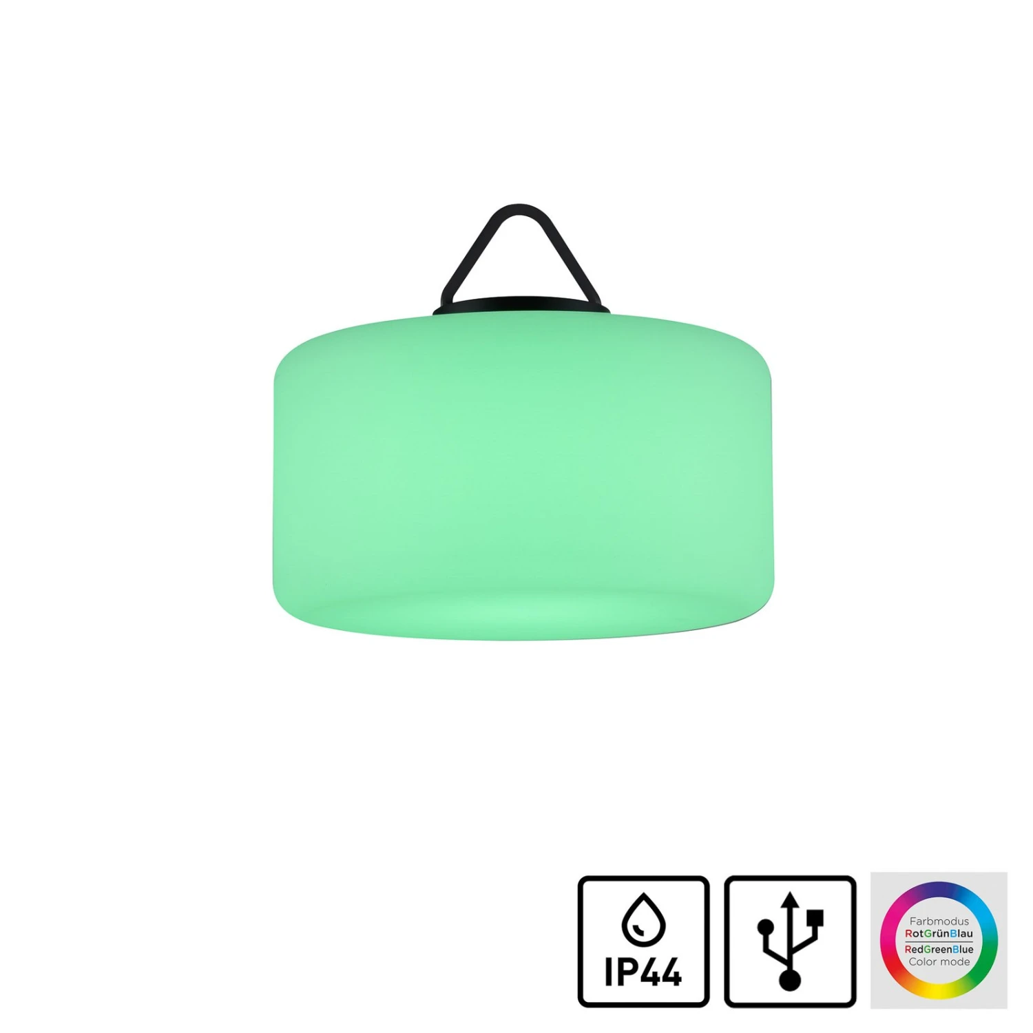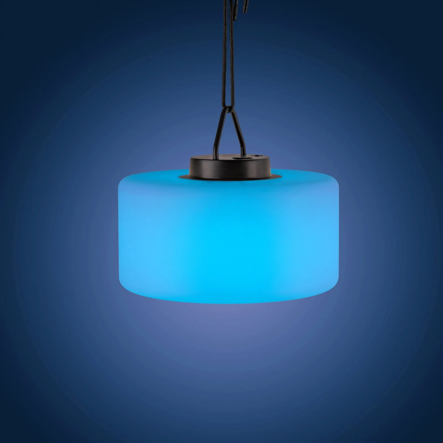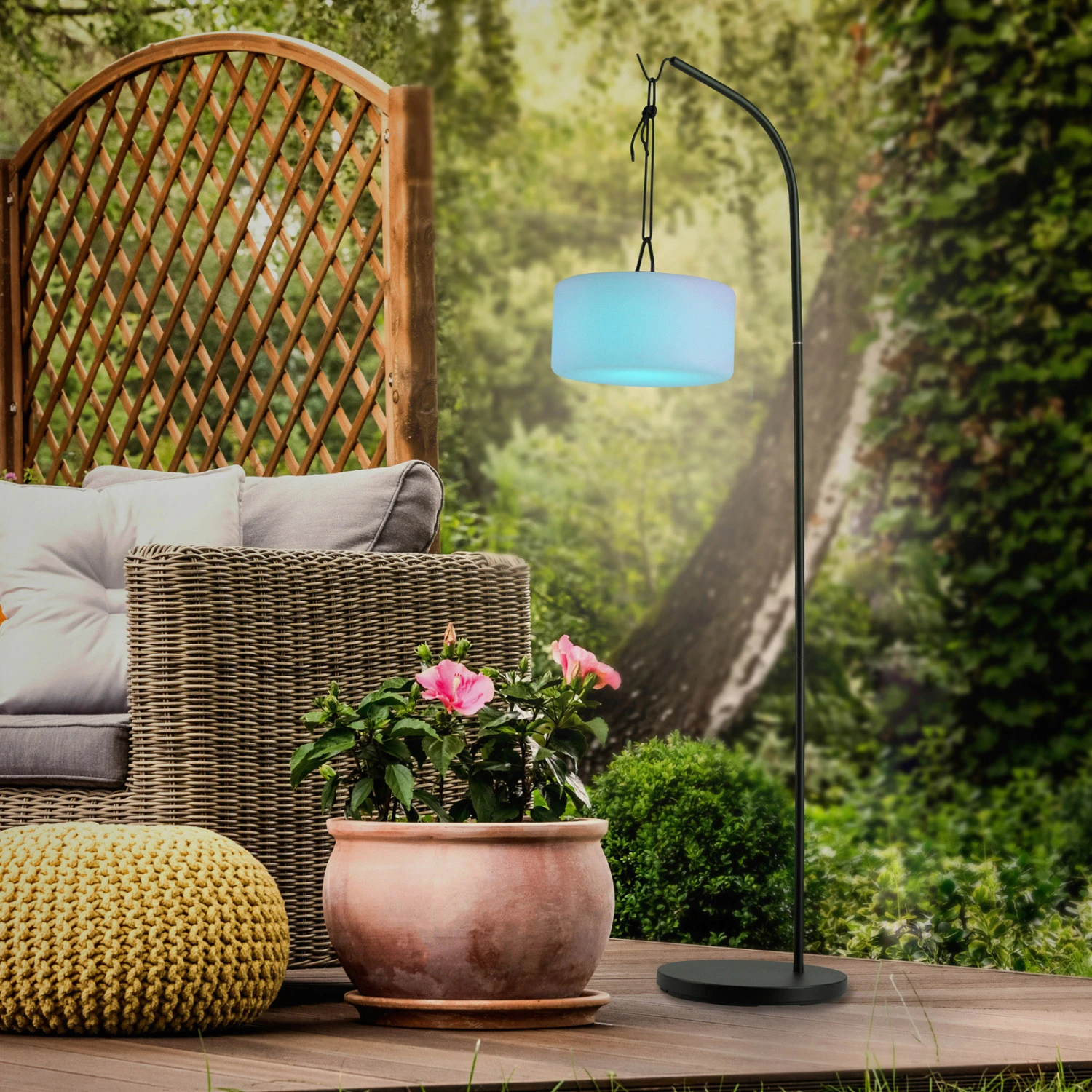 Moderne Akzente sowie ein einmaliges Ambiente lassen sich mit der LED-Pendelleuchte Holly im Außenbereich erzielen, die sich dank Akkubetrieb an jedem Ort platzieren lässt. Der große Lampenschirm aus wetterfestem Kunststoff sorgt dabei nicht nur für einen besonderen Eyecatcher, sondern auch für eine blendfreie Belichtung. Das im Innere sitzende LED-Modul ist mit einem Akku ausgestattet, das sich mit Hilfe des im Lieferumfang enthaltenen USB-Kabels wiederaufladen lässt. Durch einen integrierten Tastschalter lässt sich das Licht bequem schalten sowie in der Lichtfarbe verstellen, so dass für jede Situation das passende Ambiente erzeugt werden kann. Besonderer Clou: Die LED-Pendelleuchte Holly ist mit einem schwarzen Metallhaken am Schirm ausgestattet, über den sie sich entweder mit dem mitgelieferten Seil aufhängen oder aber auch mit dem passenden Standfuß kombinieren lässt, der über das Zubehör erworben werden kann.