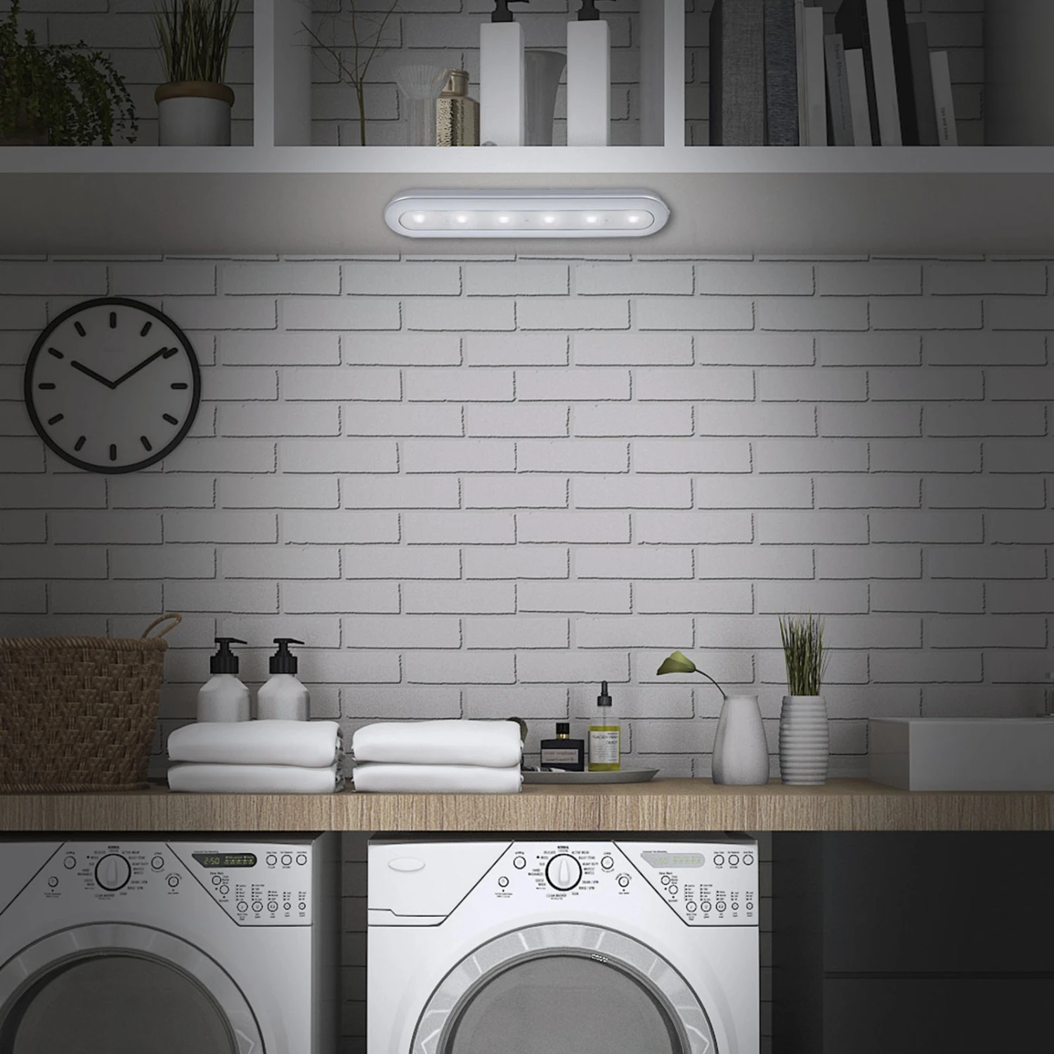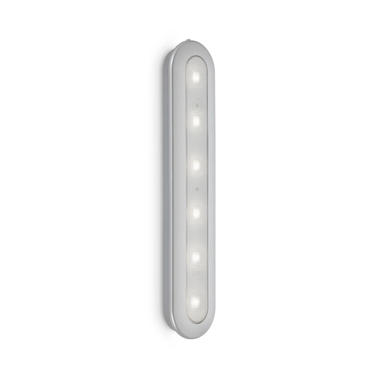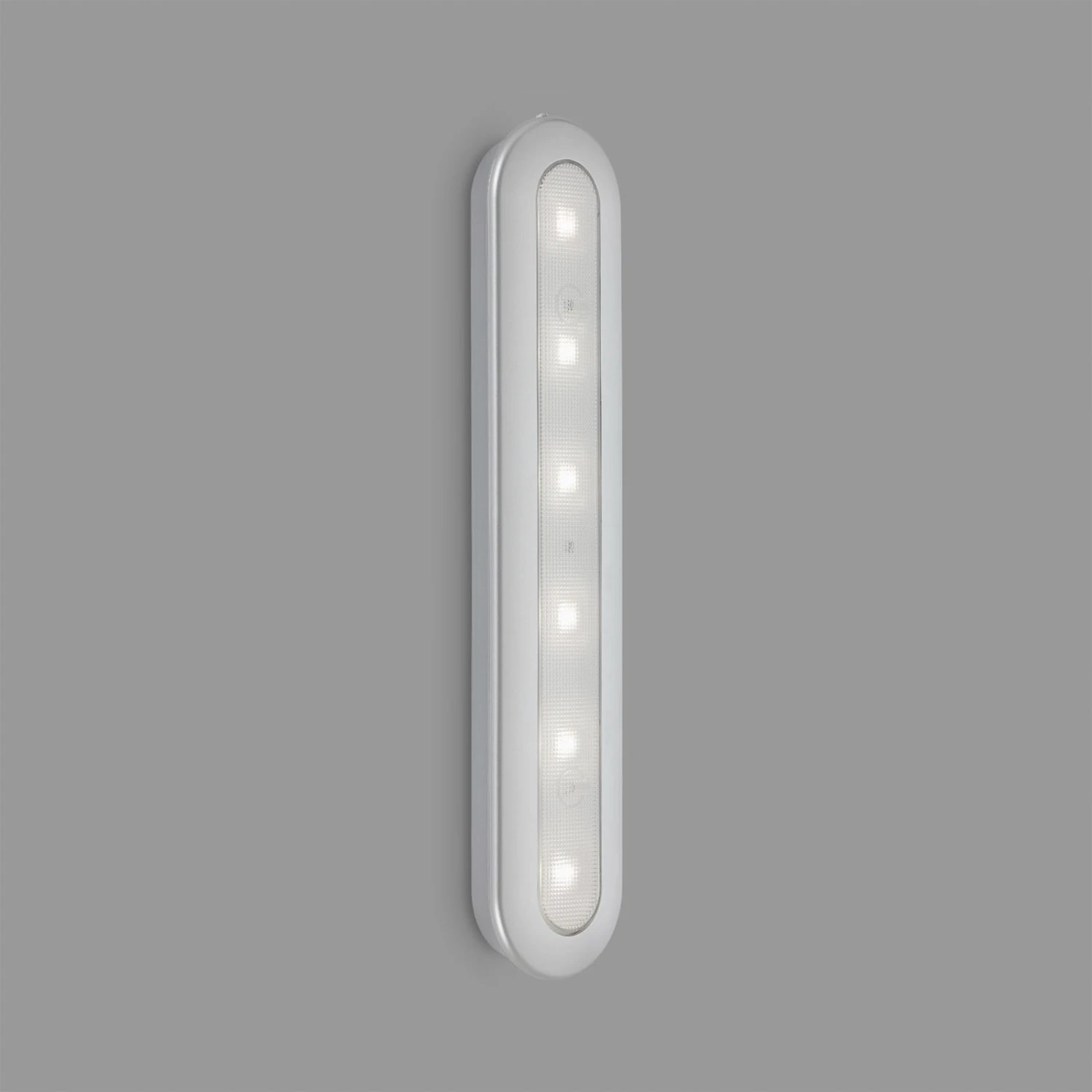 Das LED-Push-Light Row ist mit einem Timer ausgestattet, dessen Dauer frei einstellbar ist. Wählbar sind die Stufen – dauerhaft an – 1 Minute – 5 Minuten – 15 Minuten. Das Ein- und Ausschalten der tageslichtweißen LEDs erfolgt über Push-Bewegungen. Das Kunststoffgehäuse ist in einem dezenten, silberfarbenen Ton gehalten. Im Lieferumfang sind Klebepad und Schrauben zur Montage sowie 6 x AA-Batterien enthalten.