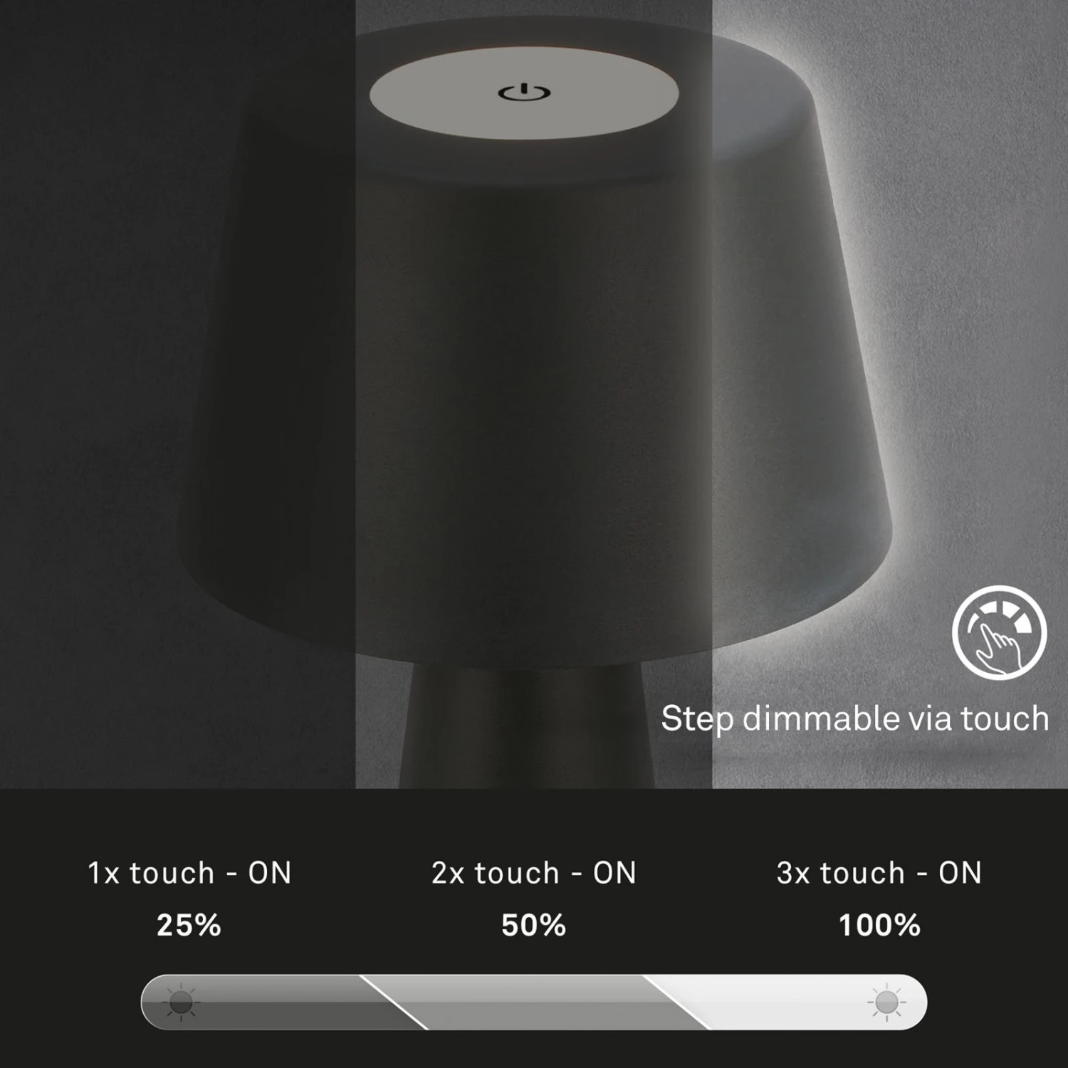 Im Innen- und Außenbereich (Schutzart IP44) kann die LED-Tischleuchte Kihi völlig autark für angenehme Beleuchtung sorgen, denn in der Leuchte ist ein Akku integriert. Dieser lässt sich über das mitgelieferte, 50 cm lange USB-Ladekabel (ohne Netzstecker) wieder aufladen. Die Leuchte besteht komplett aus Kunststoff und strahlt in warmweißer Lichtfarbe eine stimmungsvolle Beleuchtung ab. Über den Touch-Schalter auf dem Schirm wird das Licht nicht nur ein- und ausgeschaltet, sondern kann durch mehrmaliges Schalten auch in drei Helligkeitsstufen gedimmt werden.