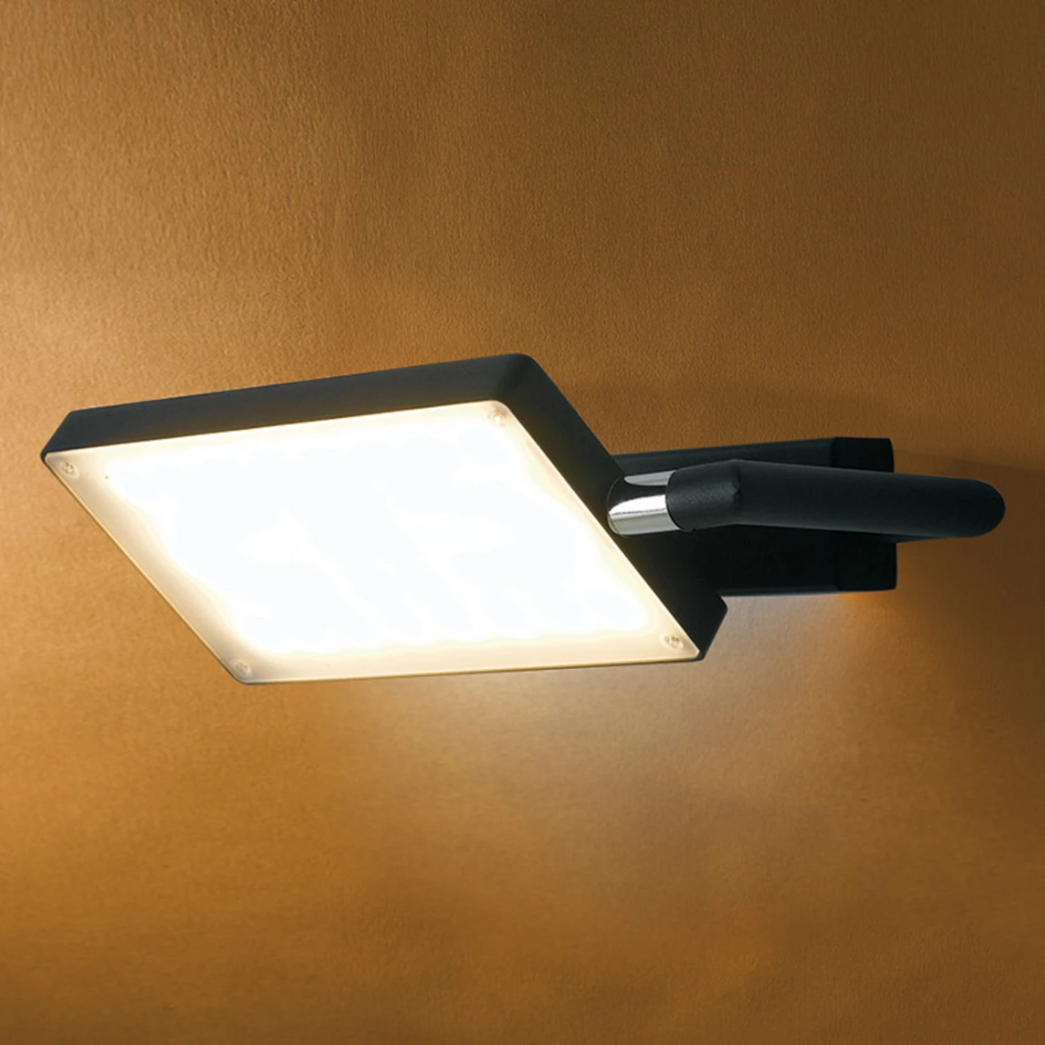 Die Wandhalterung der LED-Wandleuchte Book ist lediglich ein quaderförmiger Kasten, an dessen Seite ein U-förmiger Arm als Halterung für das LED-Modul angebracht ist. Das LED-Modul ist in ein rechteckiges Gehäuse aus Aluminium gefasst und auf der horizontalen Achse um 300° drehbar gelagert. Das ermöglicht es, den Lichtkegel nach oben oder unten an die Wand, an die Decke, an den Boden oder in den Raum hinein zu lenken. Die Wandleuchte eignet sich also für viele Aufgaben, wie zum Beispiel zur Beleuchtung einer Treppe, eines Bildes, als Leselampe hinter einem Sofa oder Sessel oder einfach zur Ergänzung der Hauptbeleuchtung durch indirektes Licht.