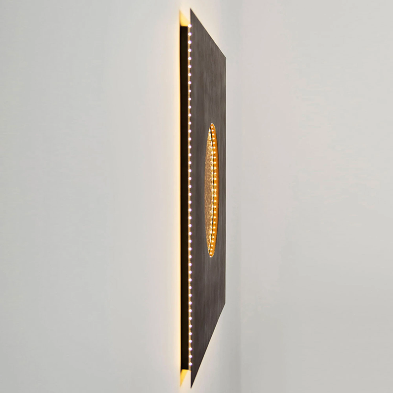 Die LED-Wandleuchte Luina wirkt in vielerlei Hinsicht beeindruckend: zum einen durch ihren großen, quadratischen Rahmen aus braun-schwarz lackiertem Eisen, zum anderen durch die Scheibe in der Mitte, die ebenfalls aus Eisen – allerdings mit gehämmerter Oberfläche in Gold – gearbeitet ist. Als Lichtquelle ist ein warmweiß leuchtender LED-Strip verbaut, der die Szenerie indirekt erhellt.