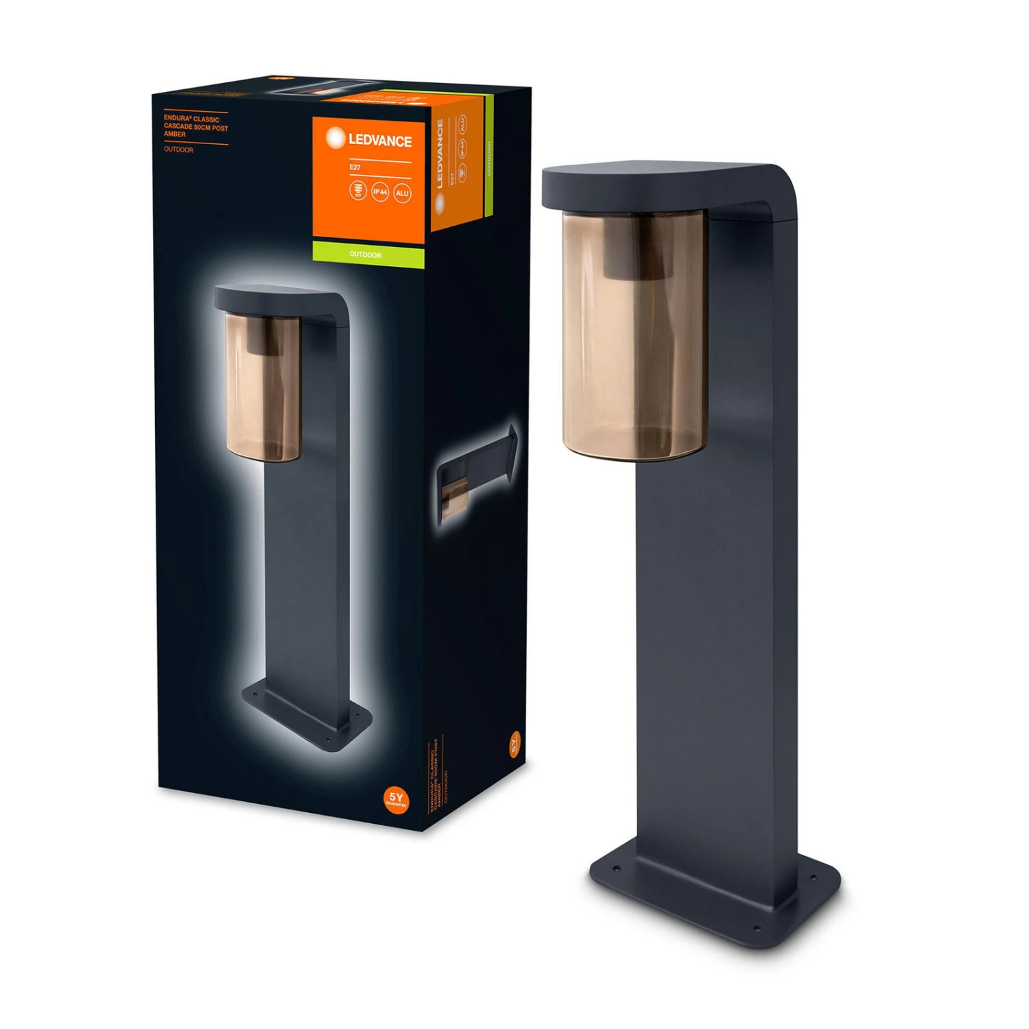 Im oberen Bereich wurde das aus Aluminium mit dunkelgrauem Finish (RAL 7016) gestaltete Gestell der Sockelleuchte Endura Classic Cascade im rechten Winkel nach vorne abgewinkelt. Hier sitzt der zylinderförmige Glasschirm der Sockelleuchte, der frei am Gestell nach unten hängt, so dass das Licht rundum durch das Glas abstrahlen kann. Eine besonders schöne Optik wird erzielt, wenn man in die E27-Fassung eine dekorative Filamentlampe einsetzt. Das Leuchtmittel wird nicht mitgeliefert, Befestigungsmaterial ist im Lieferumfang enthalten.