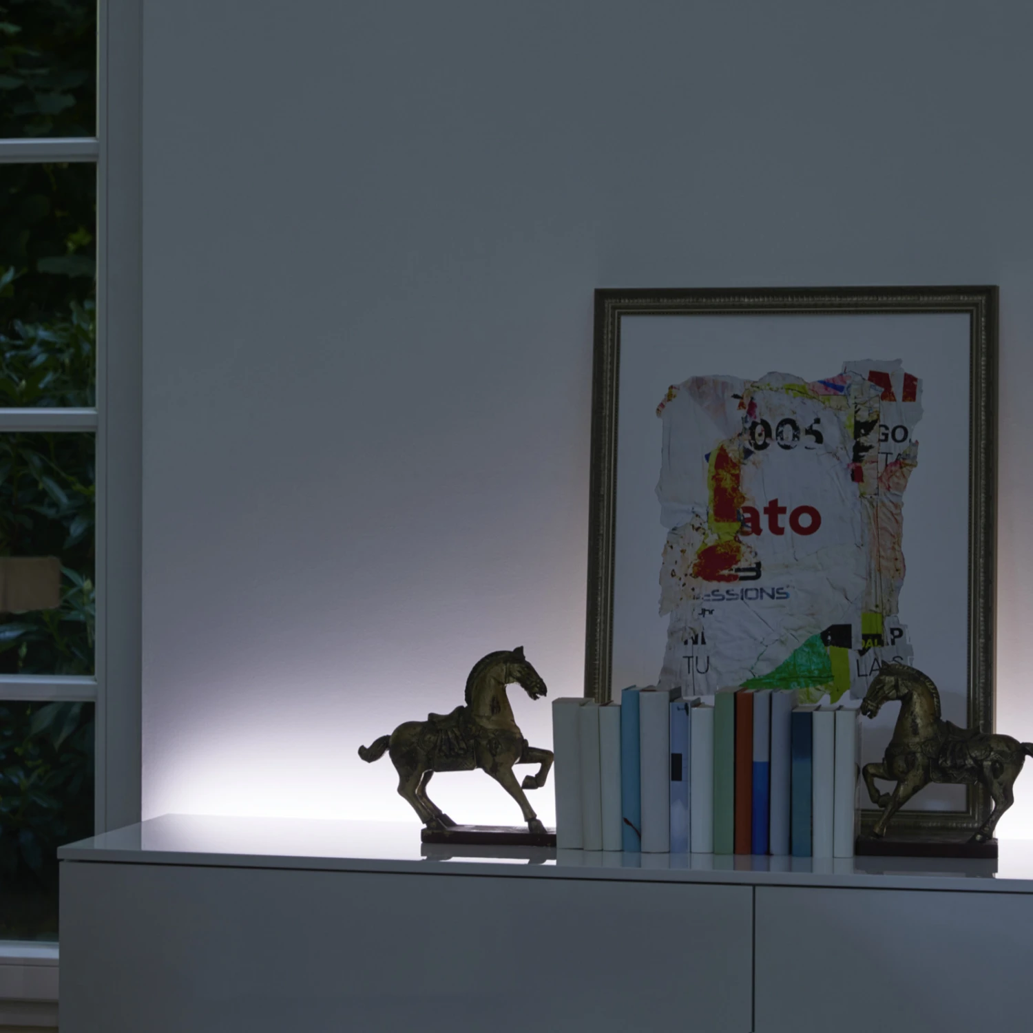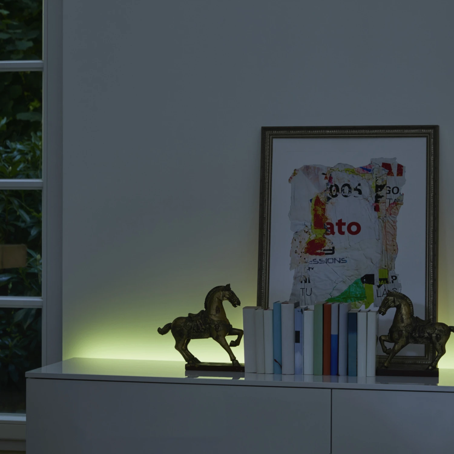 Das LED-Band ist selbstklebend, somit einfach zu installieren. Die gesamte Länge des Bandes ist in drei einzelne Streifen zu je 60 cm trennbar. Darüber hinaus gibt es die Möglichkeit, das System bis zu einer Gesamtlänge von 6 m zu erweitern. Das hier angebotene Basis-Set beinhaltet das LED-Lichtband LEDVANCE SMART+ Flex mit 180 cm Länge (3 x 60 cm) und das dazugehörige Netzteil.