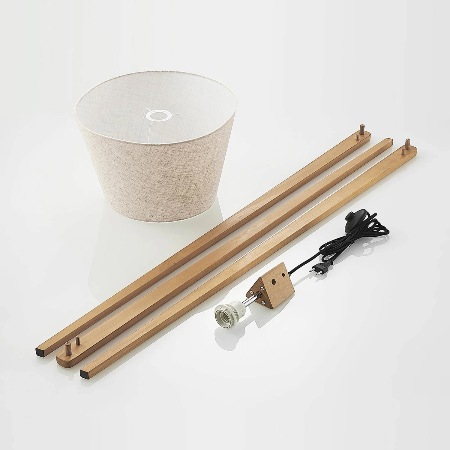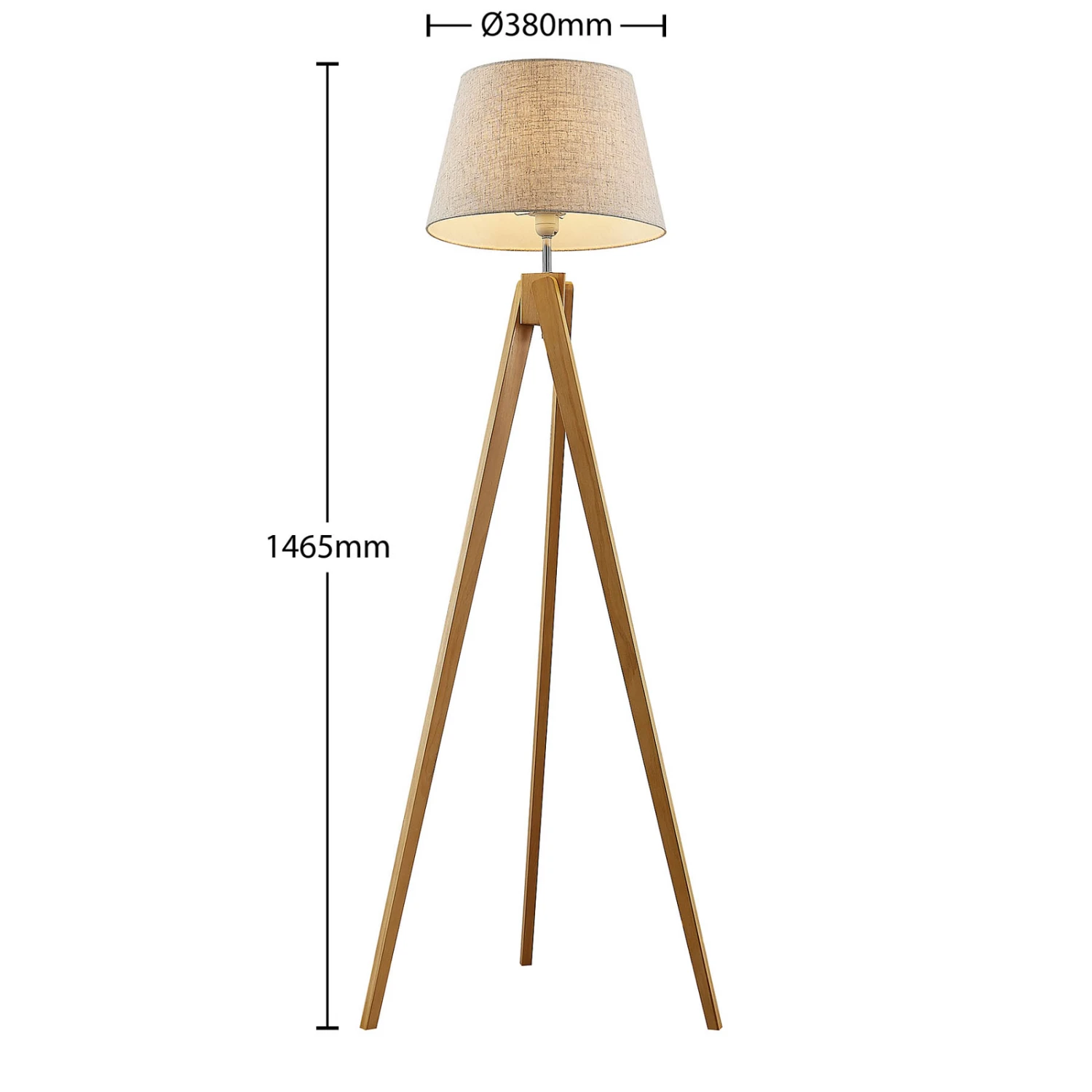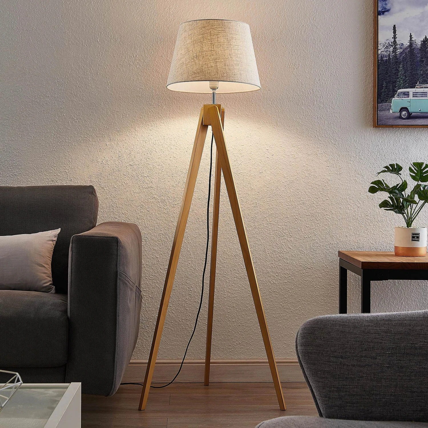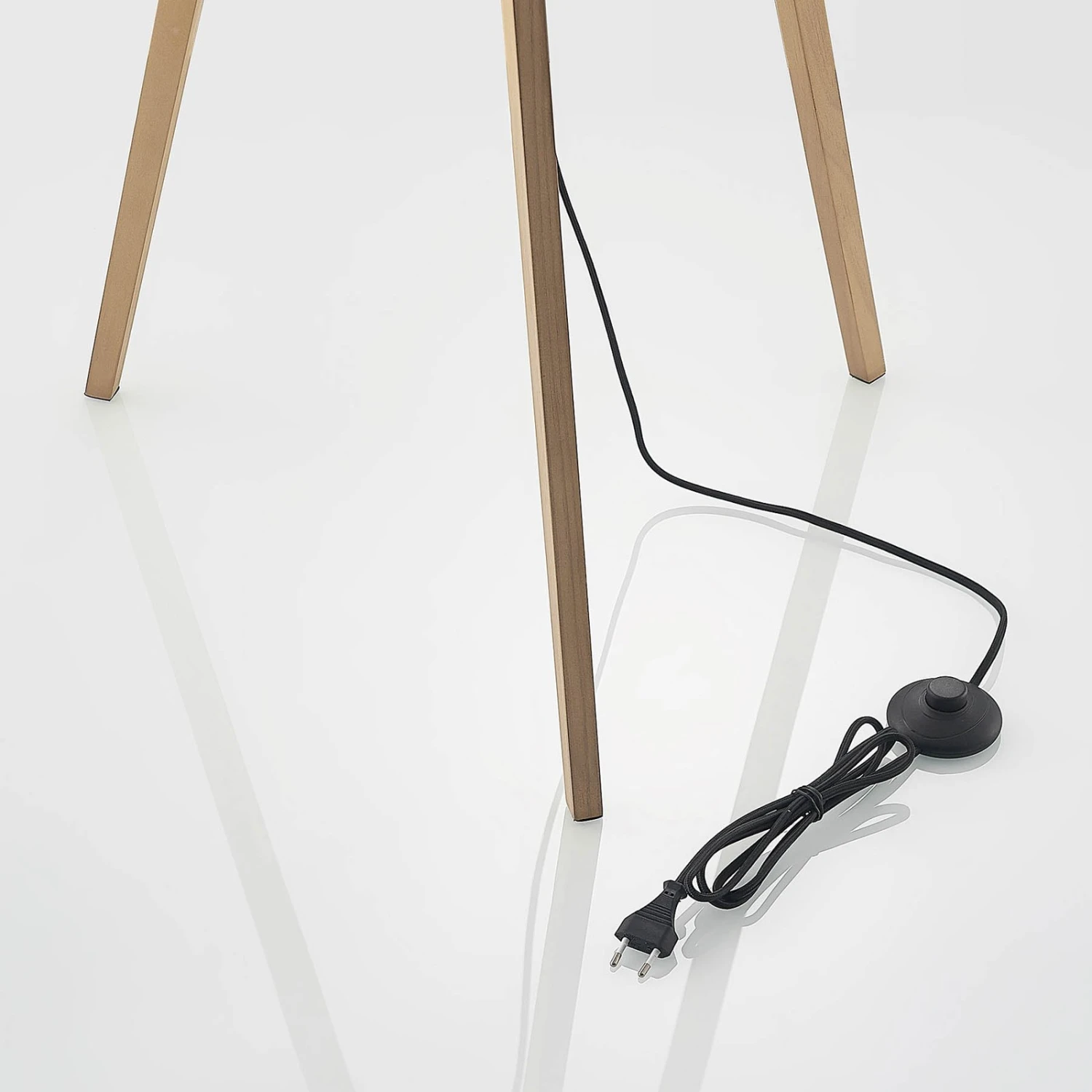 Schöner Lichtspender mit dreibeinigem Holzgestell – die Stehlampe Delara erzeugt gemütlichen Lichtschein