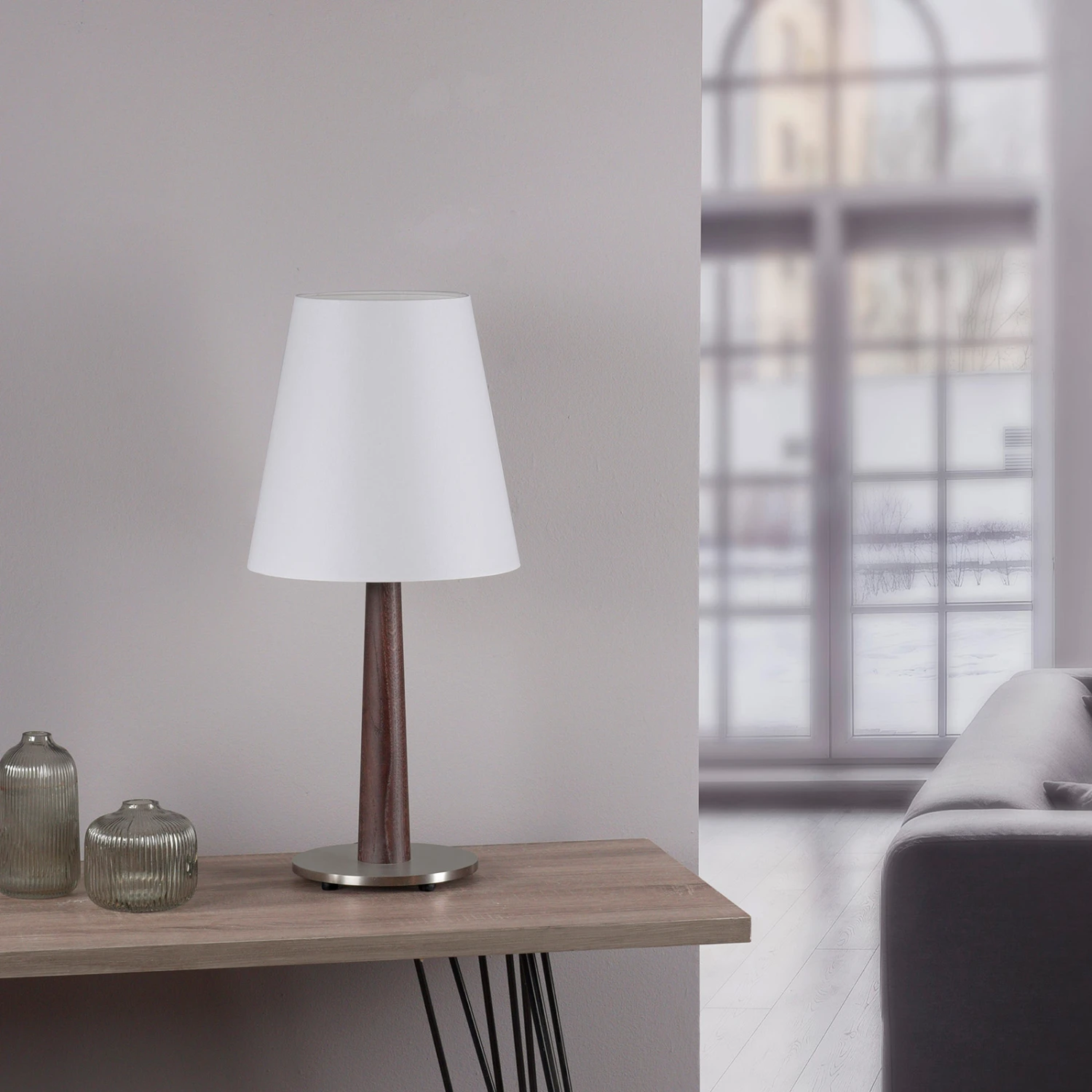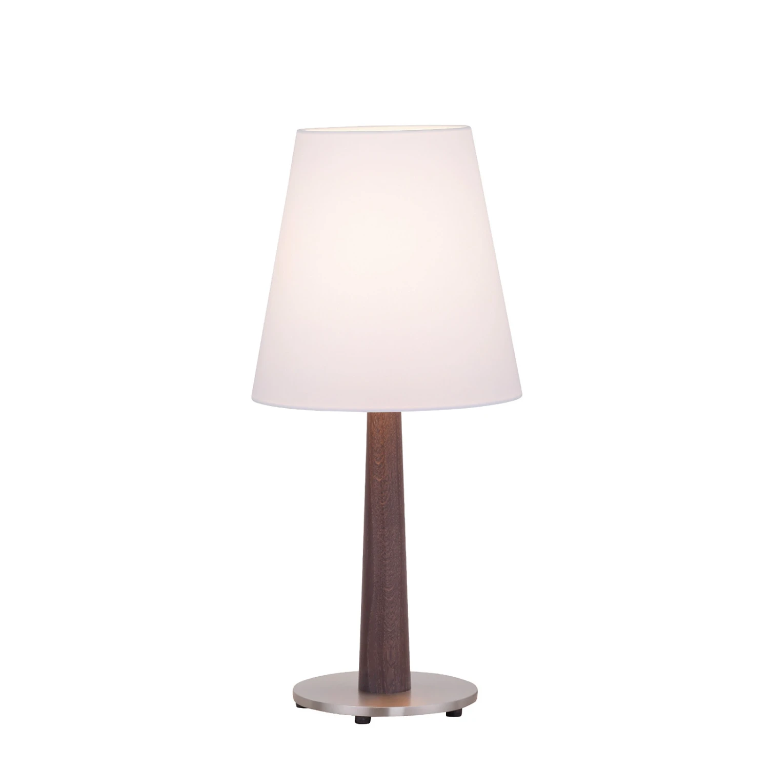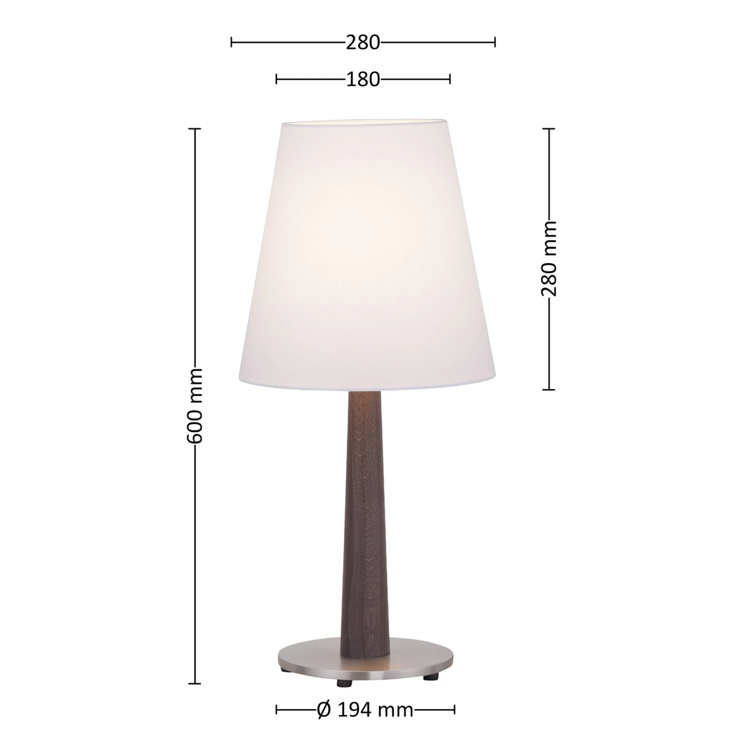 Hochwertige Materialien, zeitloses Design und eine zauberhafte Lichtwirkung, dies alles vereint die Tischleuchte Elif. Sie ist mit einem konischen Lampenschirm aus weißen Chintz ausgestattet, der auf einer ebenfalls kegelförmig gestalteten Holzsäule in Eiche kolonial thront. Dieser Gegensatz von Hell und Dunkel und von Holz und Stoff mache die Tischleuchte Elif so interessant.