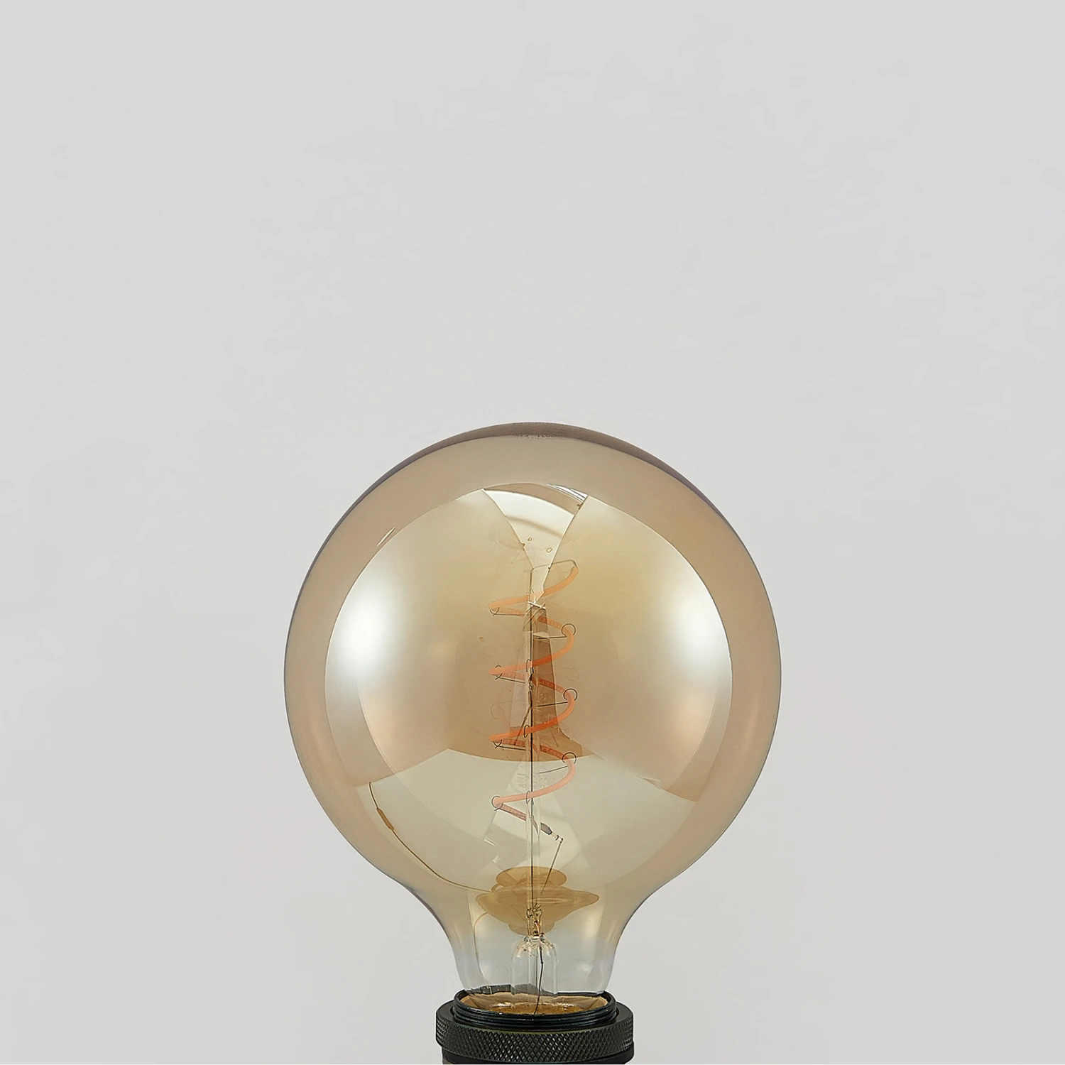 Mit ihrer stromsparenden Leistung von 4 Watt kann diese E27-LED-Globelampe eine gewöhnliche Glühbirne von bis zu 18 Watt ersetzen. Mit ihrer amberfarbenen Oberfläche wirkt sie sehr dekorativ. Der Filamentstab schwingt sich spiralförmig nach oben und verleiht der Lampe einen besonderen Look, der sich vor allem in Beleuchtungsobjekten mit einem offenen Leuchtenschirm sehen lassen kann. Bei Bedarf lässt sich die Lampe dimmen, sodass die Raumatmosphäre individuell angepasst werden kann. Die Farbwiedergabe ist mit dem hohen CRI von über 90 besonders gut.