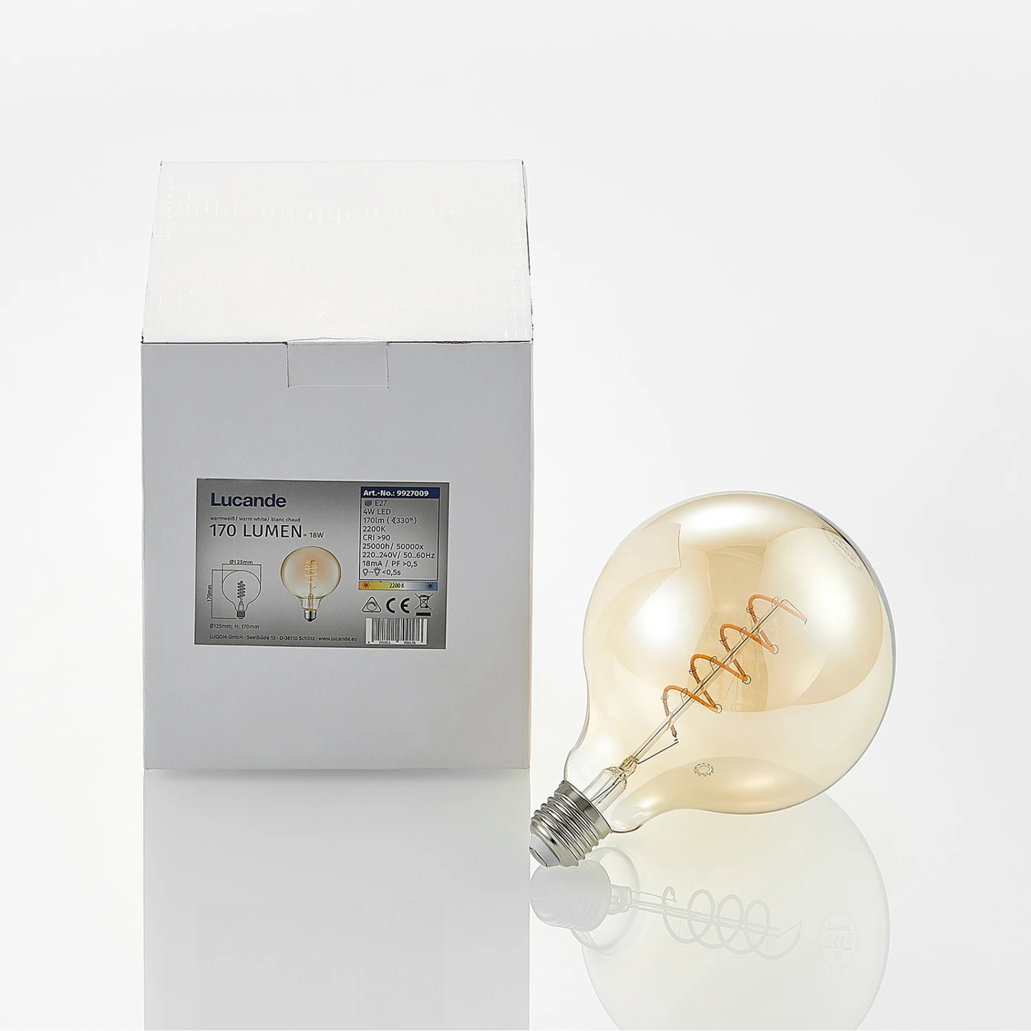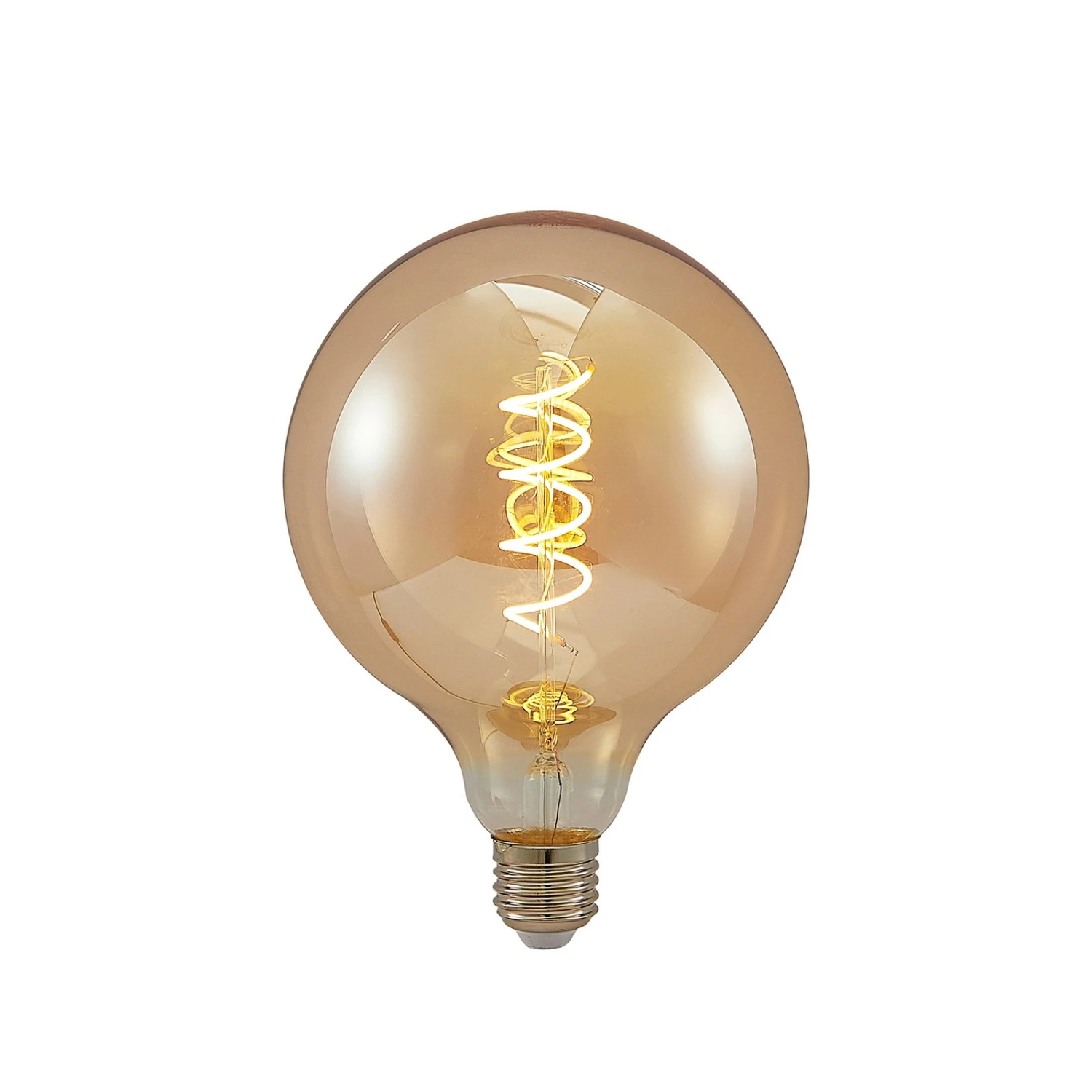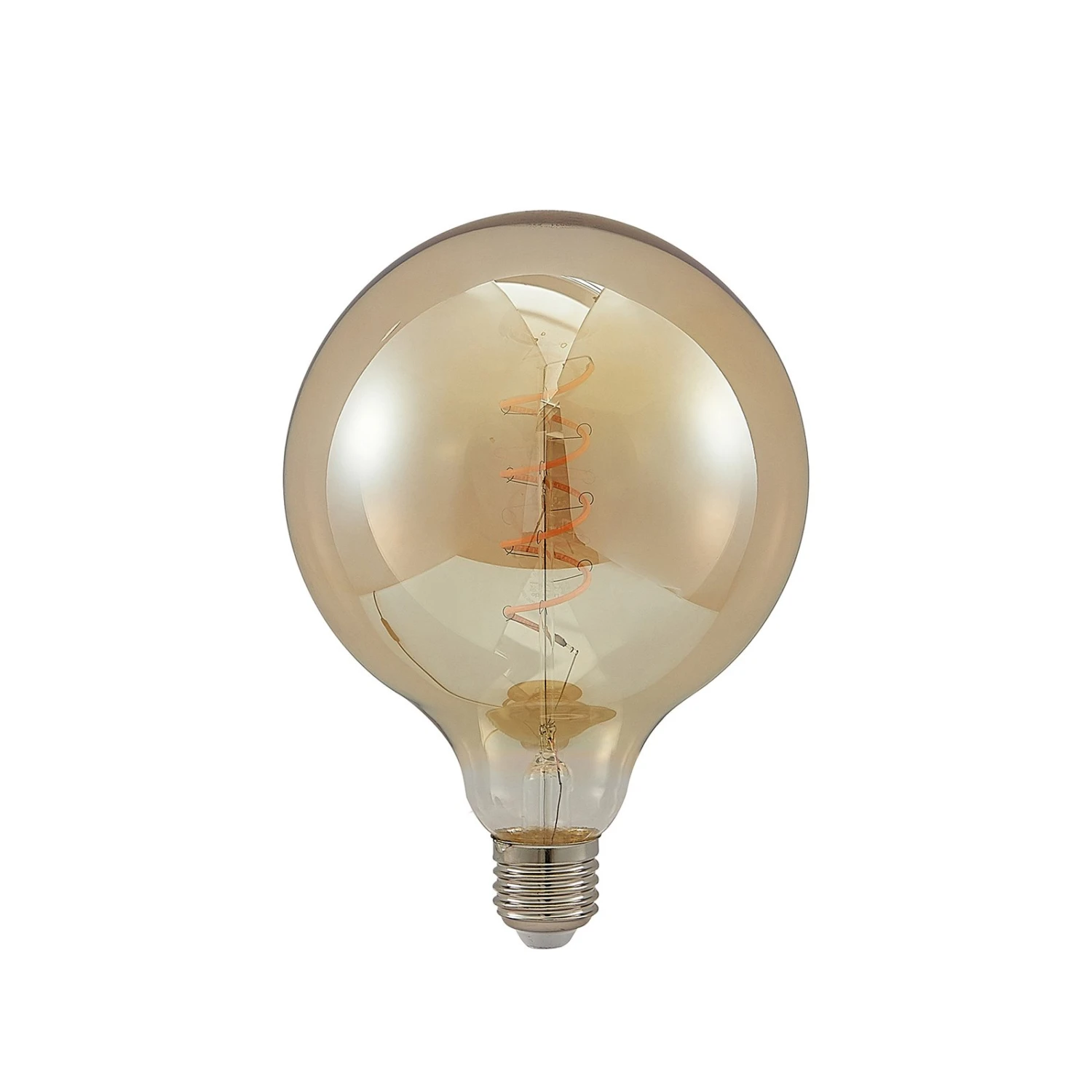 Mit ihrer stromsparenden Leistung von 4 Watt kann diese E27-LED-Globelampe eine gewöhnliche Glühbirne von bis zu 18 Watt ersetzen. Mit ihrer amberfarbenen Oberfläche wirkt sie sehr dekorativ. Der Filamentstab schwingt sich spiralförmig nach oben und verleiht der Lampe einen besonderen Look, der sich vor allem in Beleuchtungsobjekten mit einem offenen Leuchtenschirm sehen lassen kann. Bei Bedarf lässt sich die Lampe dimmen, sodass die Raumatmosphäre individuell angepasst werden kann. Die Farbwiedergabe ist mit dem hohen CRI von über 90 besonders gut.