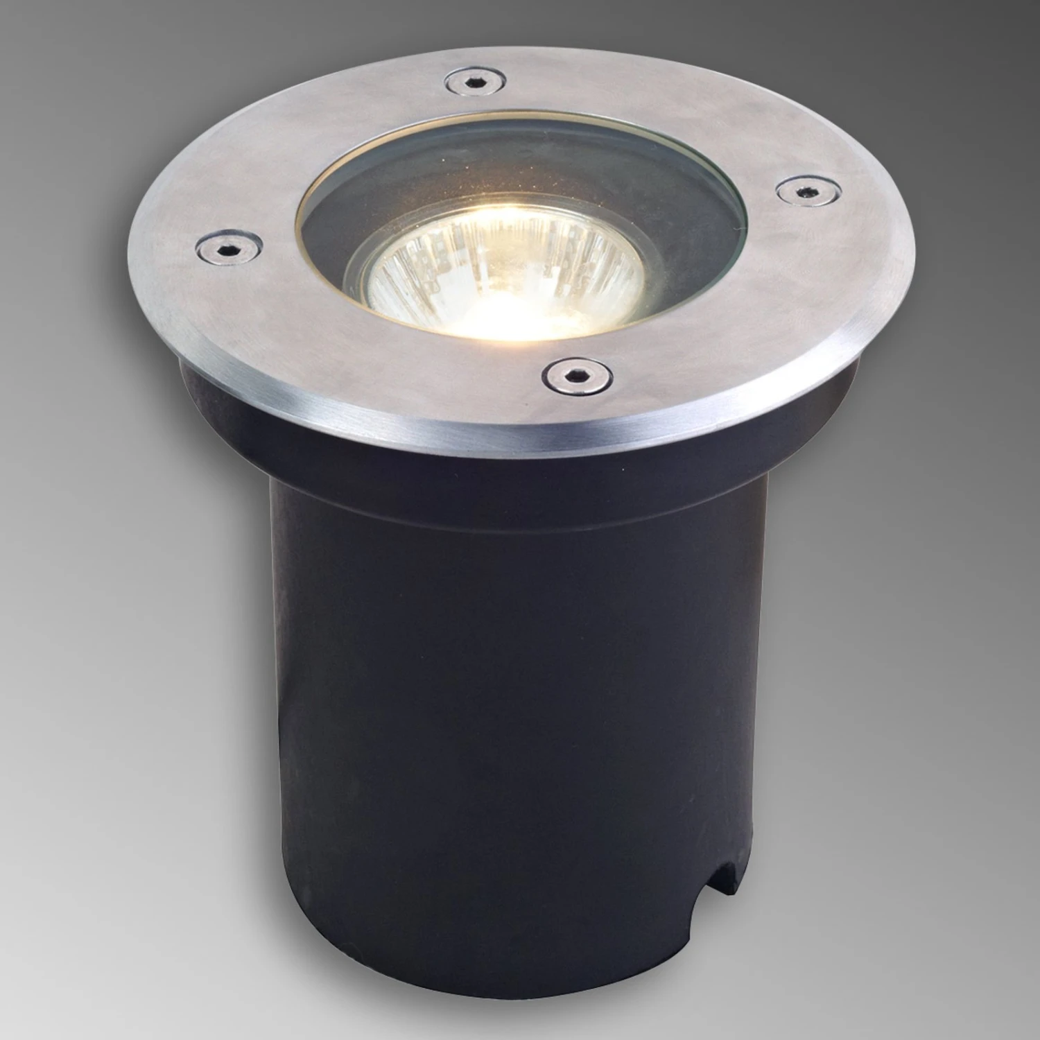 Wir empfehlen die Verwendung von LED-Leuchtmitteln aus unserem Zubehör in dieser Bodeneinbauleuchte. Bei Halogenlampen erhitzt sich die Oberflächen der Glasscheibe auf hohe Temperaturen.