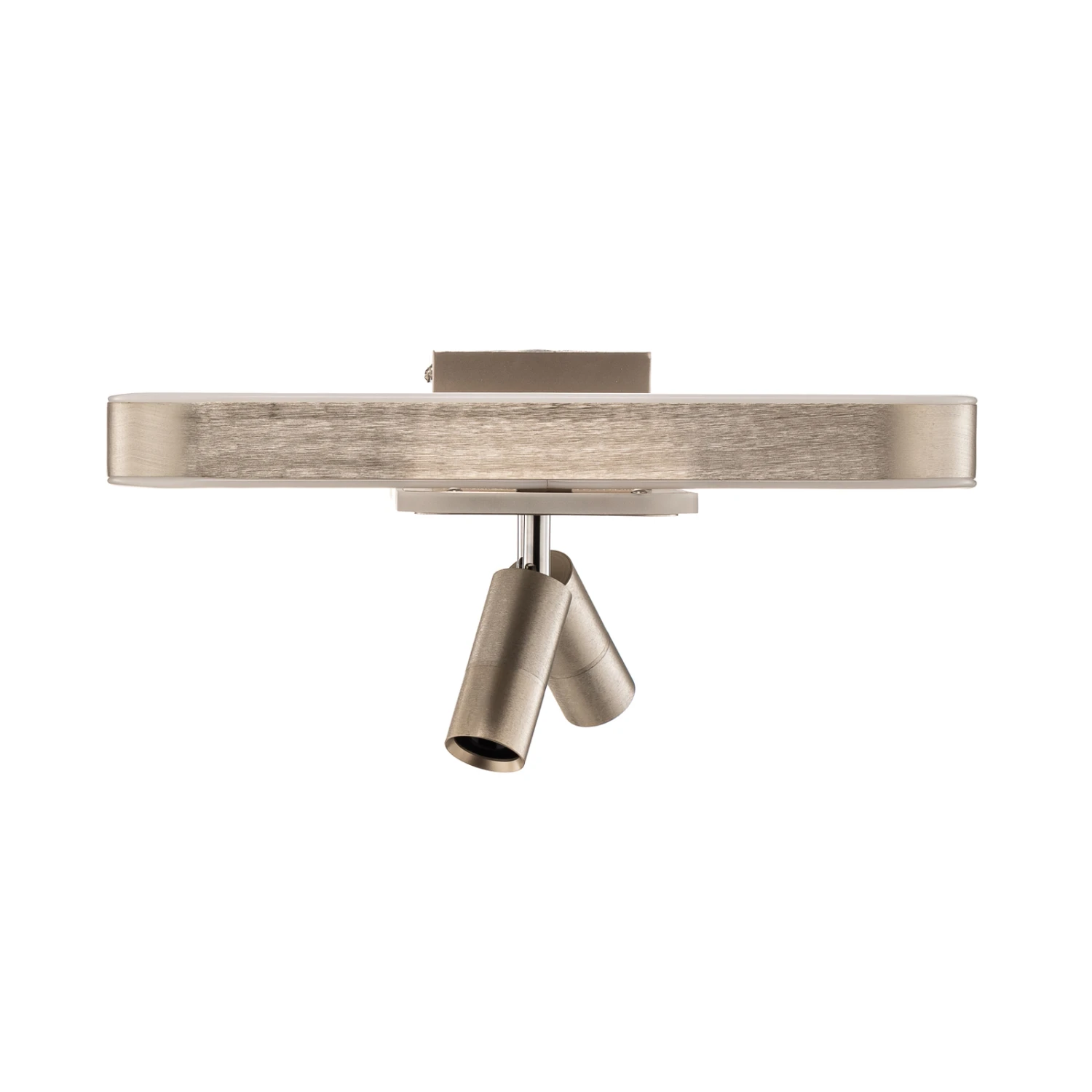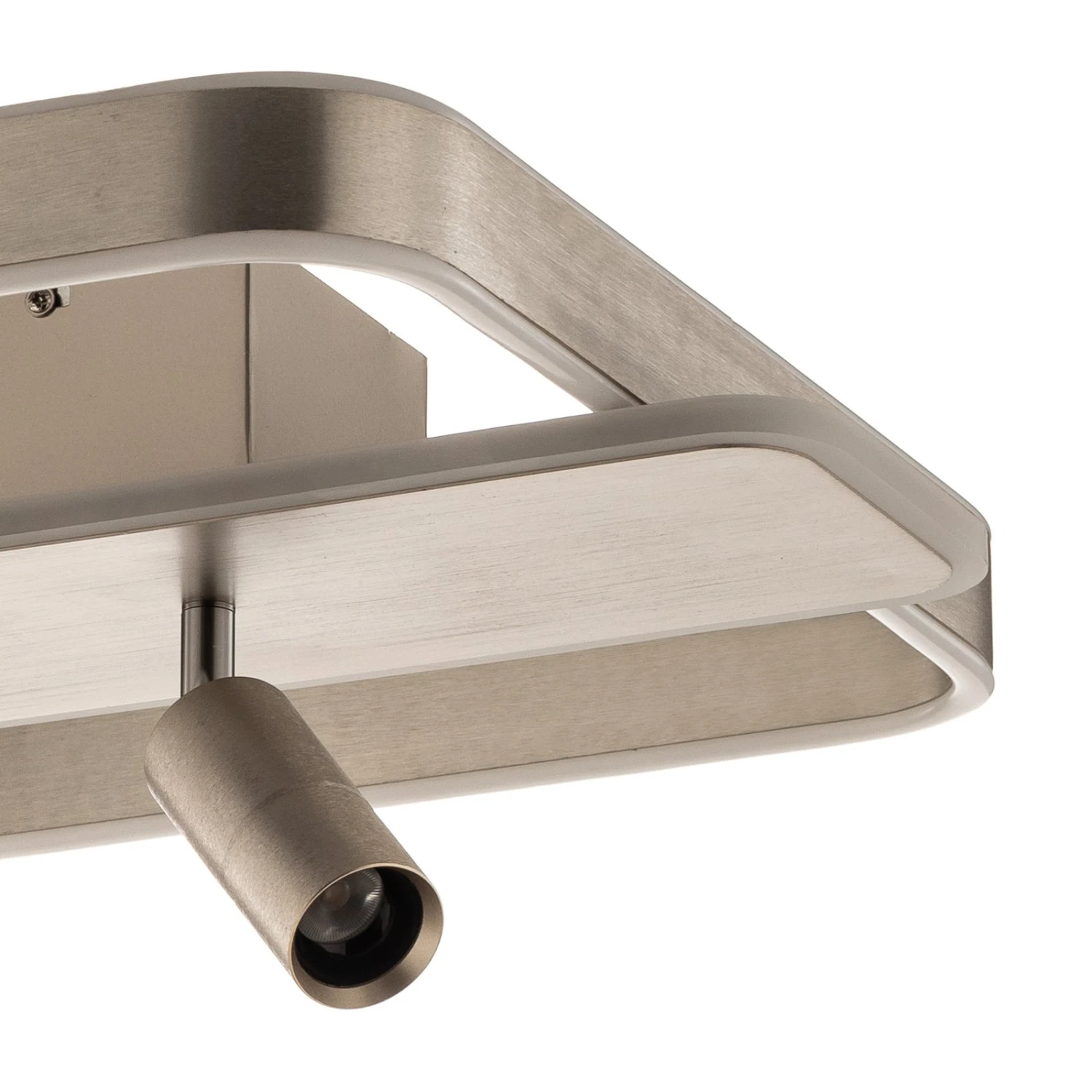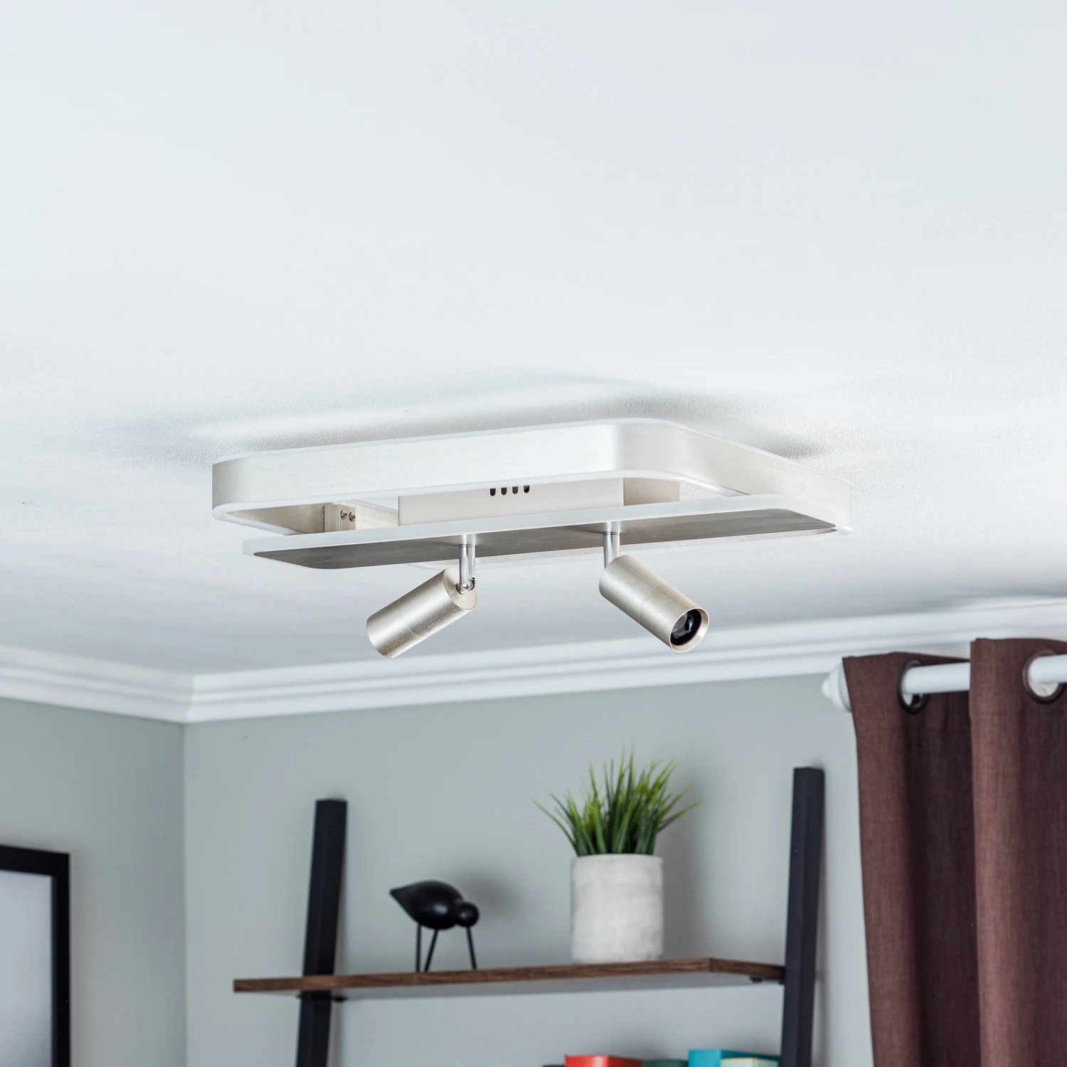 Stigla überzeugt mit einem zeitgemäßen Look, der gut zu modernen Einrichtungen passt. Der Rahmen, der mit LEDs bestückt ist, ist eckig und in Schwarz gehalten und er wird ergänzt von zwei Strahlern, die frei bewegt werden können, indem man sie dreht und schwenkt. Die Lichtquellen können entweder gemeinsam oder getrennt voneinander eingeschaltet werden. Dabei ist die Grundhelligkeit der LEDs so gut, dass man die Deckenlampe gut als Hauptbeleuchtung einsetzen und bei Bedarf um weitere Lichtquellen ergänzen kann. Wer möchte, kann die Leuchte jedoch auch dimmen. Für die Steuerung der Funktionen vorgesehen ist die beiliegende Fernbedienung. Die Oberfläche in einem gebürsteten Nickelton wirkt edel und stilvoll und ergänzt viele Stile auf passende Weise.