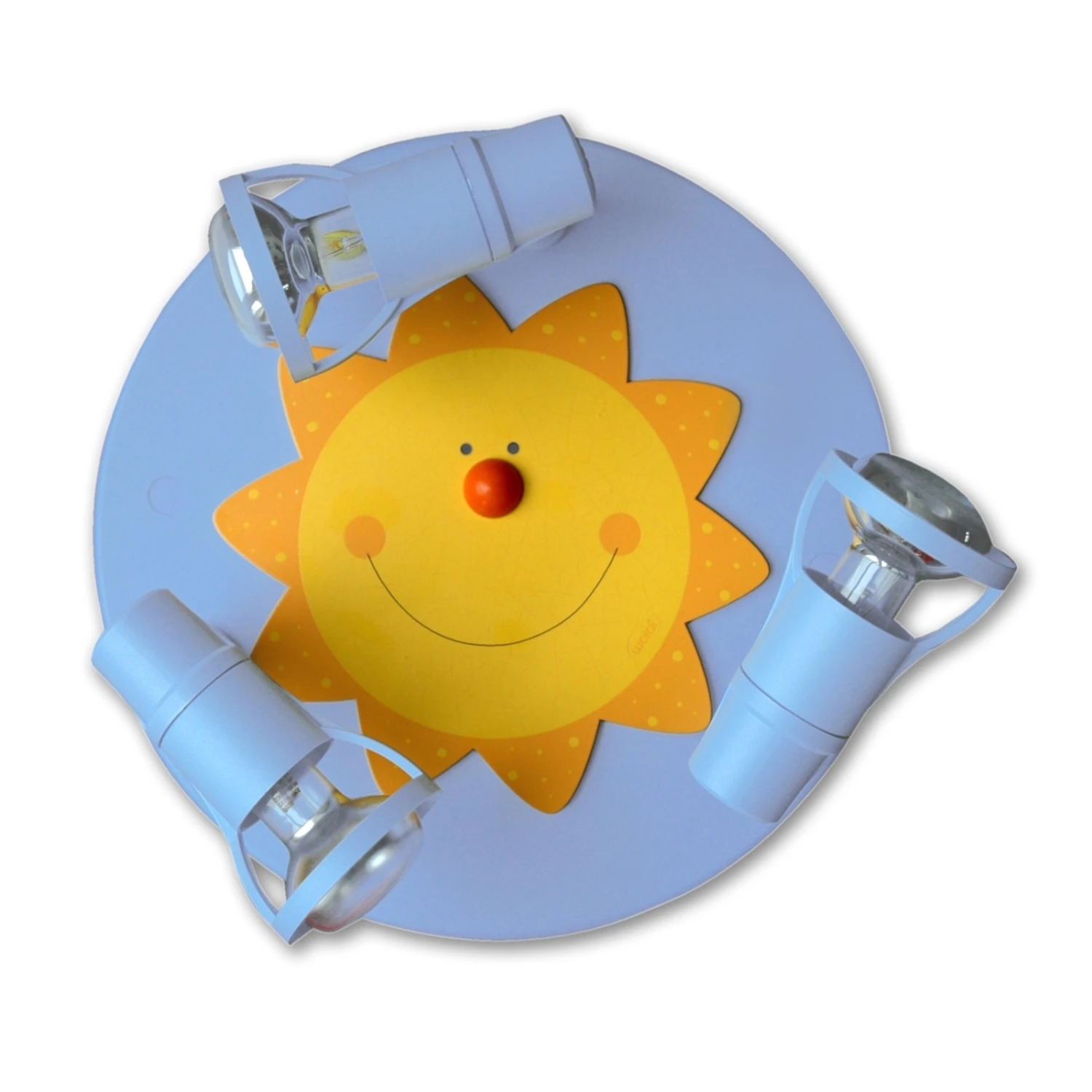 Die heitere Deckenleuchte Sonne wirkt aufgrund ihres runden Design und der grinsenden, gelben Sonne mit der roten Stupsnase sehr harmonisch. Die drei Lichtstrahler bieten eine ausgeglichene Beleuchtung, die auf verschiedene Weise eingestellt werden kann. Dabei kann das Licht sogar mit Hilfe eines Schalters gedimmt werden. Dadurch bildet die Deckenleuchte ein schönes und sehr nützliches Beleuchtungsobjekt, das fröhlich ins Kinderzimmer leuchtet. Mit dieser Deckenleuchte lacht in jedem Zimmer die Sonne, mit der die Kinder um die Wette strahlen können. Zahlreiche kindergerechte Materialien werden verwendet. Das lackierte Holz mit der heiteren Sonne leuchtet in bunten Farben wie Gelb, Orange und Blau, die fabelhaft miteinander harmonieren.