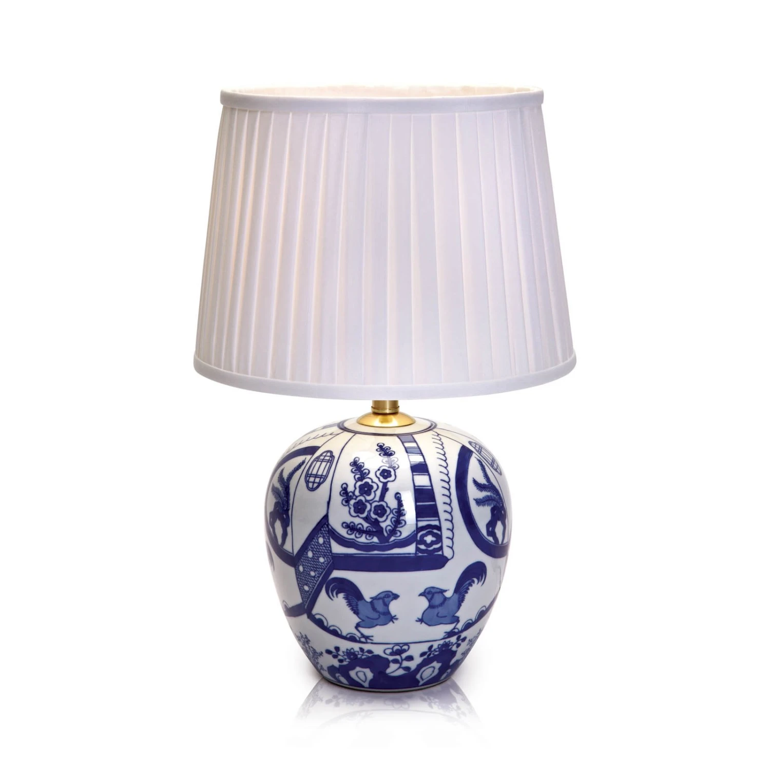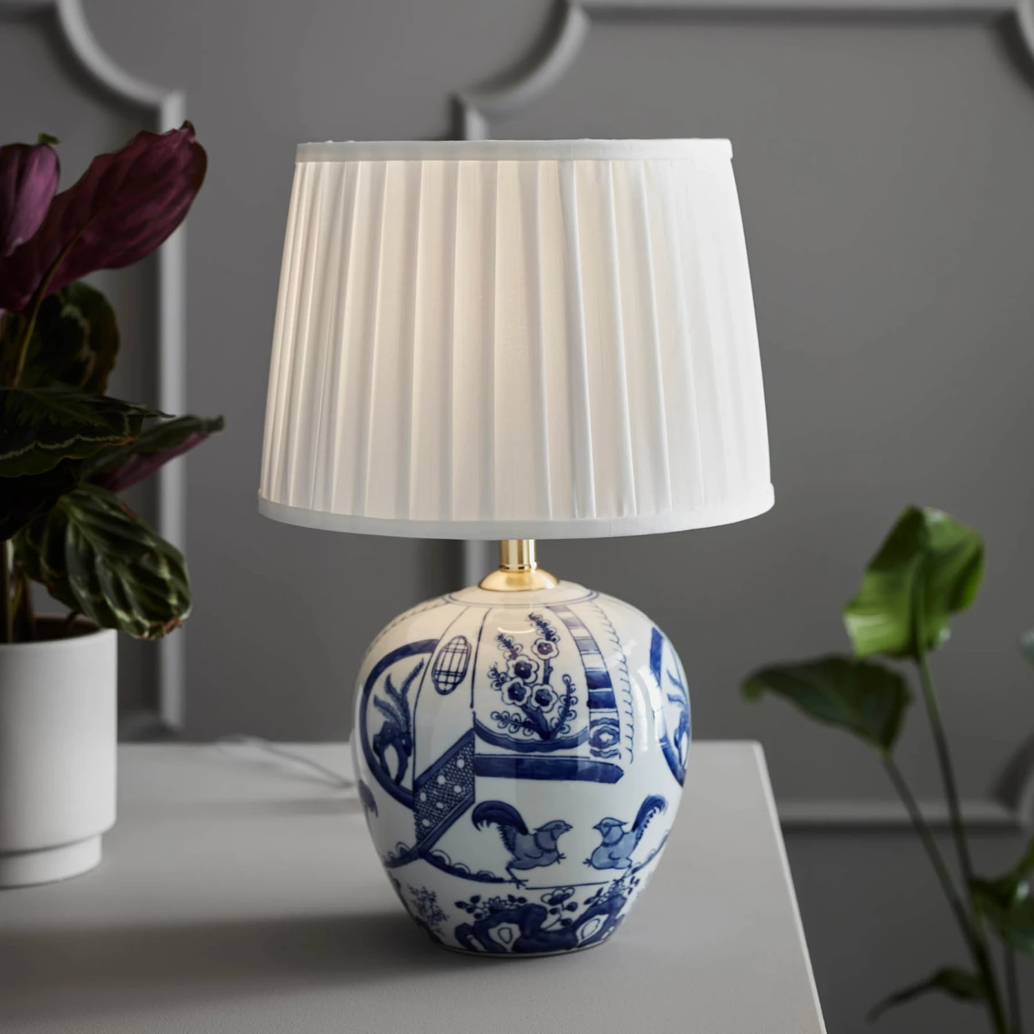 Göteborg: Tischleuchte mit extravaganter Optik Die Tischleuchte Göteborg sorgt durch ihren außergewöhnlichen Look im Wohnbereich oder Schlafzimmer für einen Blickfang. Bei diesem Modell wird ein bauchiges Gestell mit blau-weißem Motiv mit einem weißen Textilschirm verbunden. Angebracht sind Leuchtmittel und Schirm über ein vergoldetes Element. Als zusätzliche Beleuchtung ist die Tischleuchte hervorragend geeignet.