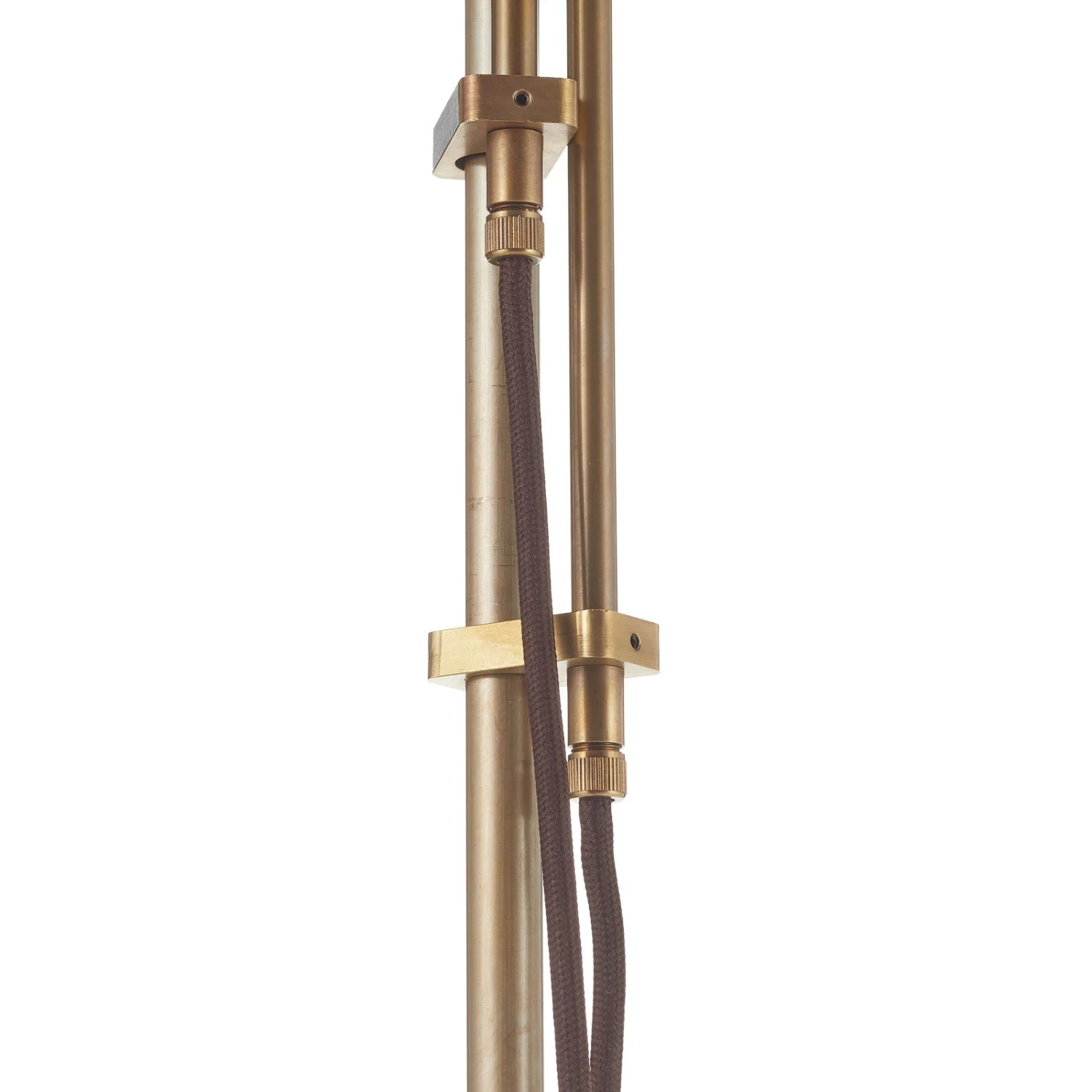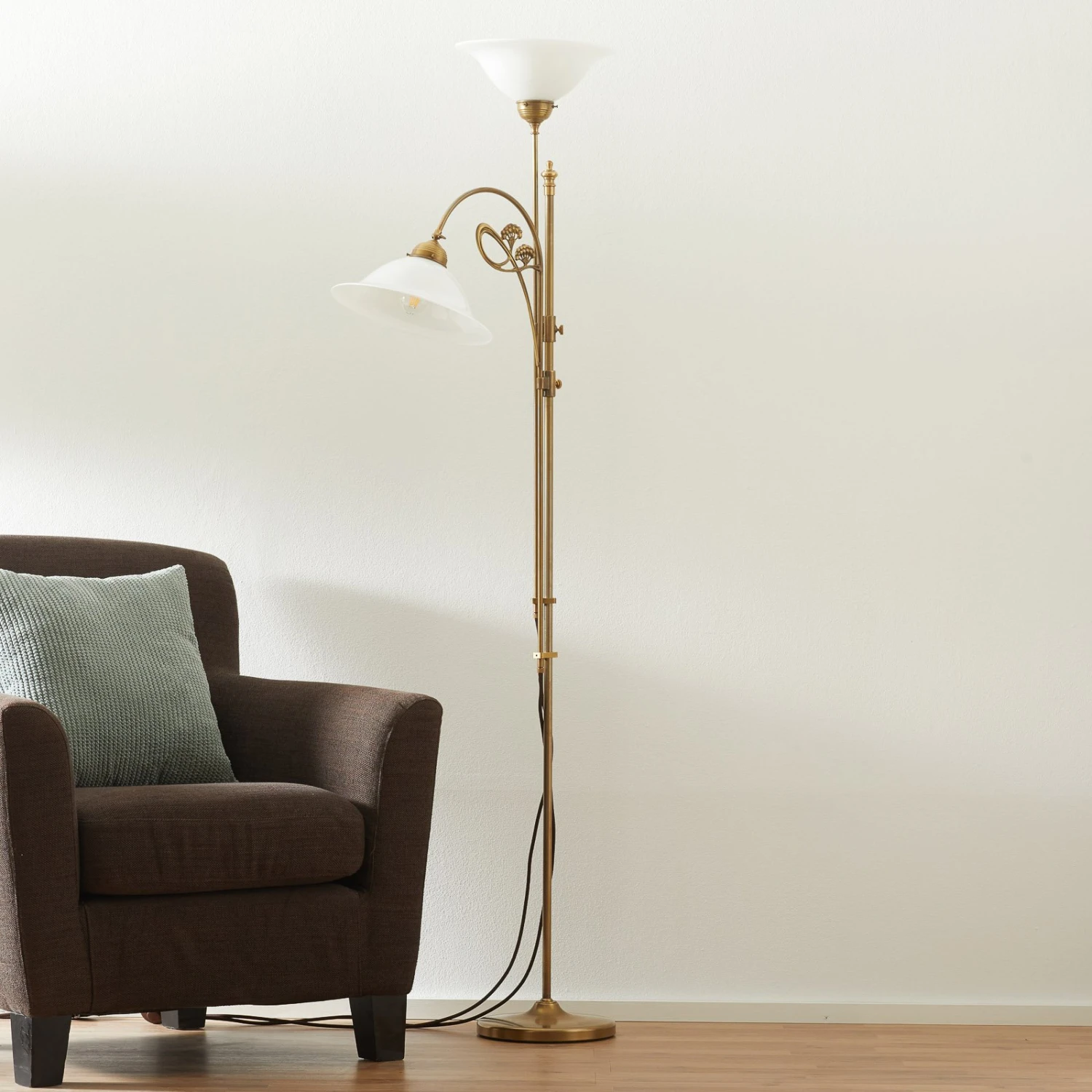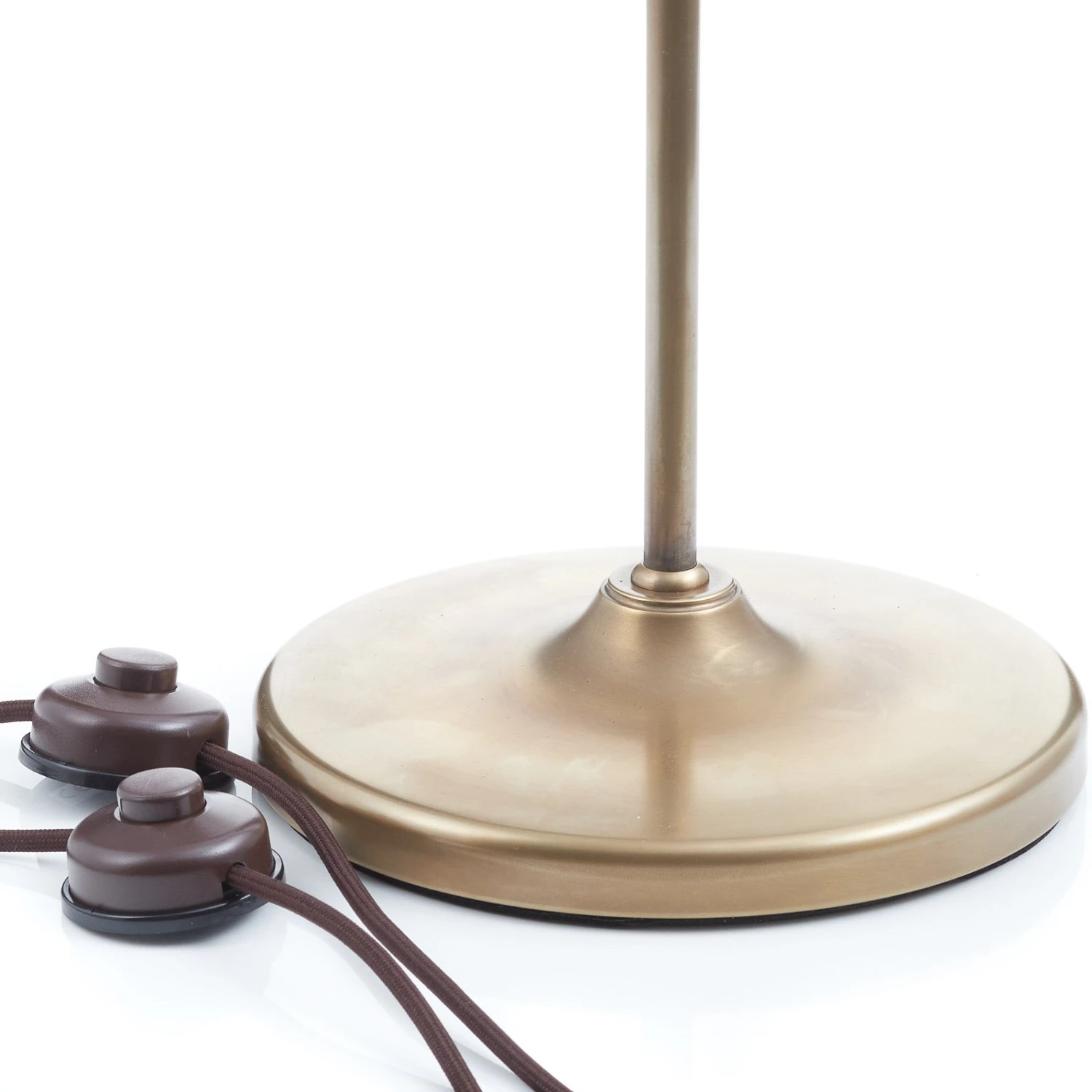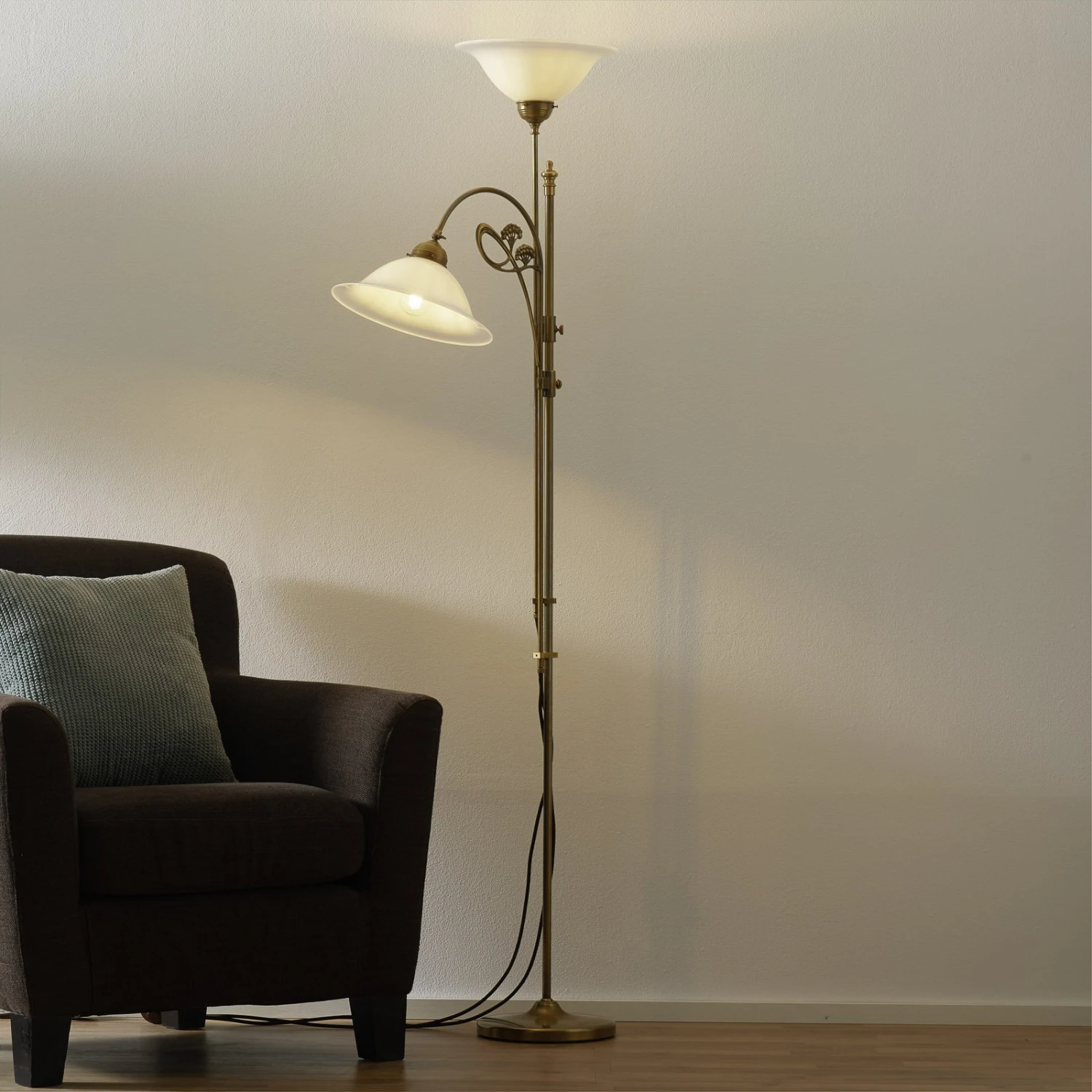Die an alte Vorlagen um 1900 angelehnte Stehleuchte ALWINE ist mit Lesearm und Fluter ausgestattet. Vorwiegend Messingteile werden von Hand mit dem Schirm aus mundgeblasenem Glas verbaut. Sogar das historisch anmutende Textilkabel passt zum Stil. Natürlich ist die Technik aber von heute! Die Arme lassen sich in der Höhe verstellen und sind mit einem Jugendstil-Dekoelement vervollständigt. Aus sogenanntem Berliner Messing wurde das Gestell gefertigt; eine nicht lackierte Patina sorgt für eine robuste Oberfläche. Die Reinigung erfolgt mit einem weichen Tuch ohne Putzmittel.