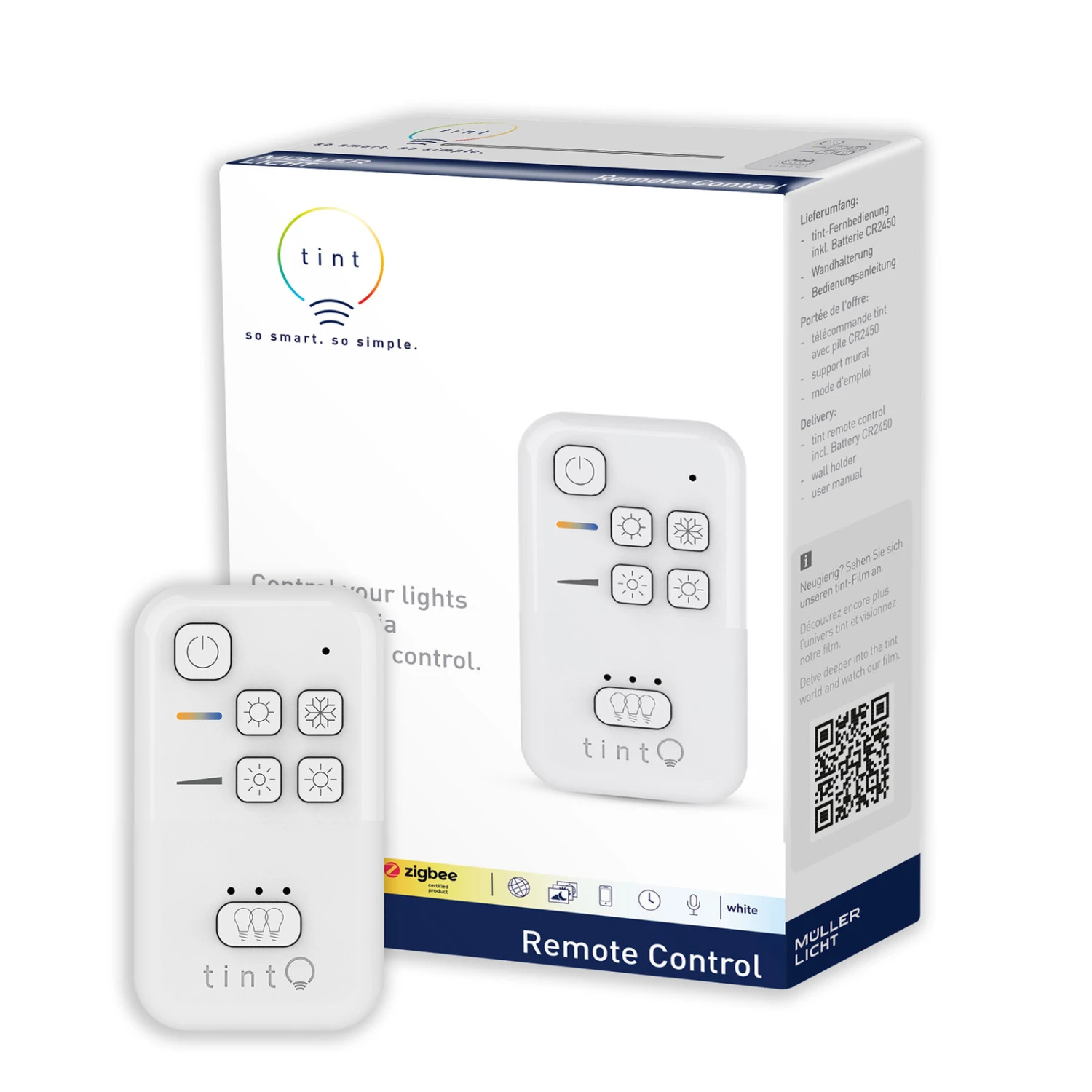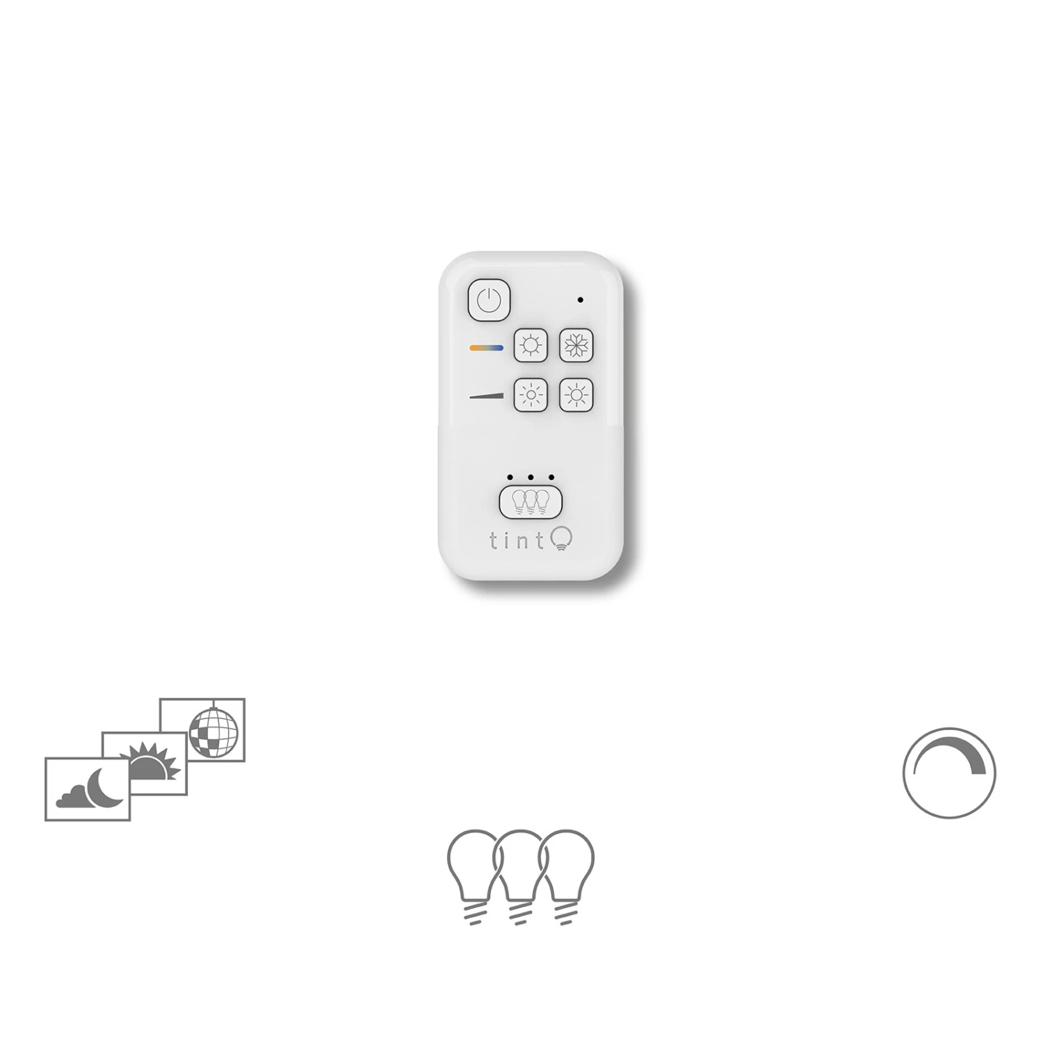Mit der kleinen, kompakten Fernbedienung der Serie tint können alle passenden Leuchtmittel und Lampen mit Weißlichtsteuerung, also sogenannte tint „white“-Produkte, gesteuert werden. Ob das Einstellen des Weißtons von warm zu kalt, das Dimmen des Lichts oder auch das Gruppieren mehrerer Leuchten, dies alles ist neben dem klassischen Ein- und Ausschalten mit der kleinen Fernbedienung möglich. Die vielfältigen Möglichkeiten bietet einen großen Komfort und machen die Bedienung der smarten tint-Lampen spielend leicht und intuitiv.