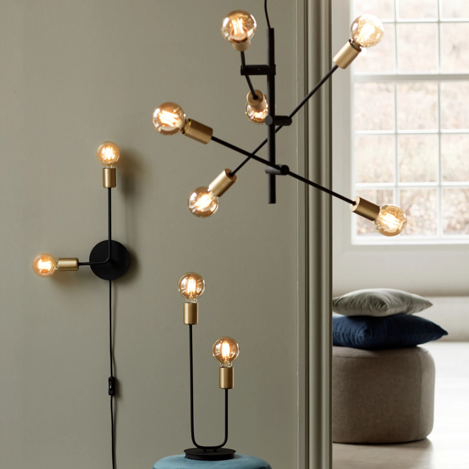 Die Tischleuchte Josefine ist ein stimmungsvolles Highlight für den modern gestalteten Innenbereich. Auf dem Beistelltisch oder der Fensterbank platziert und mit dekorativen Filament-Lampen ausgestattet, dient Josefine als attraktives Element der Einrichtung. Die Lampenfassungen sind mit messingfarbenen Zylindern ummantelt, die von zwei verschieden hohen Stäben eines schwarzen, U-förmigen Gestells getragen werden, welches auf einem runden Sockel steht. Die Bedienung erfolgt über den Schalter am Kabel.