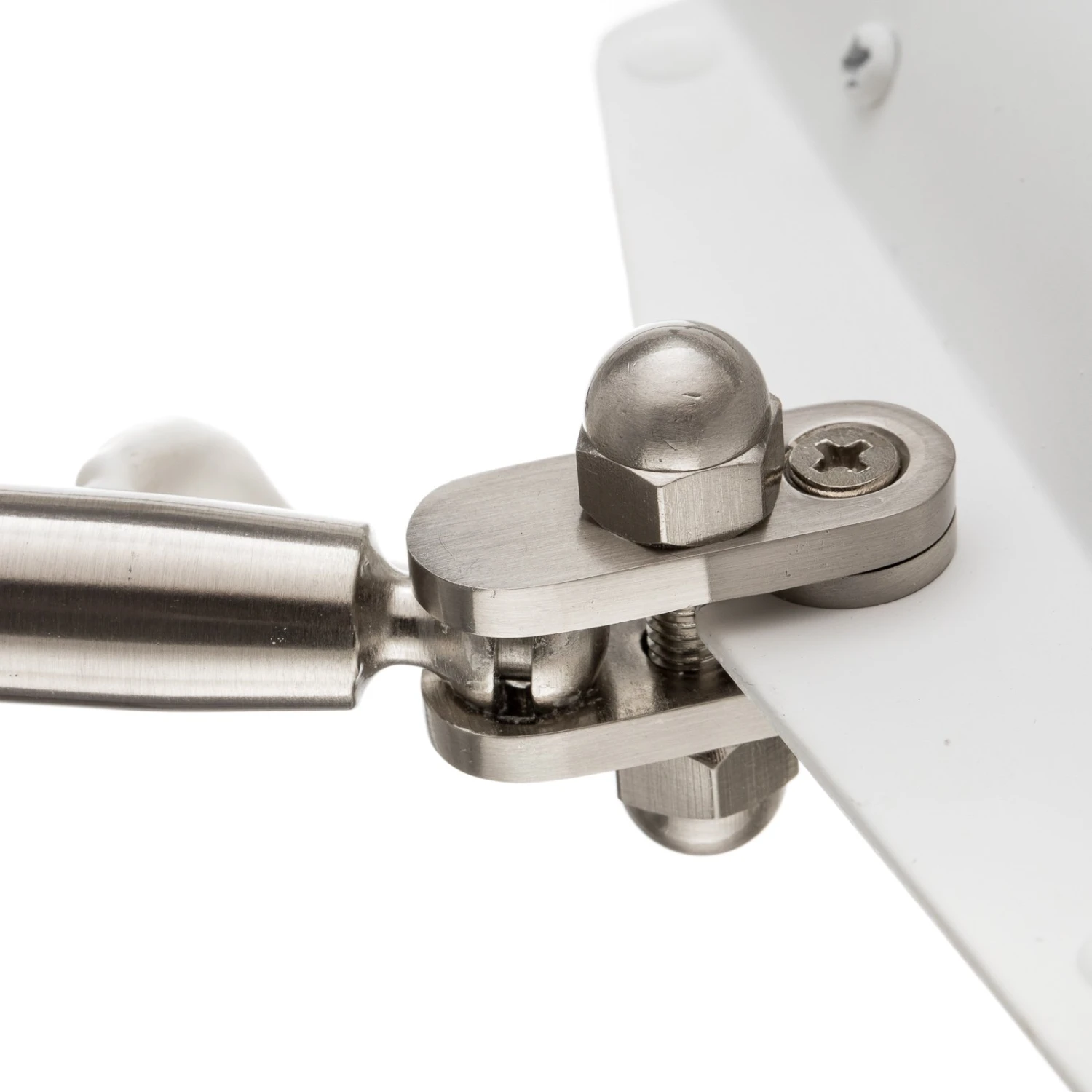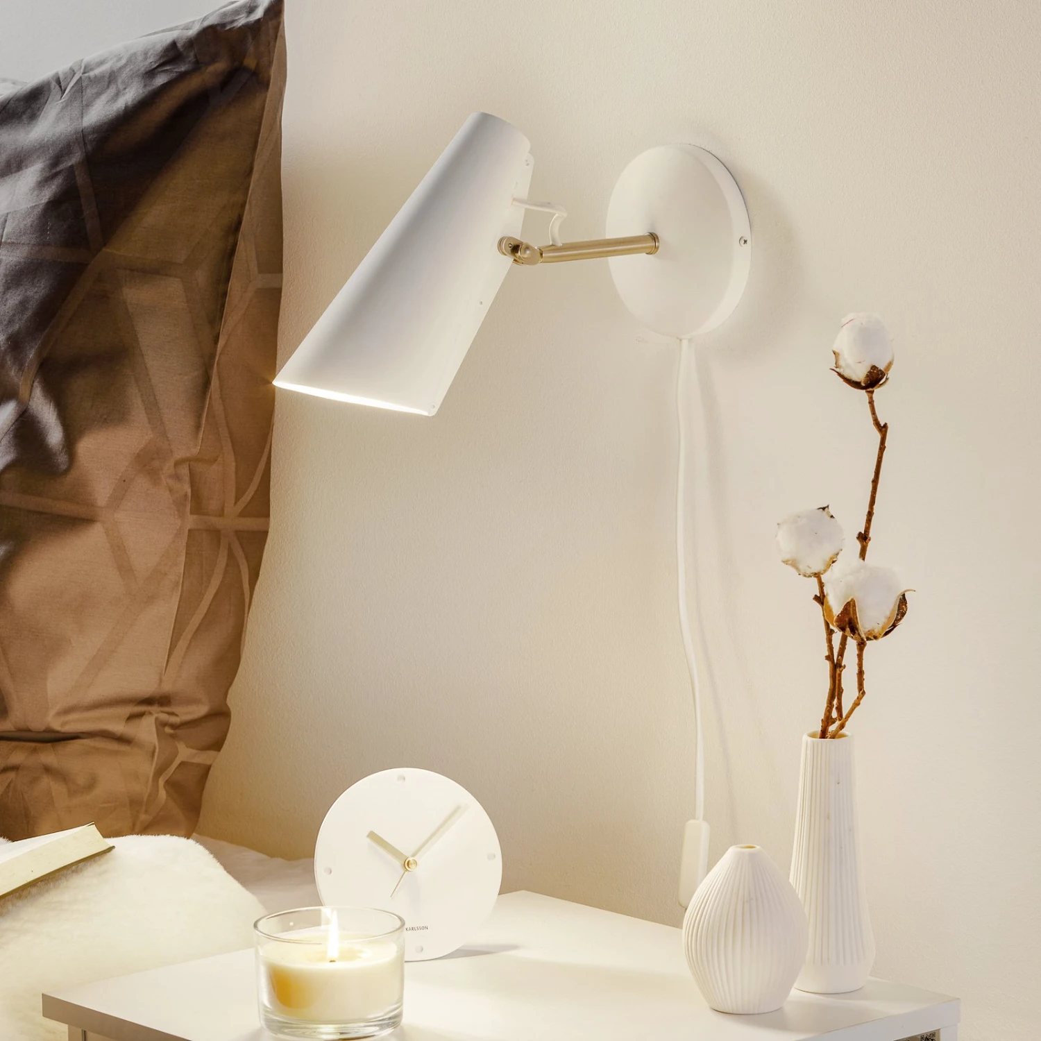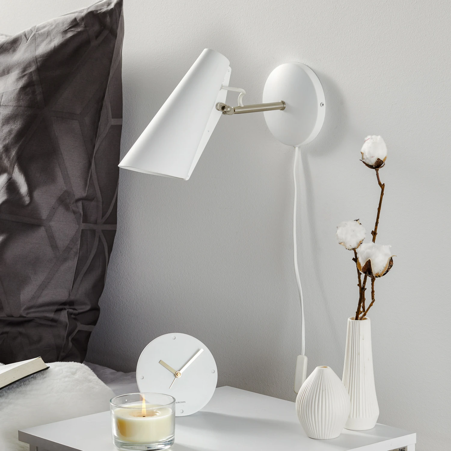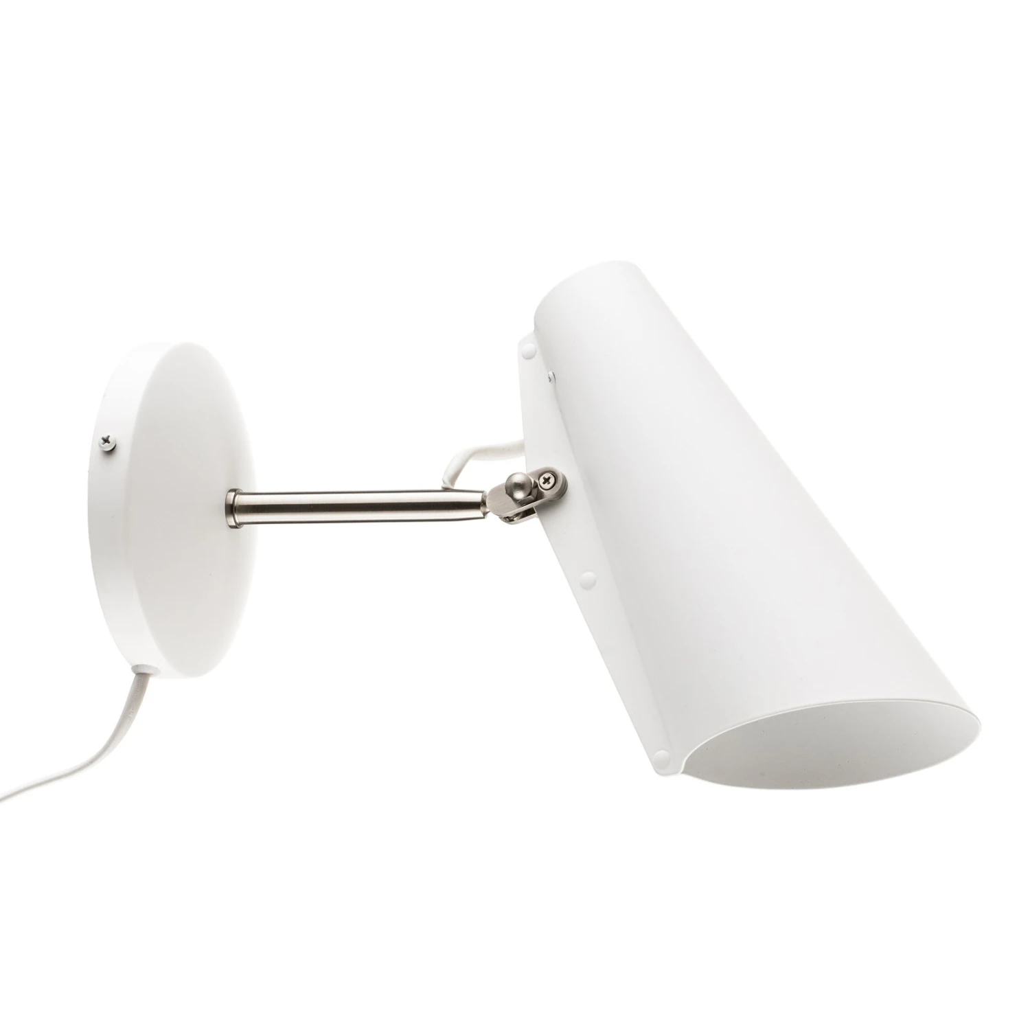 Die Wandleuchte Birdy ist im Retro-Stil gehalten. Sie hat einen stilvoll geformten, weißen Leuchtenschirm, welcher an einem silbernen Arm befestigt ist. Im Übergang befindet sich ein Gelenk, dank dem die Wandleuchte ganz leicht eingestellt werden kann. Die Wandhalterung ist wie der Schirm in Weiß gehalten und hat einen Durchmesser von 12,5 cm. Die Wandleuchte Birdy hat eine 200 cm lange Zuleitung (weiß) mit Stecker und Kippschalter.