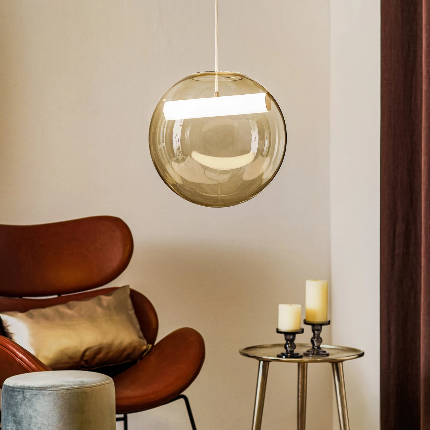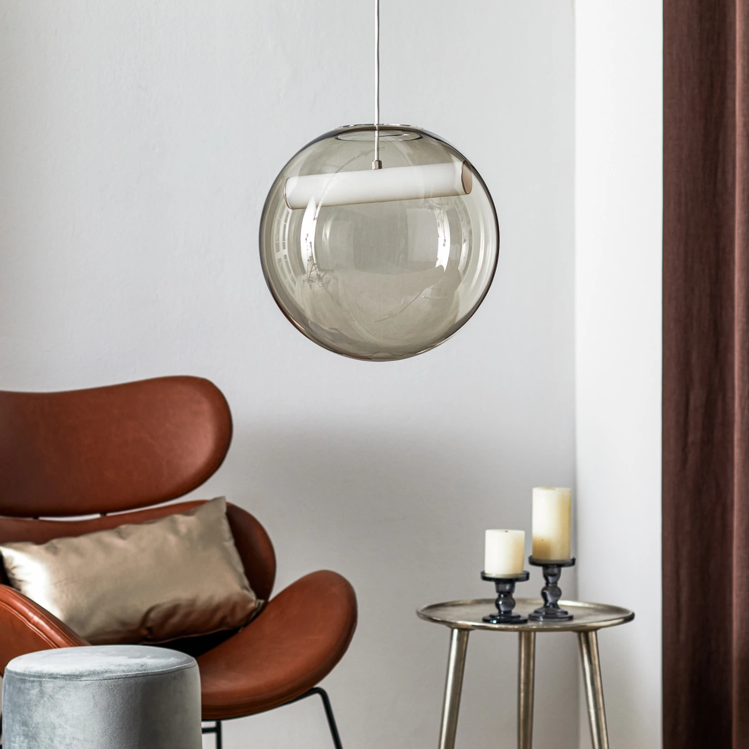 Diese LED-Hängeleuchte mit dem kugelförmigen Schirm aus mundgeblasenem Glas wird in jedem Raum zum dekorativen Blickfang, und das bereits unbeleuchtet. Der Entwurf für diesen unvergleichlichen Lichtspender mit dem röhrenförmigen LED-Lichtelement im Inneren stammt von der Designerin Silje Nesdal, die in den norwegischen Fjorden aufgewachsen ist und die Handwerkstraditionen ihrer Heimat, was Textildesign und Holzverarbeitung betrifft, mit ihrer Erfahrung in Bezug auf Möbeldesign, Innenarchitektur, Mode und Textilien kombinierte. Es entstand eine schlichte und zeitlos-elegante Hängelampe, die jeden modernen Einrichtungsstil bereichert und eine sehr stimmungsvolle Lichtwirkung bietet.