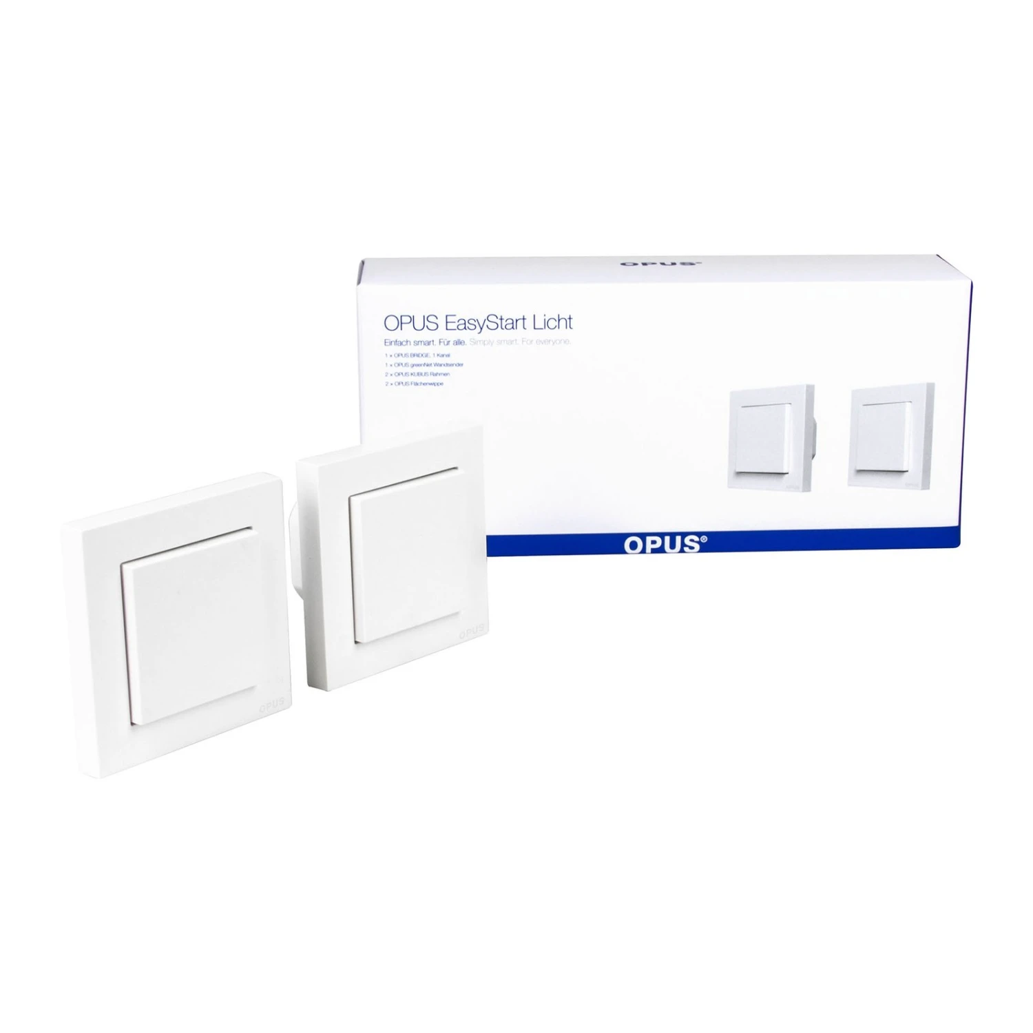 Das OPUS EasyStart Licht Starter Set ist eine vorkonfigurierte und einbaufertige Lösung, die Leuchten im Raum auf einfachste Weise steuern kann. Dazu wird der Unterputzlichtschalter OPUS Bridge 1 Kanal an der Stelle des bisherigen Lichtschalters eingebaut. Mit seiner Bauform passt er dabei in jede gängige Unterputzdose und kann ohne viel Staub, Schmutz und Renovierungsaufwand von einer Elektrofachkraft installiert werden. Ein passender kabel- und batterieloser Wandsender ist im StarterSet inklusive. Dieser kann frei positioniert werden, zum Beispiel am Bett, an der Wand oder einem Möbelstück und das wahlweise verschraubt oder mittels Selbstklebefolie. Für beide, Bridge und Wandsender, gibt es jeweils den passenden Rahmen und die Wippe in Weiß dazu.