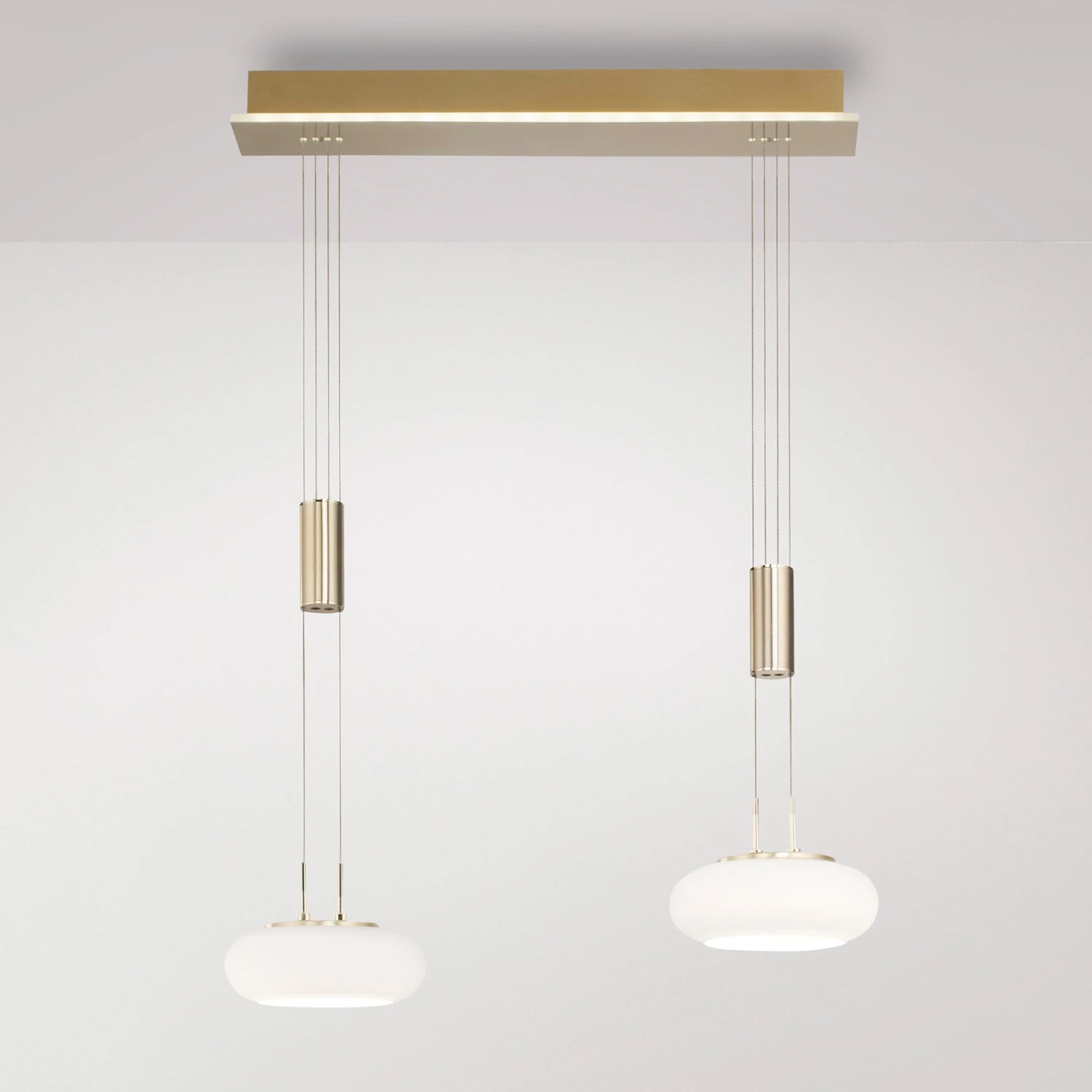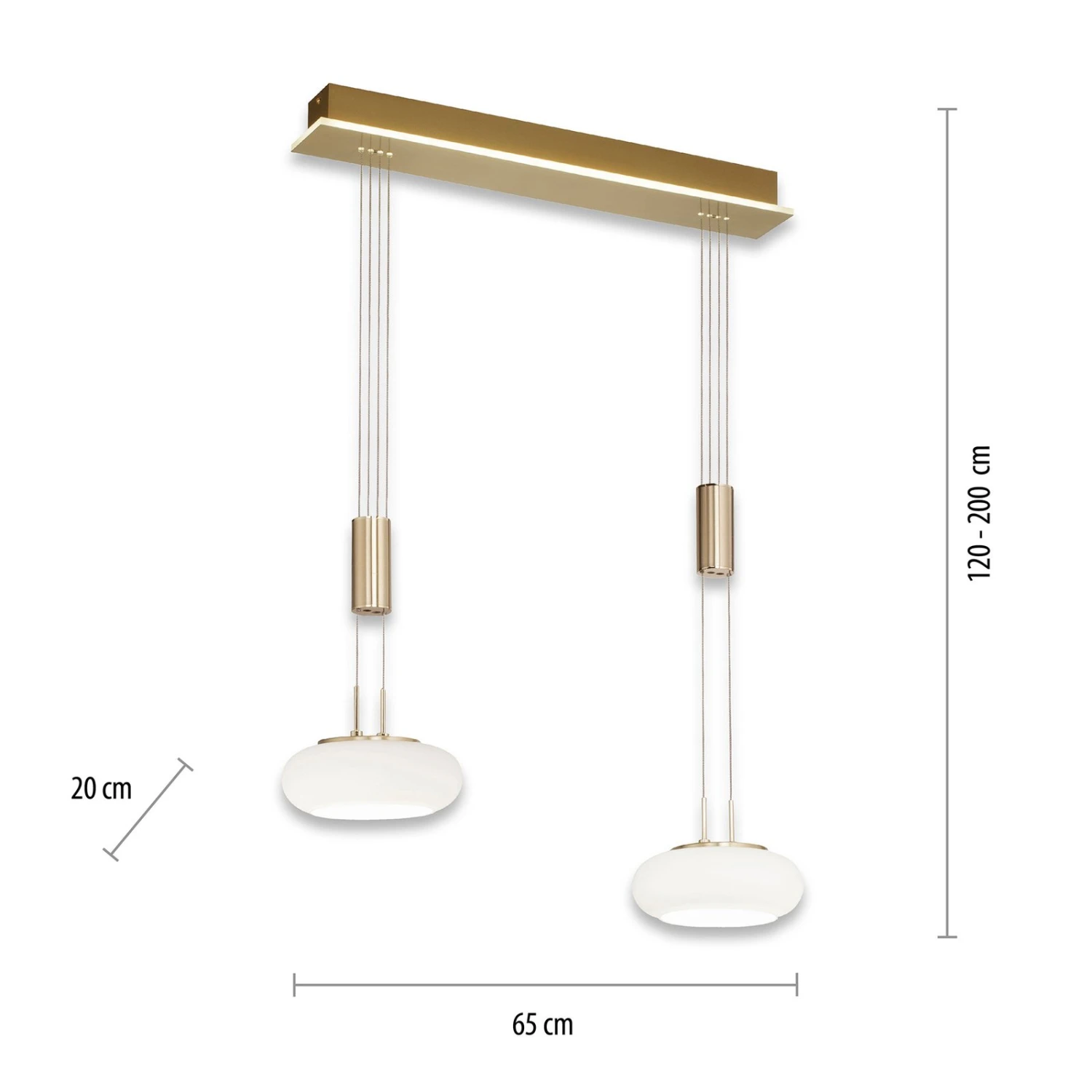 Die LED-Hängeleuchte Q-ETIENNE überzeugt durch ihr klassisches, zeitloses Design mit dem sie flexibel eingesetzt werden kann, beispielsweise über dem Wohn- oder Esszimmertisch. Von dem rechteckigen, beleuchteten Baldachin hängen zwei ovale Glasschirme hinab, die jeweils über einen Seilzug in der Höhe verstellt werden können. Die Pendellampe wird mit der beiliegenden Fernbedienung gesteuert. Über diese kann sie gedimmt werden, außerdem ist es möglich die Lichtfarbe von warm- zu universalweiß zu variieren, verschiedene Lichtszenen anzuwählen oder die Memory-Funktion zu nutzen. Q-ETIENNE ist zudem ZigBee-fähig und lässt sich in ein entsprechendes Smart-Home-System einbinden. Anschließend kann die Hängeleuchte auch per App oder Sprachbefehl gesteuert werden.