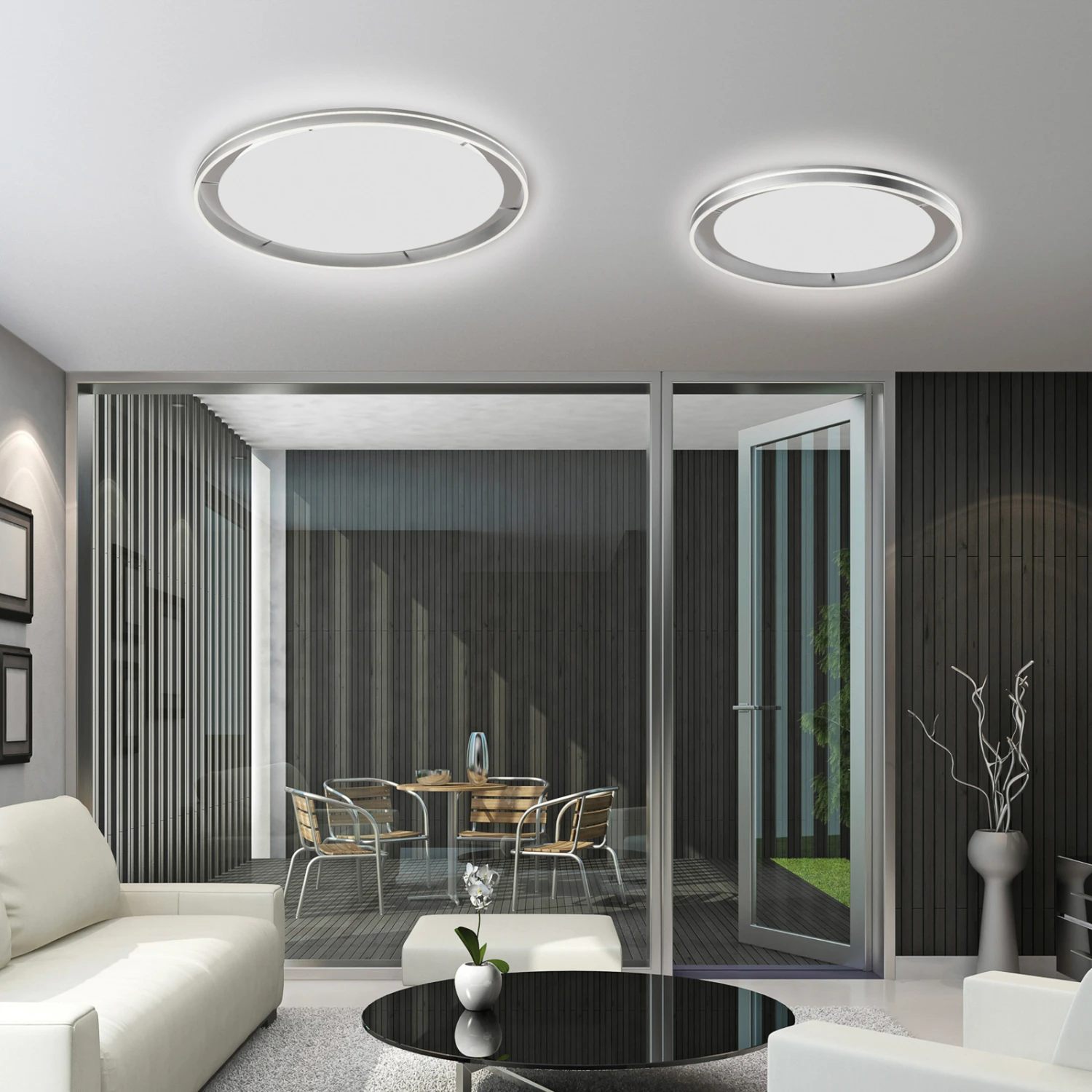Der kreisförmige Rahmen aus Metall, welcher mit zwei seitlich und nach unten orientierten leuchtenden Ringen ausgestattet ist, verleiht der LED-Deckenleuchte eine moderne Optik. Diese geht Hand in Hand mit nützlichen technischen Features.
