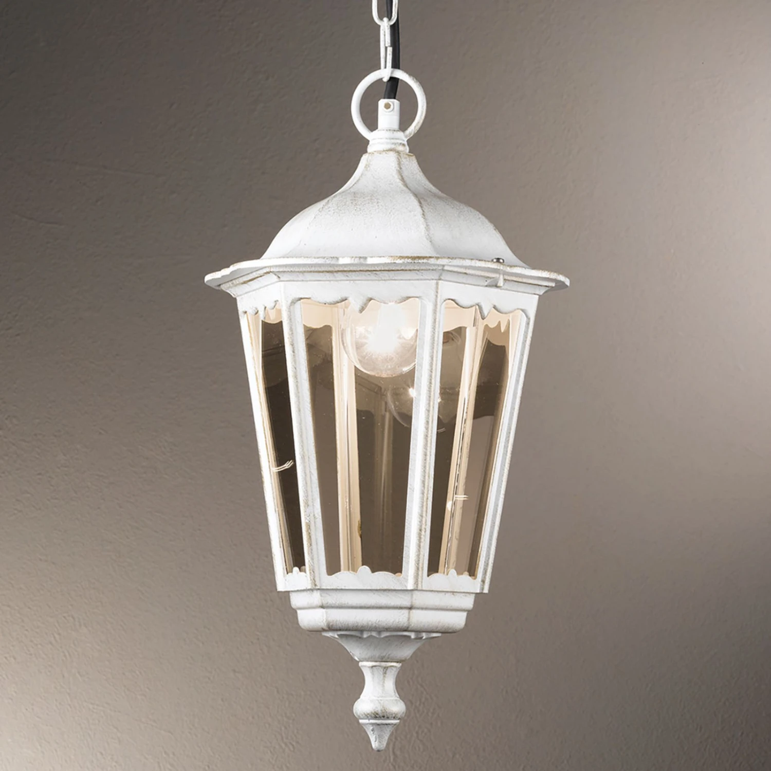 Das klassische, antike Design der Hängeleuchte Puchberg macht sie im Tageslicht zum Blickfang im Eingangsbereich oder unter der Pergola. Nachts beleuchtet sie zuverlässig die Umgebung und gewährleistet Sicherheit auf Zuwegen. Das Gestell der Leuchte Puchberg ist aus Aluminiumdruckguss gefertigt und wird durch rauchgraue Glaselemente stilvoll ergänzt. Die Farbgestaltung in Weiß und Gold erzeugt einen edlen Touch und untermauert den antiken Stil. Eingesetzt werden muss ein Leuchtmittel mit E27-Sockel, das über das Zubehör erhältlich ist.