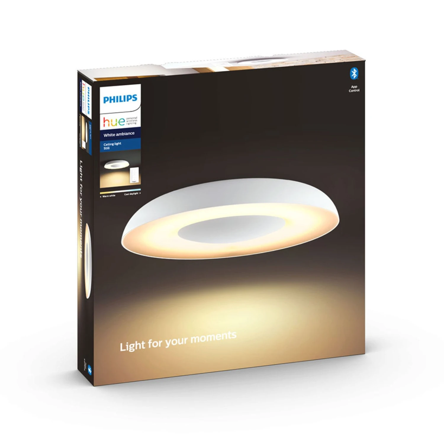 Mit der Philips Hue LED-Deckenleuchte Still, die aus hochwertigen und langlebigen Materialien besteht, lassen sich einzigartige Lichtmomente erzeugen, die ebenso gemütlich wie auch intensiv und kraftvoll wirken können. Je nach Einstellung der Lichtintensität und Farbabstufung der LEDs lässt sich das Raumklima dadurch positiv beeinflussen und nach Belieben verändern. Eine Steuerung ist über den mitgelieferten Dimmschalter als auch über ein vorhandenes Smart-Home-System möglich. Bei der Integration in ein Smart-Home-System sollte allerdings beachtet werden, dass eine Hue-Bridge – die den stetigen Kontakt zum heimischen WLAN-Router hält – benötigt wird (siehe Zubehör). Ohne ein Smart-Home-System ist alternativ die Steuerung via Bluetooth und der passenden, kostenfreien Hue Bluetooth-App möglich.