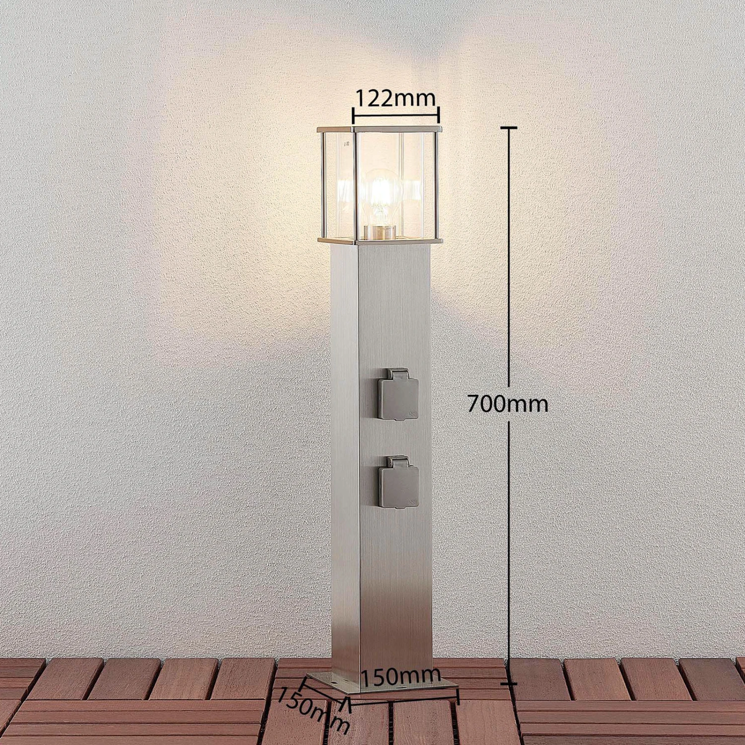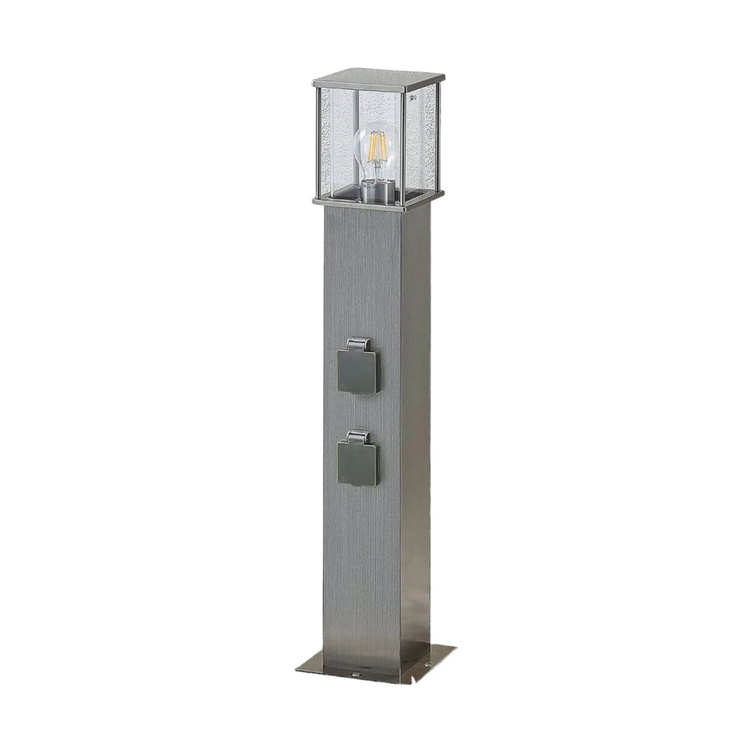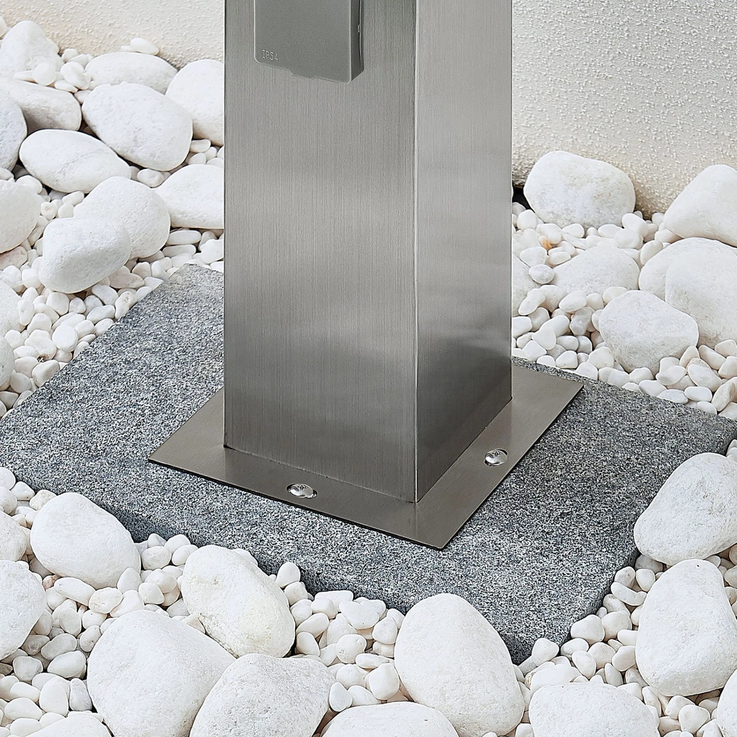 Praktisch für Hof und Garten: die Edelstahl-Pollerlampe Caspa mit zwei integrierten Steckdosen