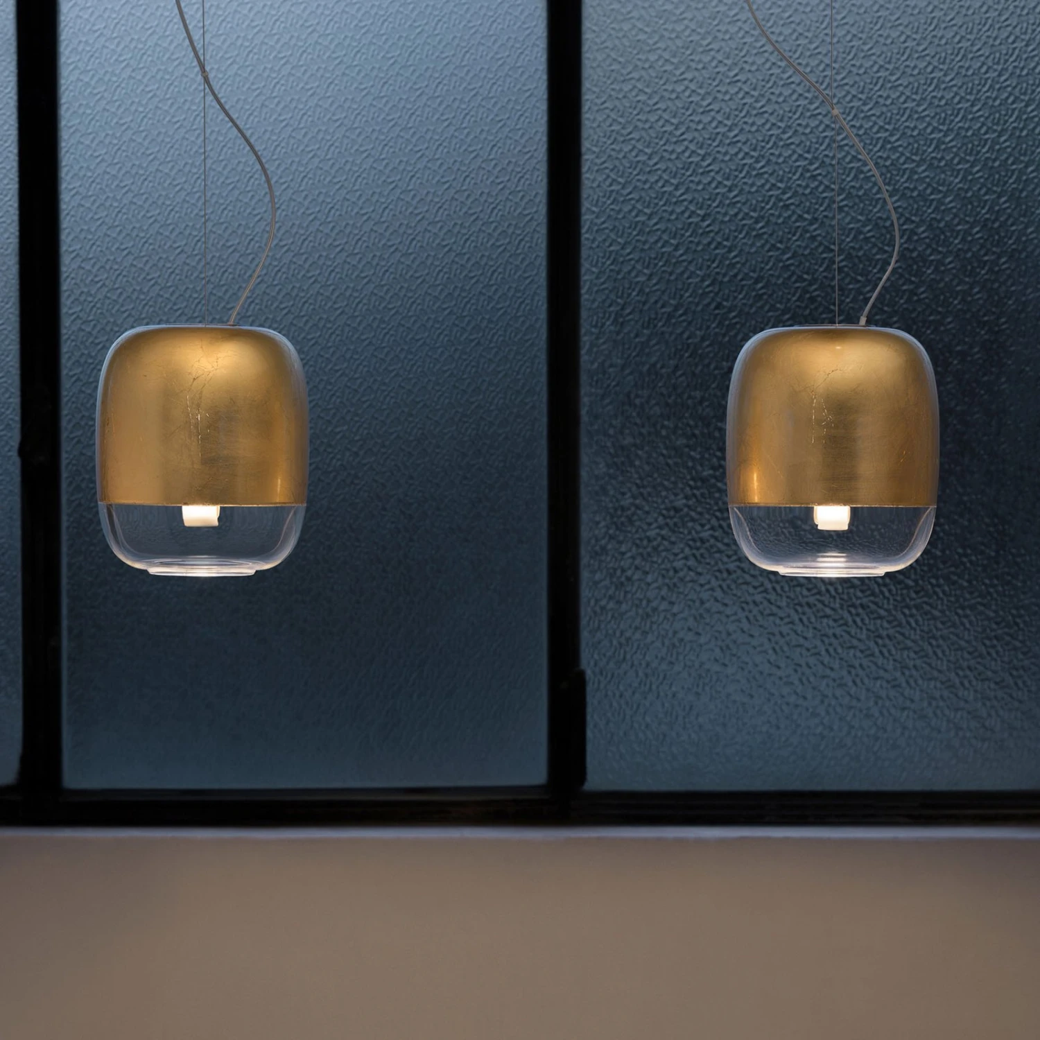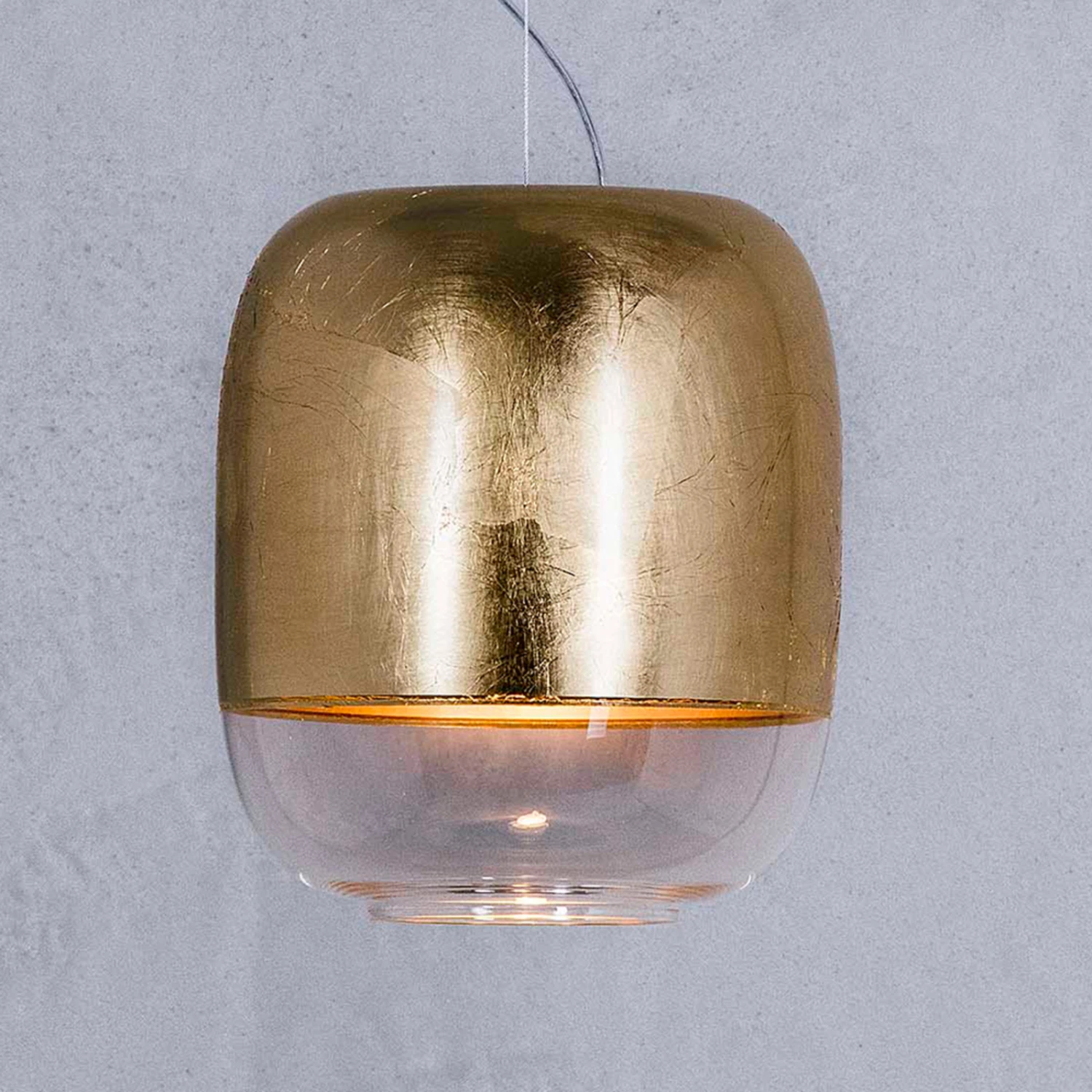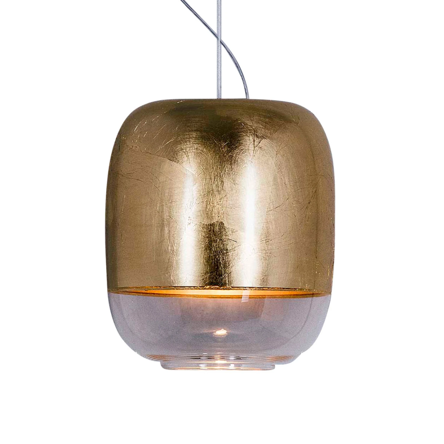 Der Schirm der Hängeleuchte Gong S1 besteht aus mundgeblasenem Glas in kontrastreicher Gestaltung. Im unteren Bereich ist der Schirm transparent, der obere Teil wurde farbig, teils metallisiert gestaltet. Als einzelne Leuchte bietet sie sich zur Beleuchtung kleiner Tische an, zu mehreren angebracht, erhellt sie auch einen langen Tresen oder auch große Tische, sowohl im privaten Bereich als auch im Bereich von Gastronomie oder Hotellerie.
