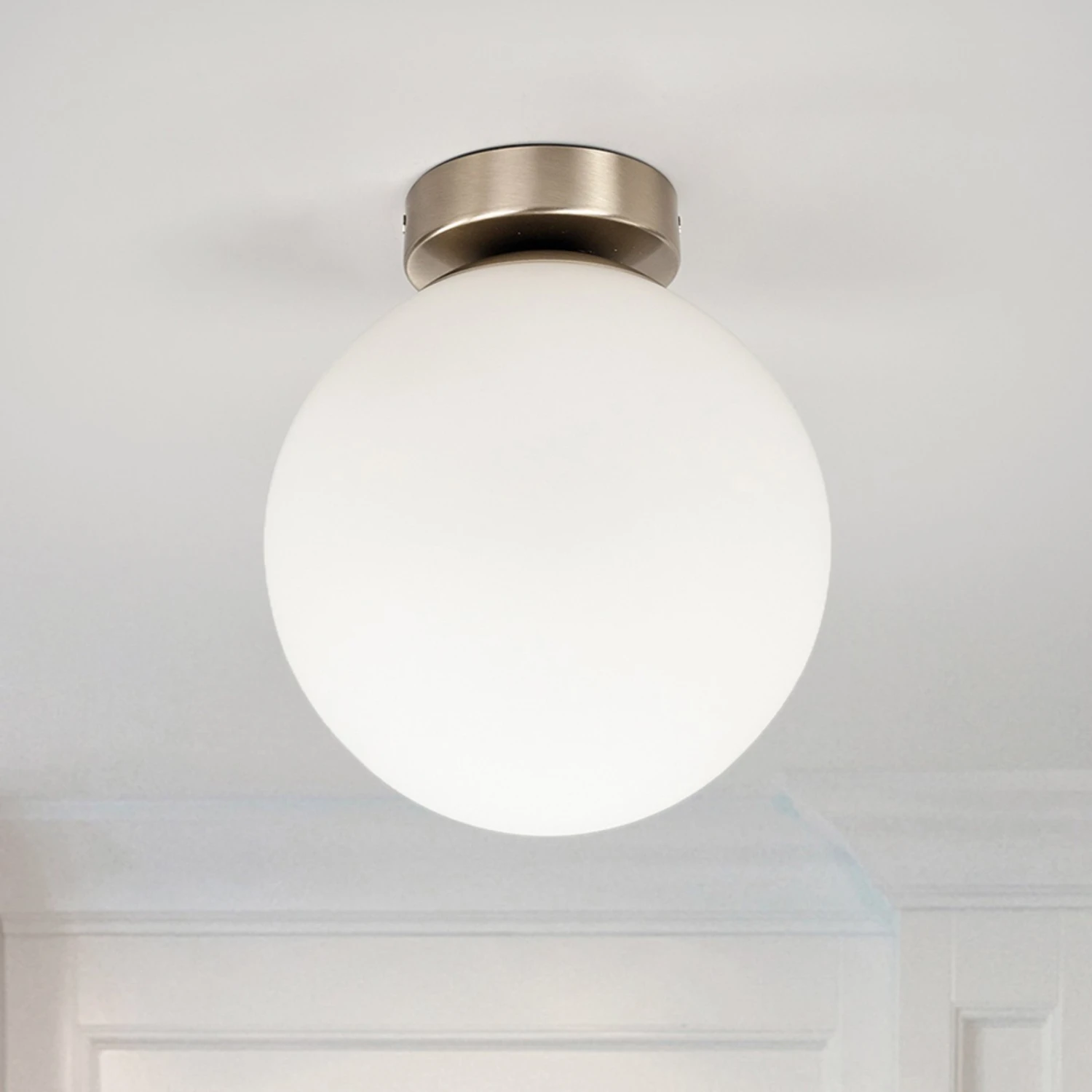 Die dezente Deckenhalterung von Lennie ist vernickelt, während der Rest der Deckenleuchte aus bauchigem Glas besteht, das mit seiner Kugelform sehr harmonisch aussieht. Die Badezimmer-Deckenleuchte ist für den Betrieb mit einer E27-Lampe gedacht und hier kann man ohne Weiteres auch auf die energieeffizienten und langlebigen Retrofit-Lampen mit LED-Bestückung zurückgreifen.