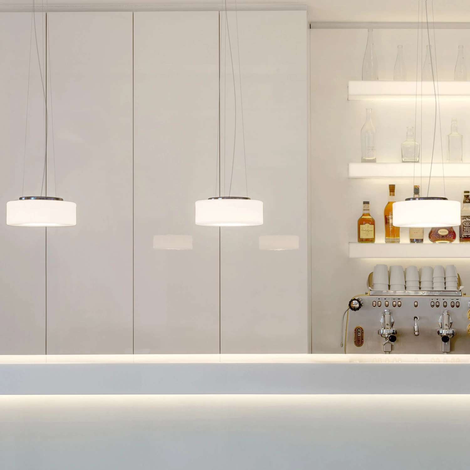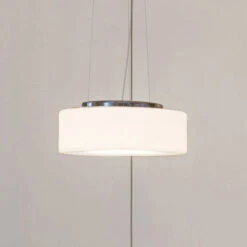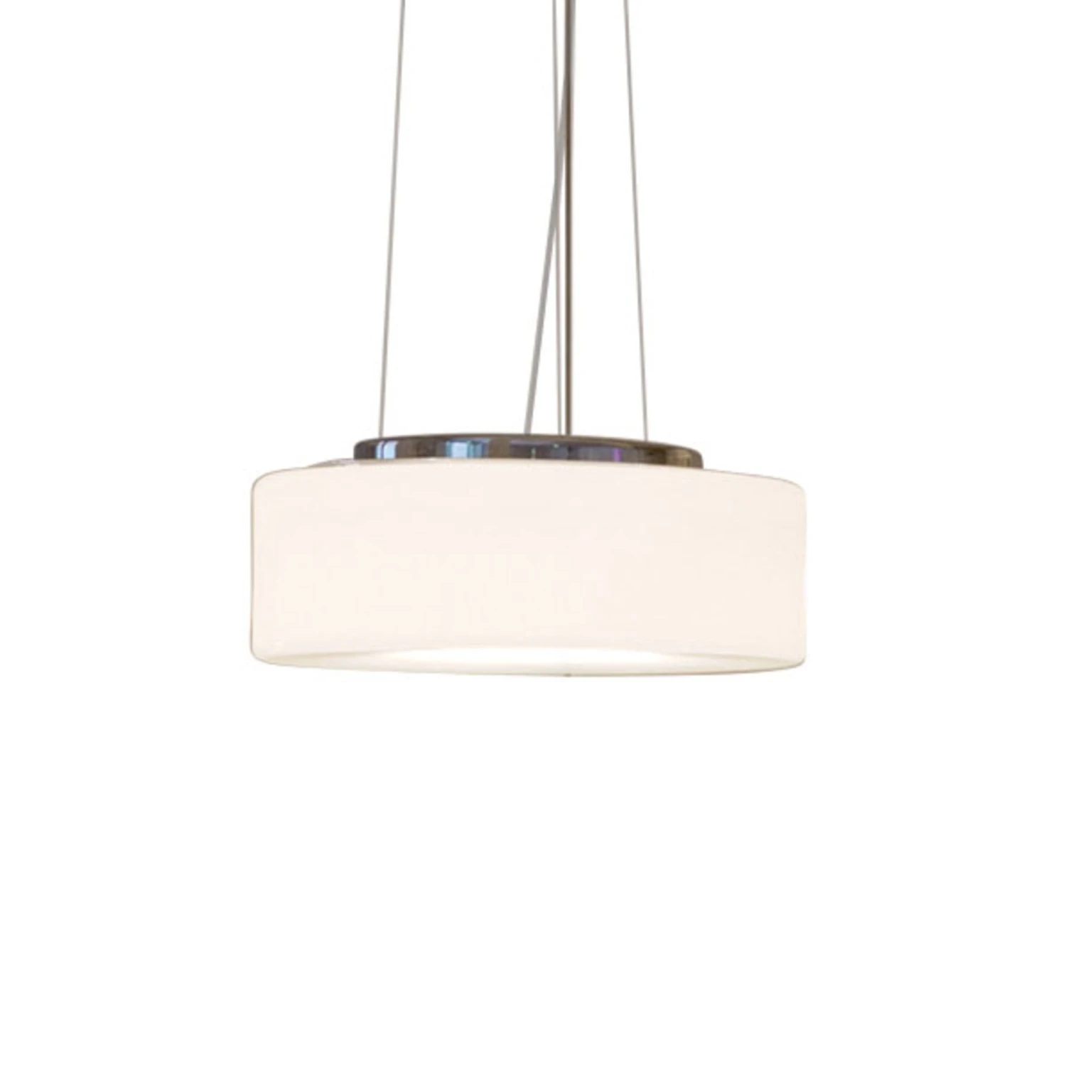 Der feine, klare Glaskörper in flacher Zylinderform ist mundgeblasen. Das Gehäuse der LED-Einheit besteht, ebenso wie der Baldachin, aus poliertem Aluminium. Die Aufhängung erfolgt mittels schlanker Stahlseile, deren Länge bei der Montage angepasst werden kann. Der Glasschirm ist zur Reinigung in der Spülmaschine geeignet; er lässt sich dank eines Bajonettverschlusses werkzeuglos abnehmen und befestigen. Die LED-Einheit kann bei Defekt oder am Ende der Lebensdauer ausgetauscht werden.