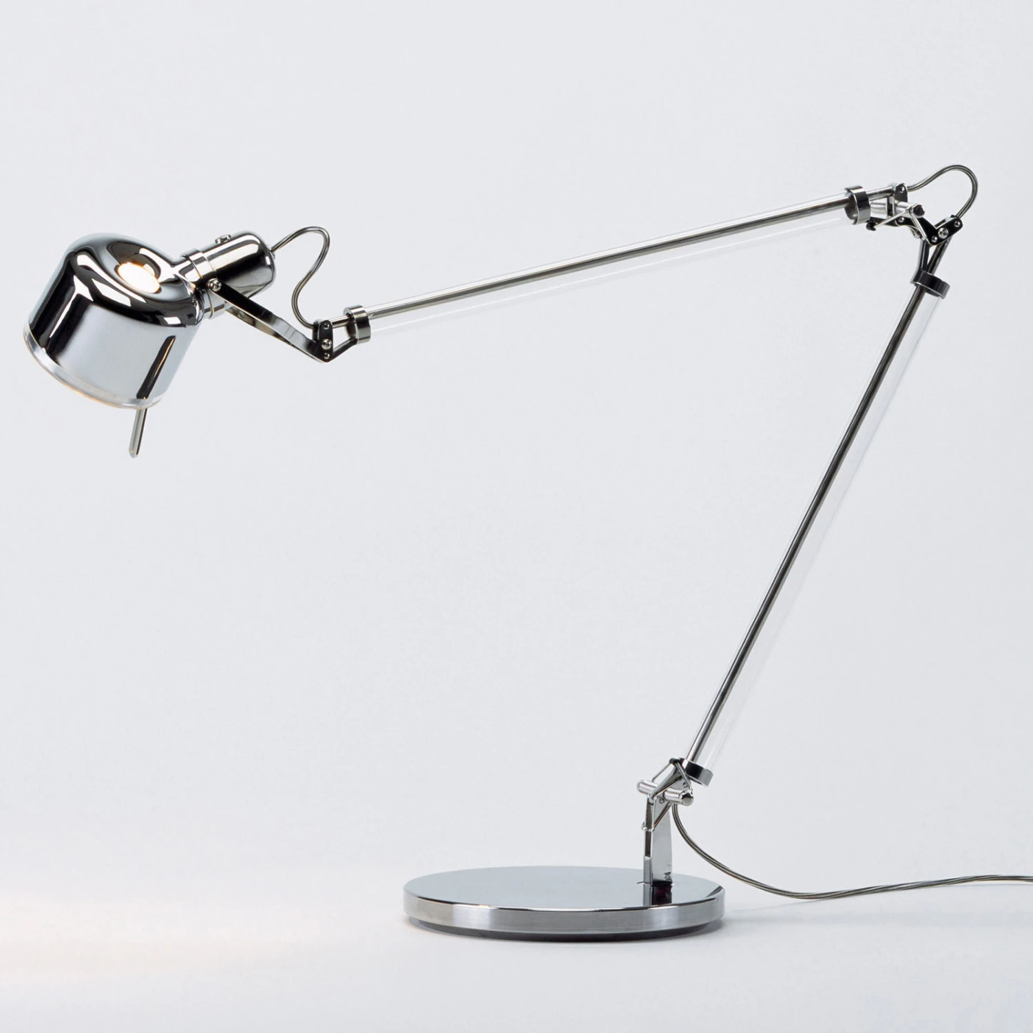 Job Table ist eine exklusive, aus hochwertigen Materialen gefertigte Variante der klassischen Schreibtischleuchte. Alle metallischen Abschnitte bestehen aus massivem, poliertem Edelstahl. Die Arme sind mit transparentem Borosilikatglas ummantelt, der Fuß der Leuchte ist an der Unterseite zum Schutz vor Kratzern auf den Möbeln mit Leder bezogen. Mehrere Gelenke machen die Leuchte flexibel in der Ausrichtung und Höhe, sodass die im zylindrischen Kopf eingesetzte E27-LED-Lampe stets den gewünschten Bereich erhellt.