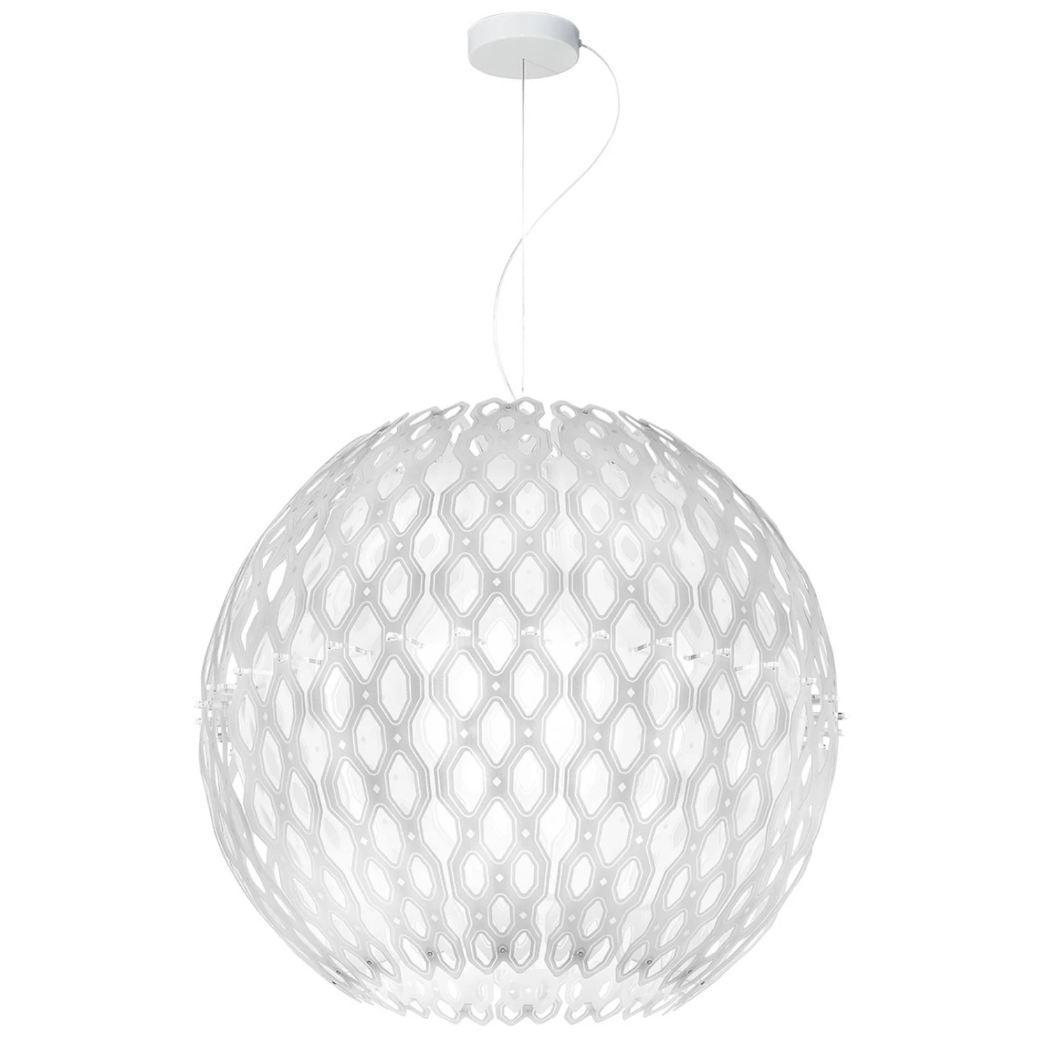Ein außergewöhnliches Design von zwei weißen, ineinander gesetzten Kugeln bestimmt das Aussehen der Hängeleuchte Charlotte Globe. Der äußere Schirm ist hergestellt aus Cristalflex® und die innere, streuende Konstruktion aus Lentiflex®. Die verwendete Magnethalterung ist typisch für den Hersteller. Das Designerduo Doriana und Massimiliano Fuksas haben der Leuchtkugel mit dem Wabenmuster aus konzentrischen Sechsecken eine zarte Opulenz verliehen, die den Raum ausfüllt. Die Hängeleuchte ist gänzlich in Weiß gestaltet und harmoniert perfekt mit zahlreichen Einrichtungsstilen.