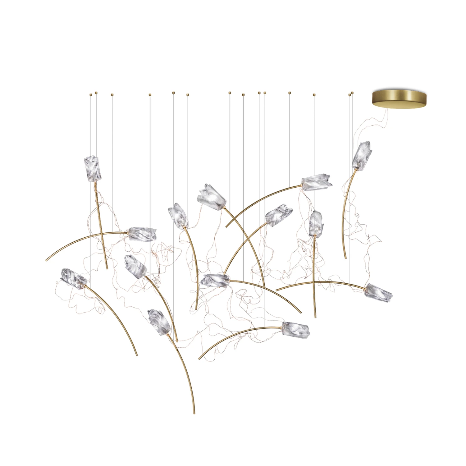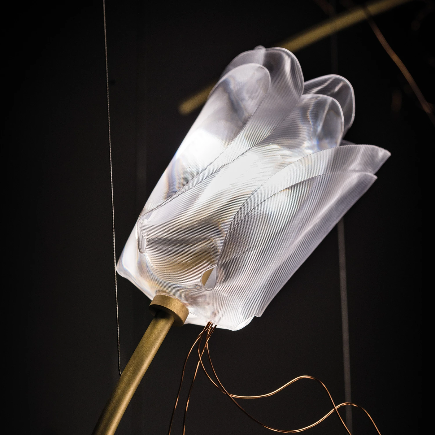 Das moderne und florale Design der Hängeleuchte Tulip Free-Standing erlaubt es, die Leuchte mit verschiedensten Wohn- und Einrichtungsstilen zu kombinieren. Die Tulip Free Standing besteht aus 14 Leuchten, deren Optik Tulpen nachempfunden ist. Die Blütenkronen sind aus dem von Slamp eigens entwickelten und patentieren Technopolymer Lentiflex® hergestellt und die „Stängel“ besehen aus gebürstetem Messing. Die Tulpen sind allesamt in einer geneigten Form gestaltet, mit der ein natürliches Aussehen nachgebildet wurde. Durch die dezentralen Aufhängungspunkte können die Positionen der einzelnen „Tulpen“ bei der Montage entsprechend angepasst werden. Die außergewöhnliche Leuchte kann sowohl in privaten Wohnräumen als auch in öffentlichen Umgebungen wie Hotels, Restaurants, Galerien und Museen als stilvolle Lichtquelle und Eyecatcher an der Decke Verwendung finden und zugleich als exklusives Dekorationselement mit luxuriösem Flair fungieren.