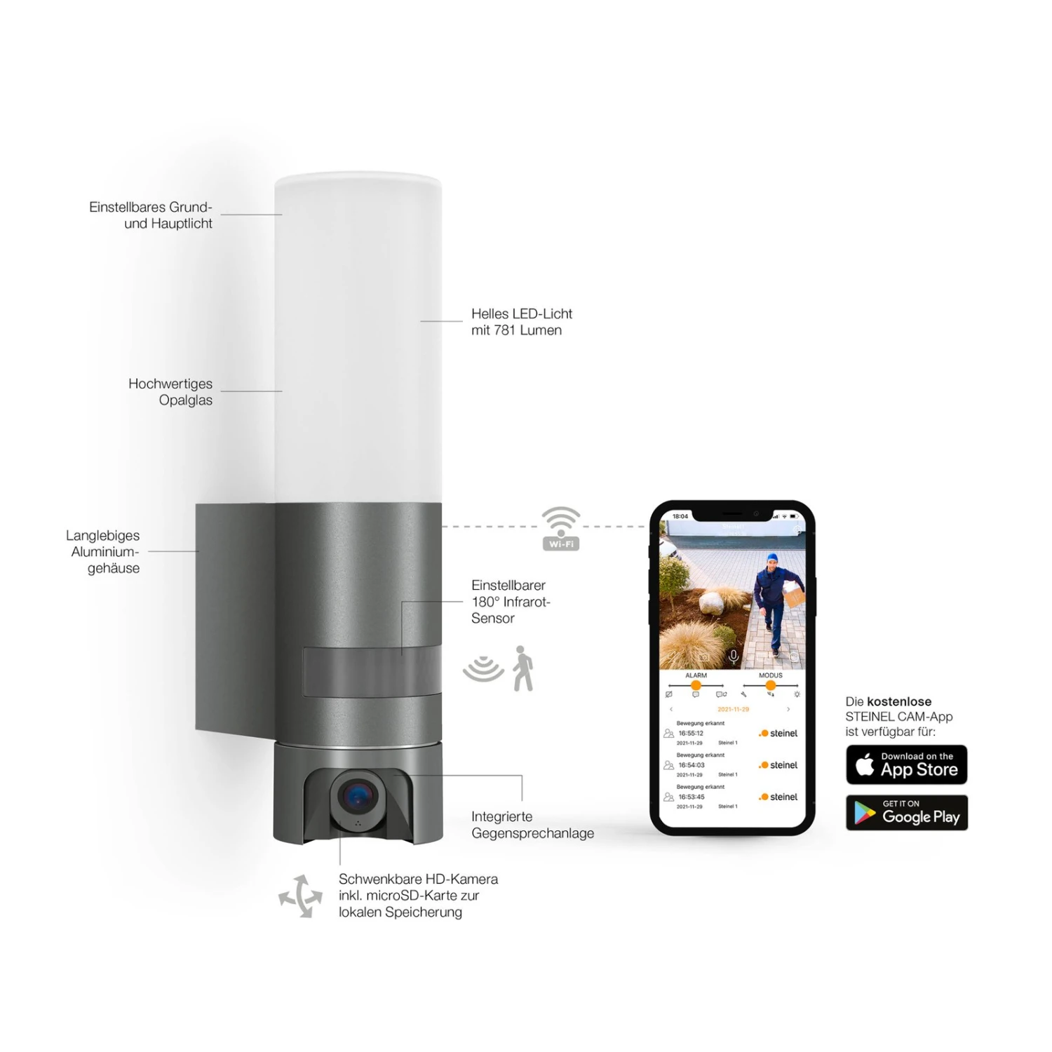 Ein weiteres Highlight bietet die integrierte Kamera, die über ein Smartphone oder Tablet via Steinel-App gesteuert werden kann. Auf Wunsch können Push-Benachrichtigungen an das Smartphone gesendet werden, sobald der Sensor eine Bewegung erfasst. Dies ermöglicht weiterhin die Nutzung der Gegensprechanlage und die Übertragung des Kamerabildes für eine audiovisuelle Türkommunikation. Die Bild- und Sprachdaten werden dabei über das WLAN übertragen. Die im Lieferumfang enthaltene Speicherkarte sorgt dafür, dass sämtliche Aufzeichnungen gespeichert werden und später noch abrufbar sind.